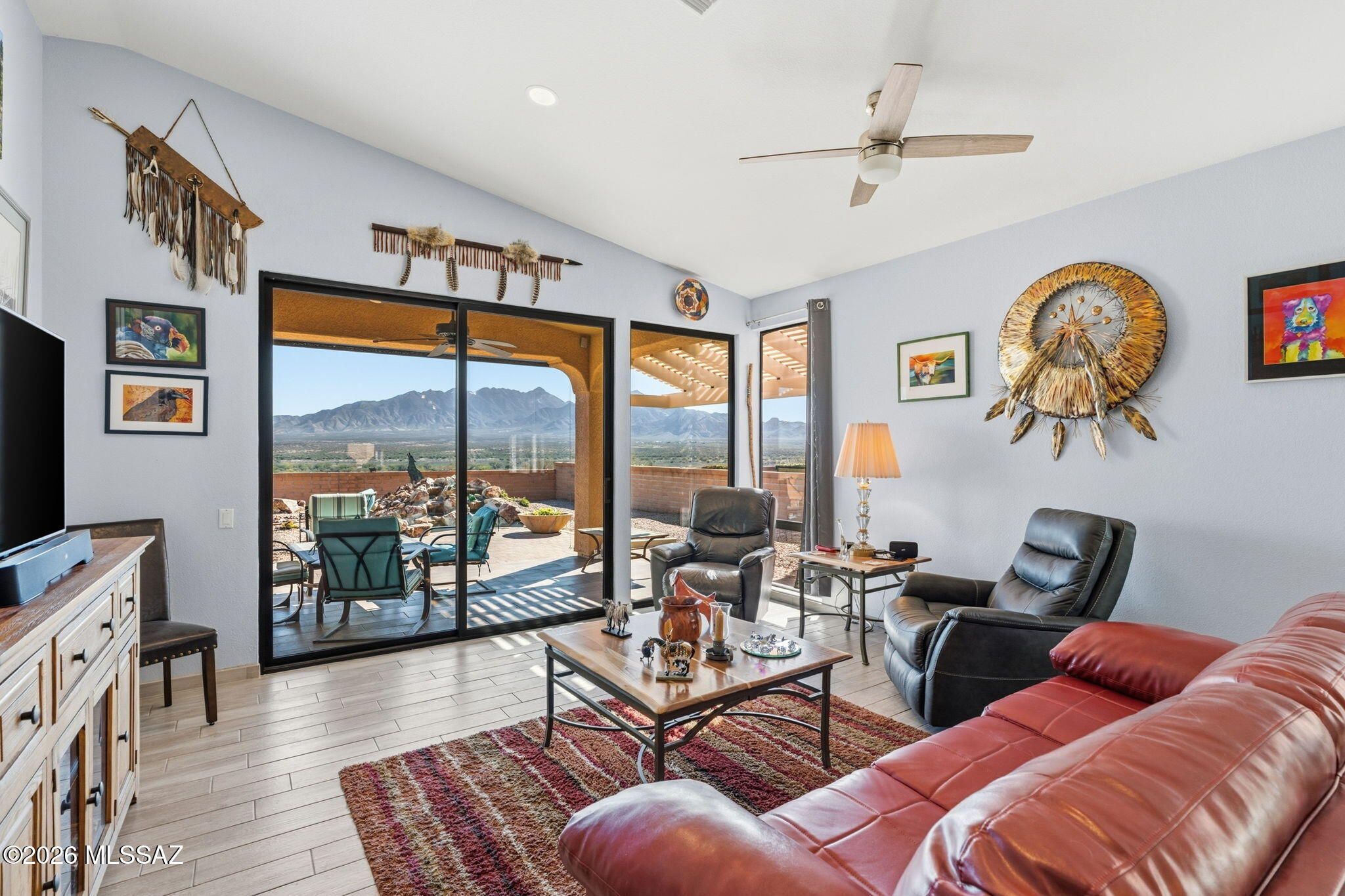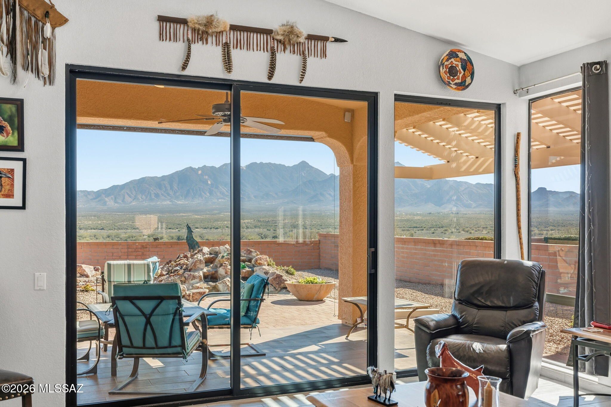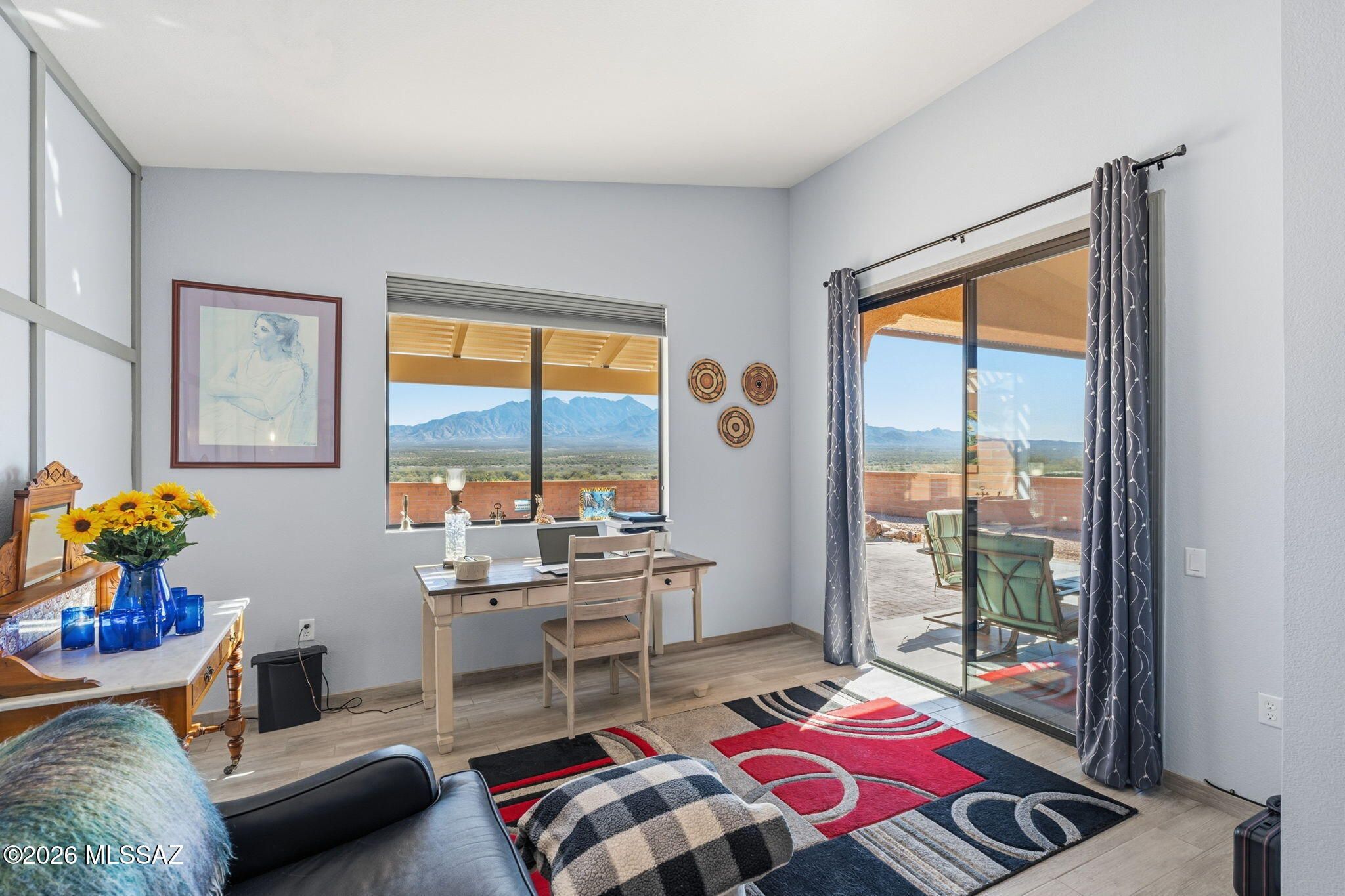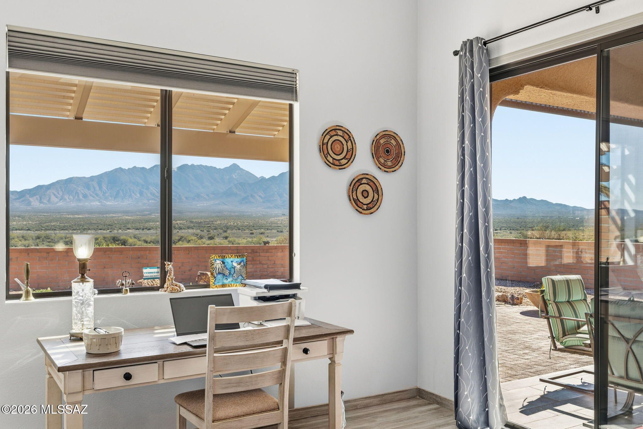Lovely views and a luxurious en-suite primary bathroom! If living in a prime development sounds appealing, then put this opportunity in San Ignacio Vistas at the top of your Green Valley tour list. This delightful 2-bedroom, 2-bathroom South Western home offers an array of advantages. Enjoy spectacular mountain views. Across the threshold, nice touches embrace you with a stately entryway, an open layout, stylish fixtures blending seamlessly with bounteous window light, neutral decor, and vaulted ceilings. The spacious, thoughtfully designed kitchen brims with natural light, fresh updates, granite counters, and ample pantry space. The kitchen opens seamlessly onto the dining room, living room, and patio. The peaceful primary bedroom includes sitting space and an attached office. Must See.