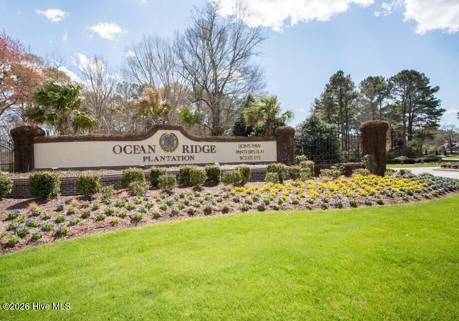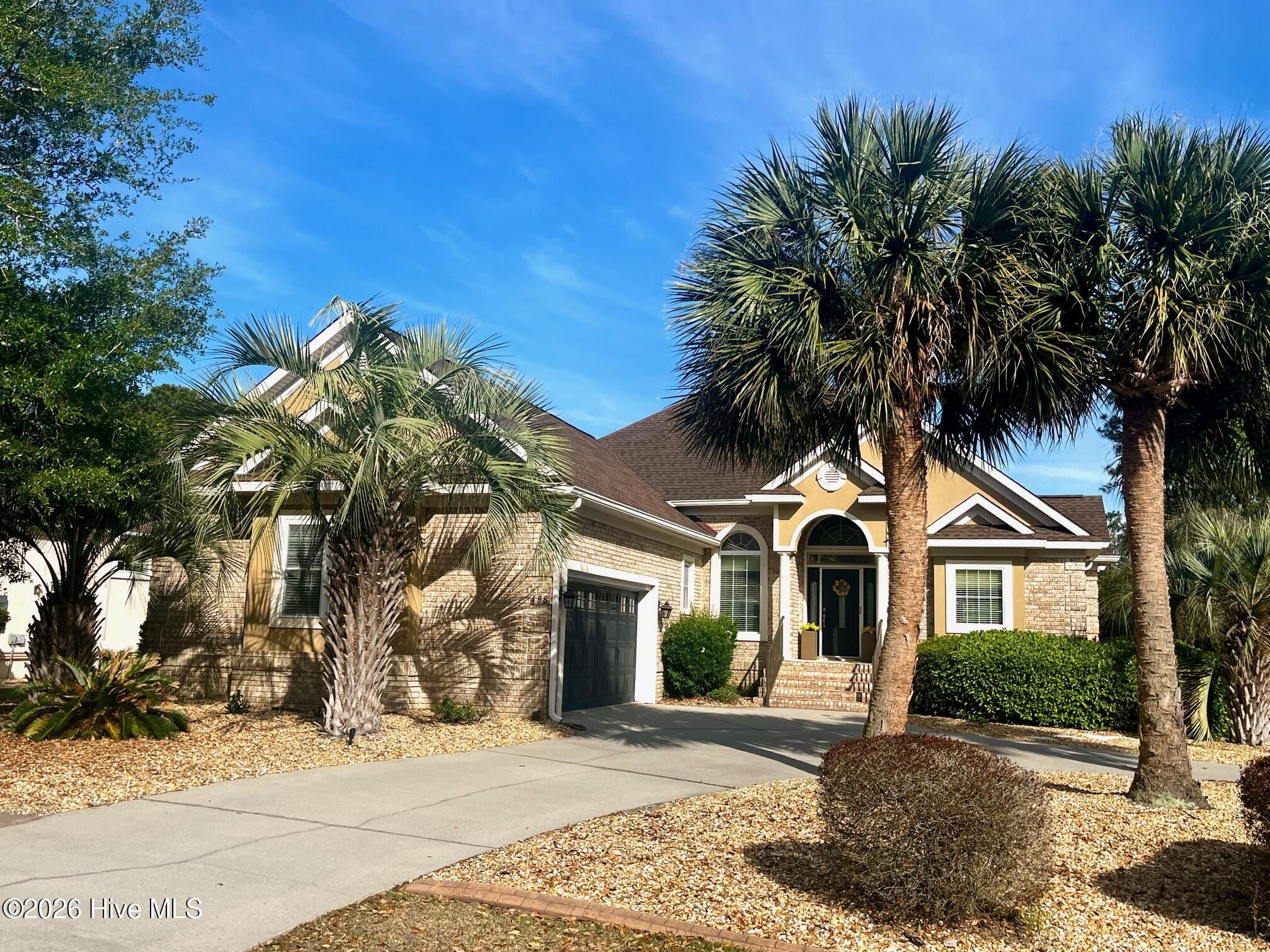 Welcome to this custom-built, one-level brick home located in the prestigious and amenity-rich community of Ocean Ridge Plantation. Large backyard offers mature landscaping and includes elegant palm trees, oaks, and a large stamped concrete patio for outdoor relaxation and entertainment while enjoying the pond and golf views. Once you enter inside you will be welcomed by elegant designed open floor plan with 12-foot ceilings, wide plank oak floors, recessed lighting, tiled entry, crown moldings, and exquisite details that provide timeless sophistication and create a warm and inviting atmosphere throughout. To your left is a formal dining room with a trey ceiling and stately columns. The living room is bright with a wall of windows to capture the incredible views. The spacious kitchen has granite countertops and plenty of cabinets accompanied by a large island. Just beside the kitchen is a sunroom and or enormous breakfast nook with many windows. The split floor plan provides the primary suite with its own wing! The primary bedroom is a true retreat, offering a spacious suite with luxurious finishes and an large walk-in closet with built ins, crown molding and recessed lighting providing ample storage. Master bathroom provides double sinks, granite countertops, tile floors, huge tiled stand up shower, bathtub, crown moldings and white cabinetry. On the opposite side of the master bedroom are two guest's bedrooms and a full bath, which give a lot of room you need for the family or visiting guests. The laundry room has built in cabinets. An expansive 2-car garage has a lot or storage with many cabinets for your projects or yard tools. Every detail in this home has been carefully crafted, making it a perfect sanctuary in a premier coastal community. The amazing amenities of Ocean Ridge Plantation offer an indoor pool, outdoor pools, four golf courses, clubhouses, fitness center, walking trails, pickle ball and tennis courts, garden club, and an oceanfront beach house in Sunset Beach. Ocean Ridge has it all and is conveniently close to Myrtle Beach, S.C. and Wilmington, N.C.