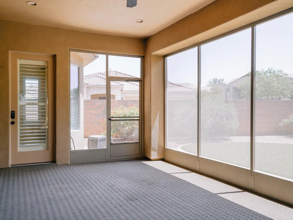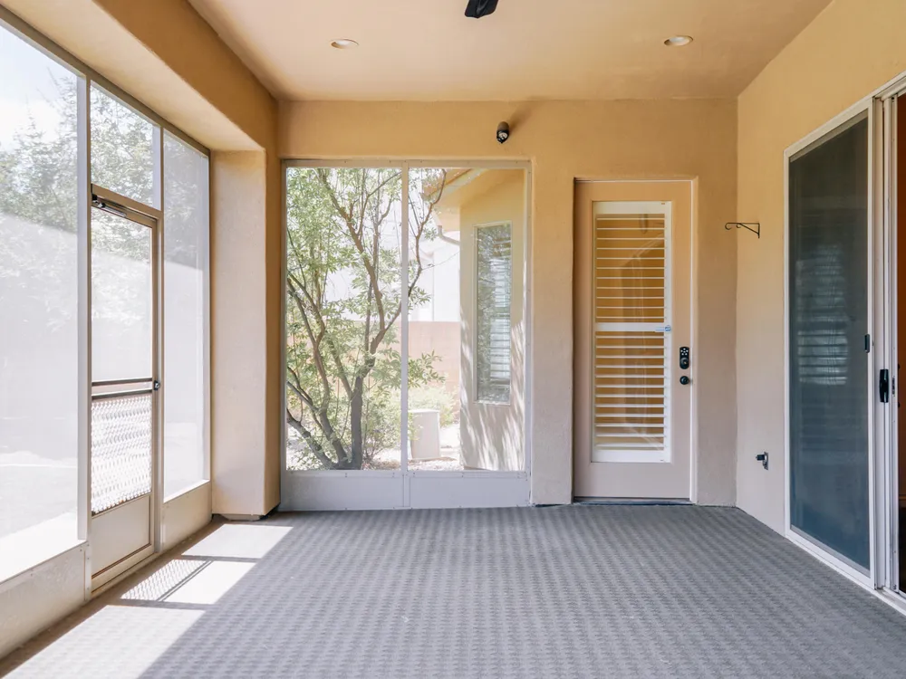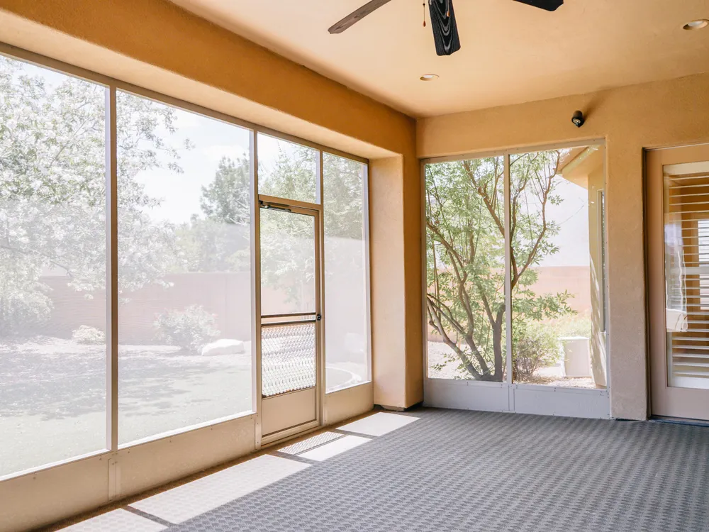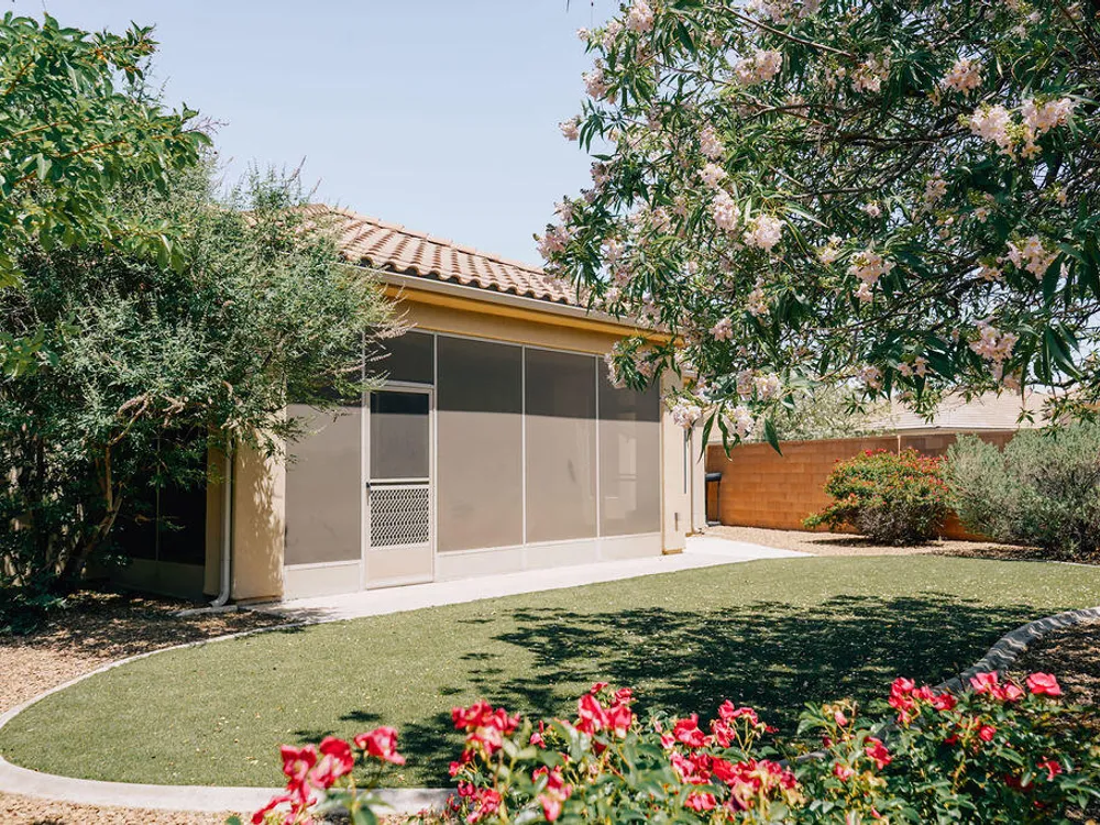 This stunning home offers two full master suites with walk-in closets and walk-in showers—one featuring a custom makeup station. A dedicated office and third full bathroom provide extra flexibility and comfort. The heart of the home is the beautiful fully enclosed screen patio, filled with natural light and opening to a beautiful backyard—perfect for relaxing or entertaining. Enjoy tall ceilings, plantation shutters throughout, an open layout, and a sleek epoxy-coated garage floor. Located in SunRiver, the area's top 55+ community with luxury amenities and an unbeatable lifestyle. Agent is related to seller.