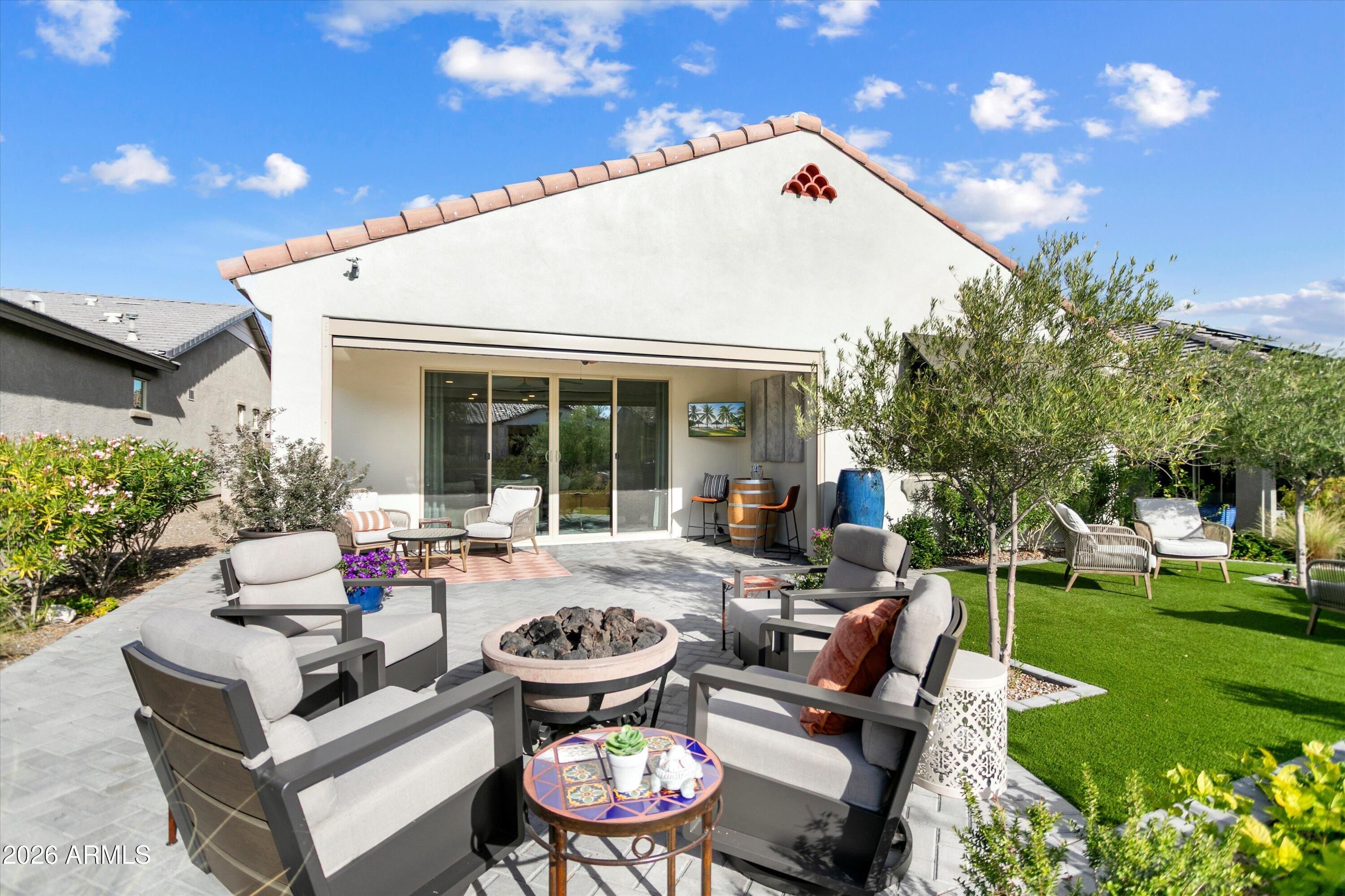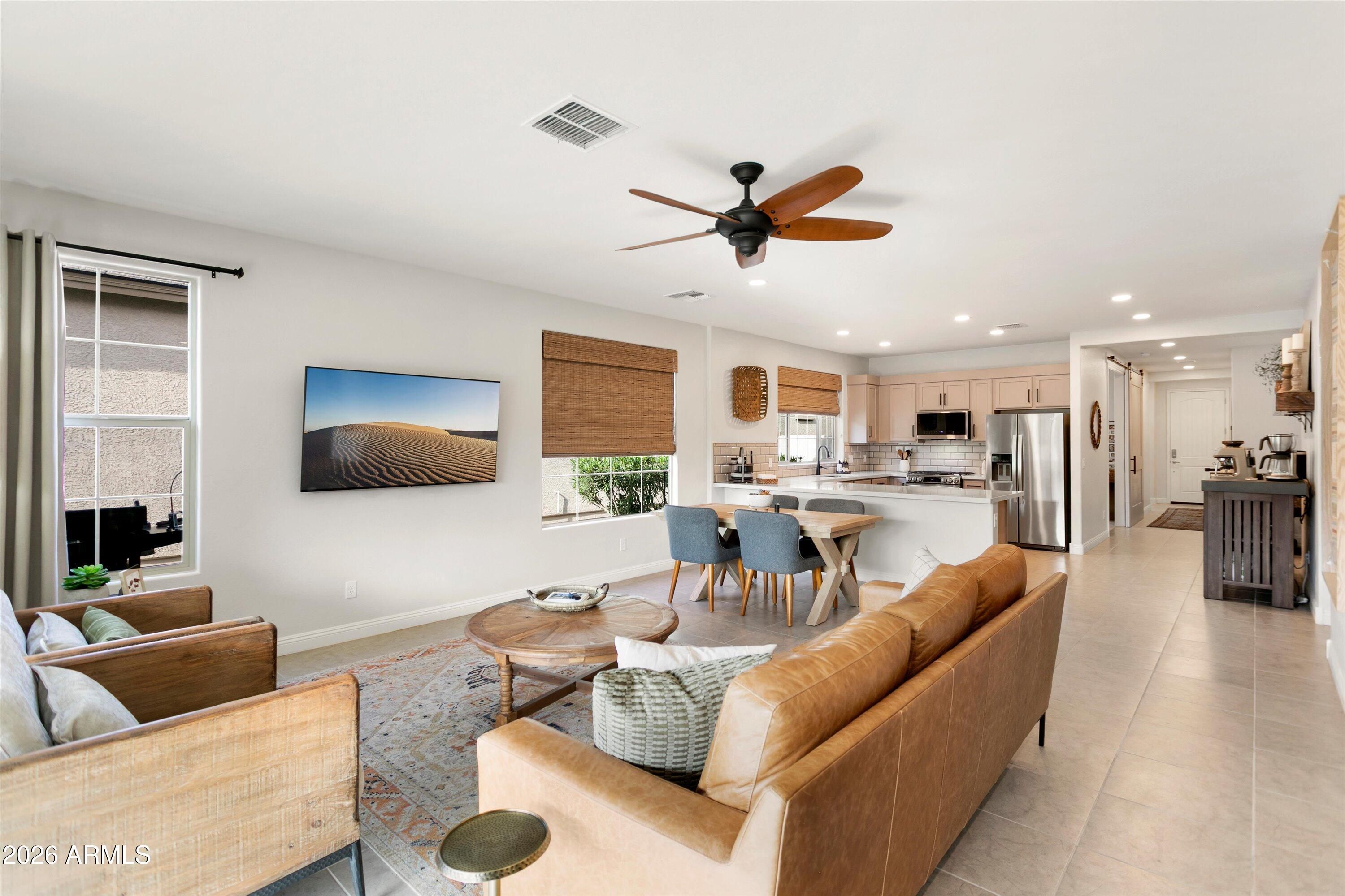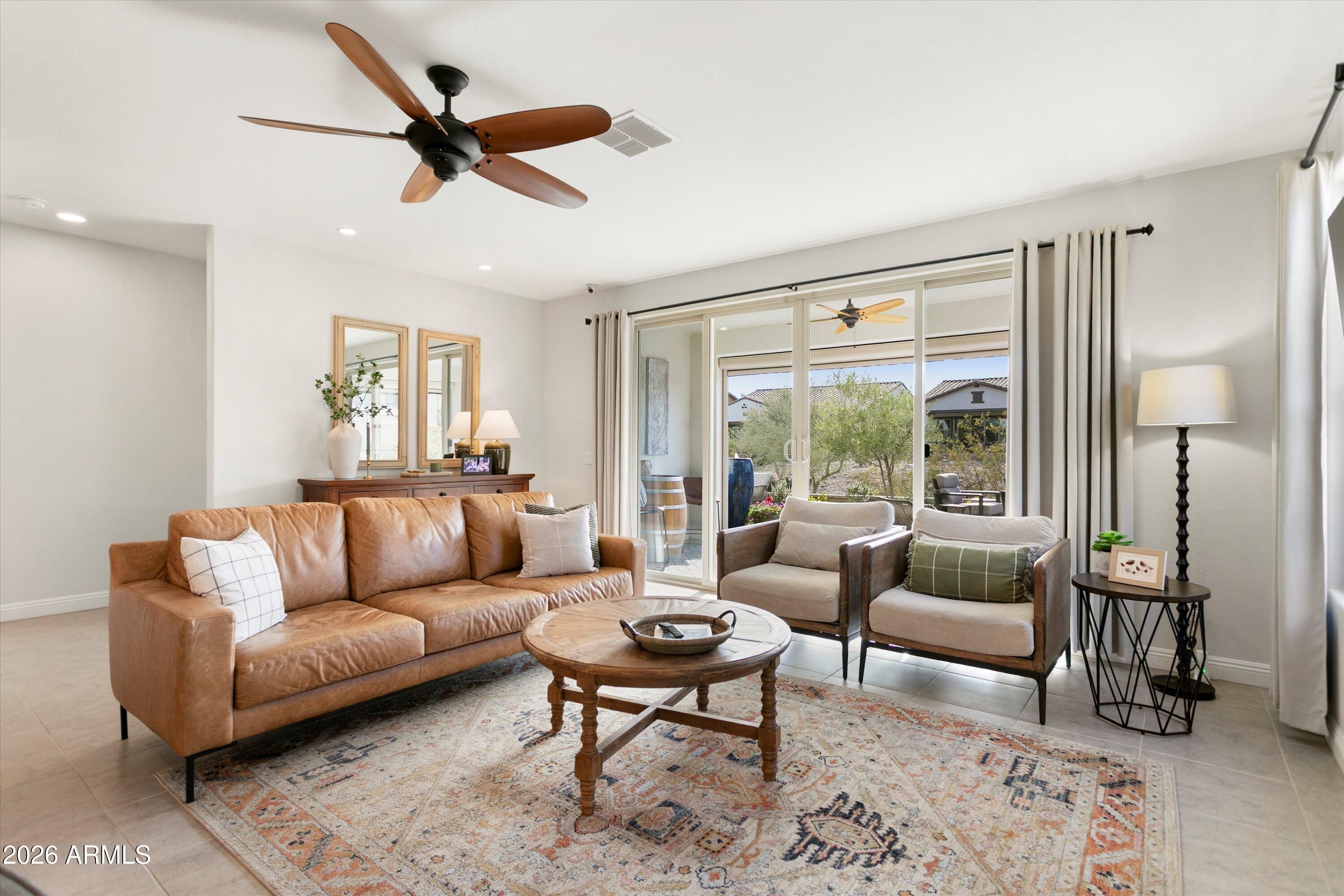 MOUNTAIN VIEWS. ELEVATED 55+ LUXURY LIVING. This exceptional Inspire floorplan offers the perfect blend of comfort, sophistication, and effortless desert elegance, ideally located within the prestigious active adult community of Victory at Verrado. Thoughtfully enhanced with numerous upgrades and designer finishes, this home showcases custom accent walls in the hall, mudroom, and laundry, along with a stylish dry bar complete with a wine fridge--creating a refined, modern atmosphere throughout. The beautifully designed wraparound kitchen is the heart of the home, featuring striking granite countertops, upgraded cabinetry, and premium appliances, making it ideal for both everyday living and seamless entertaining. Step outside to the covered back patio, where roll-down screens provide comfort and privacy while extending your living space year-round. The expanded patio backs to a scenic trail illuminated by elegant Bullard lighting, offering breathtaking views of the majestic White Tank Mountains. This serene outdoor setting delivers unforgettable Arizona sunsets and creates the perfect environment for quiet evenings or memorable gatherings under the stars. This is more than a home--it's a lifestyle defined by beauty, comfort, and inspiration.