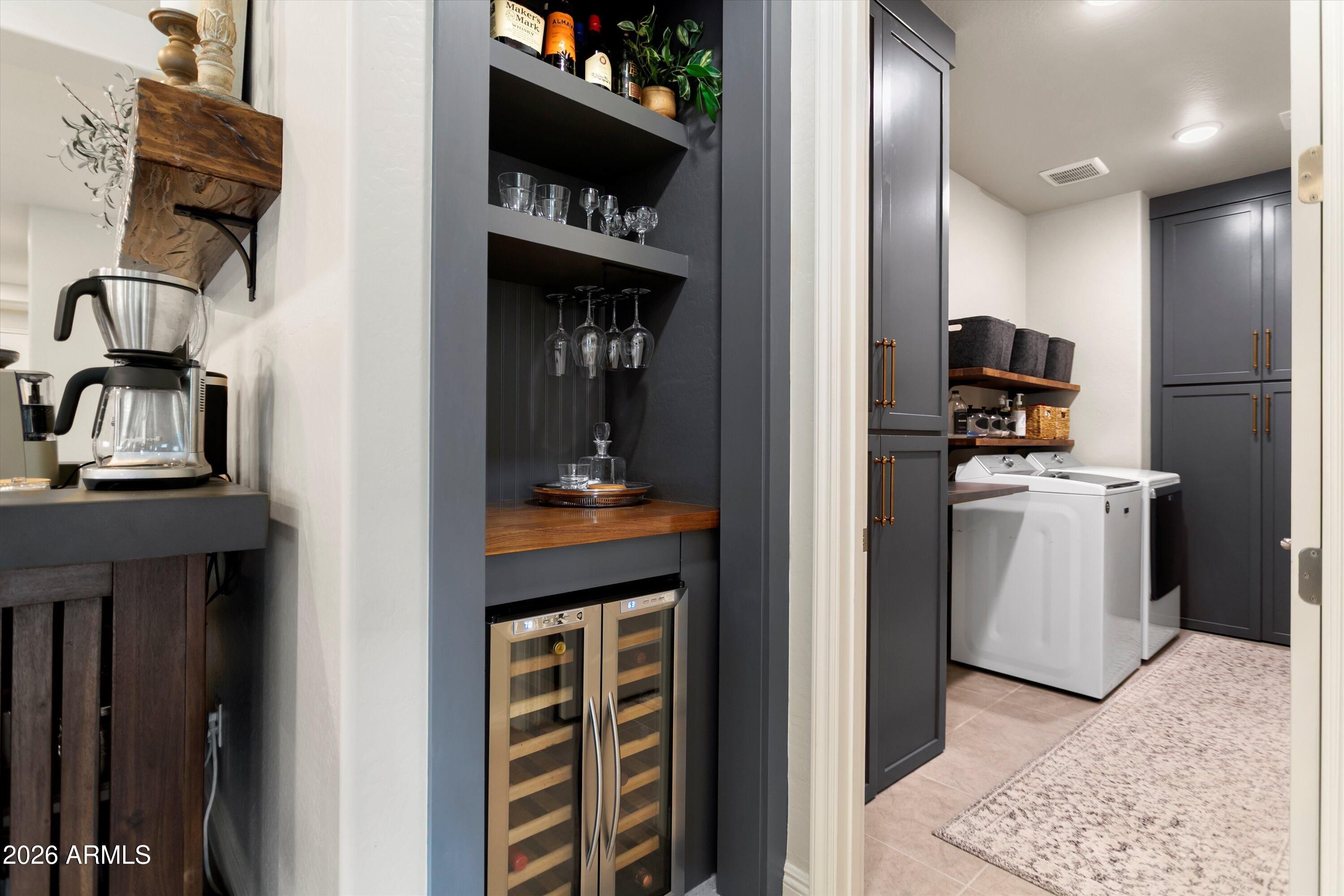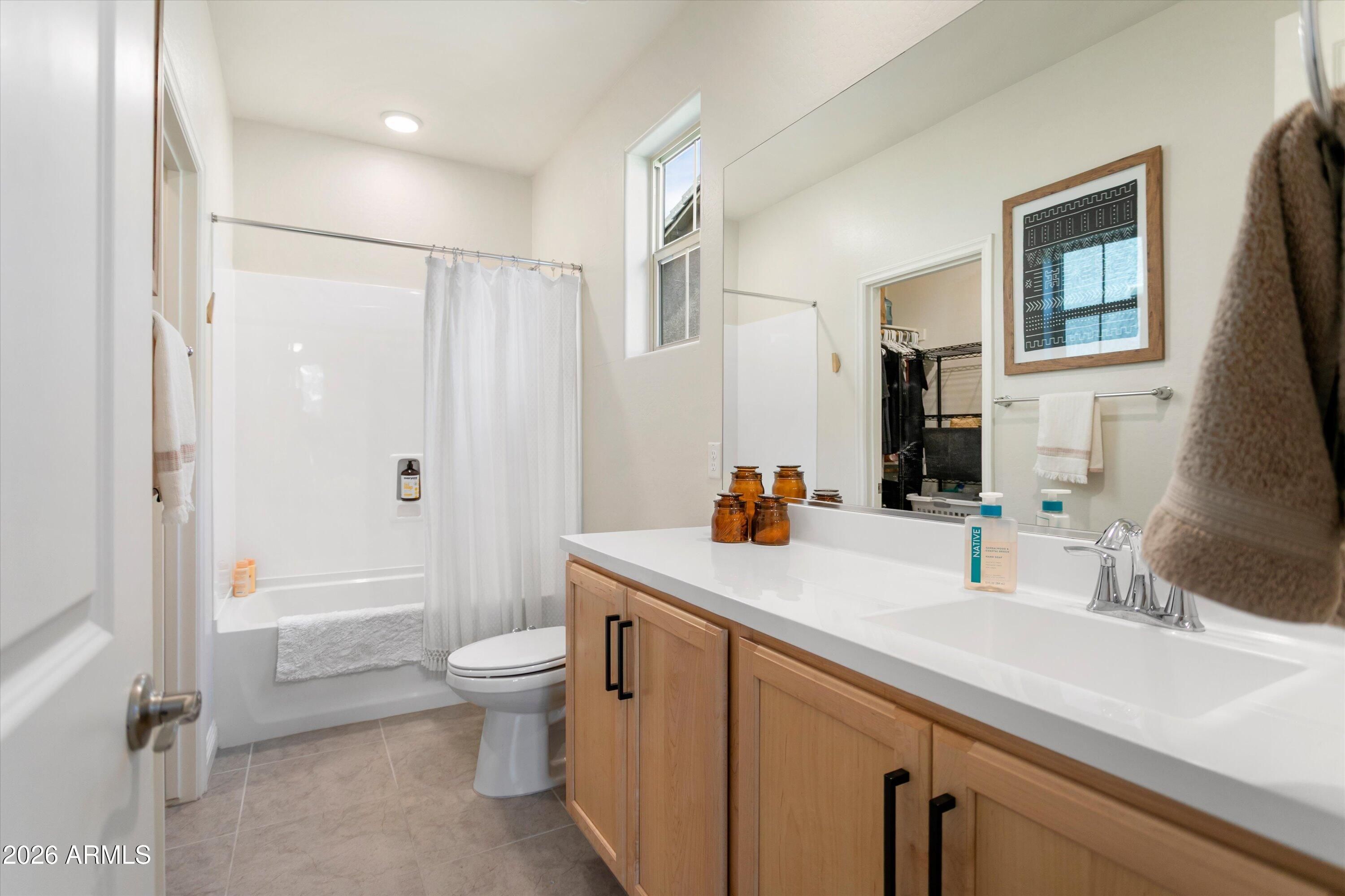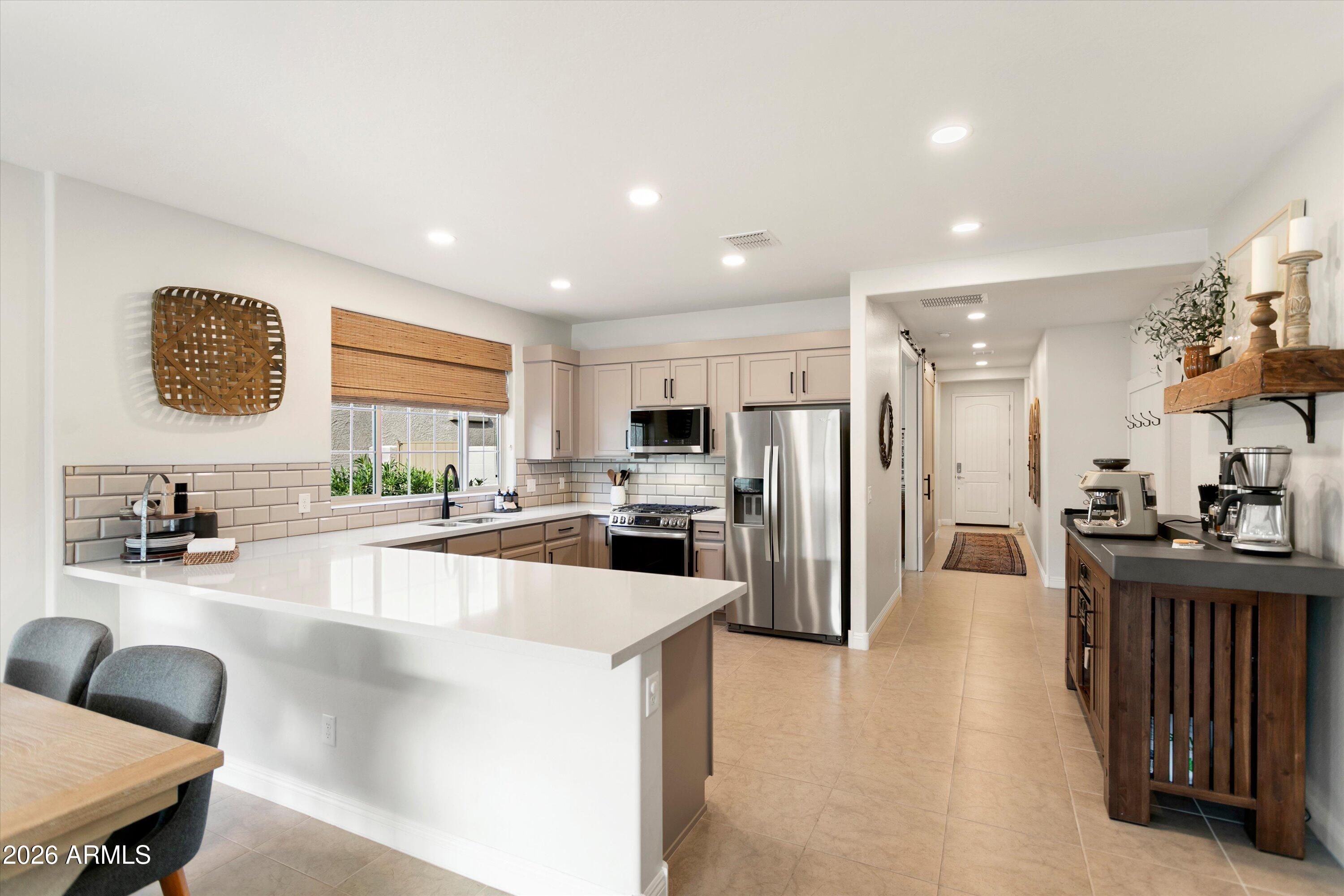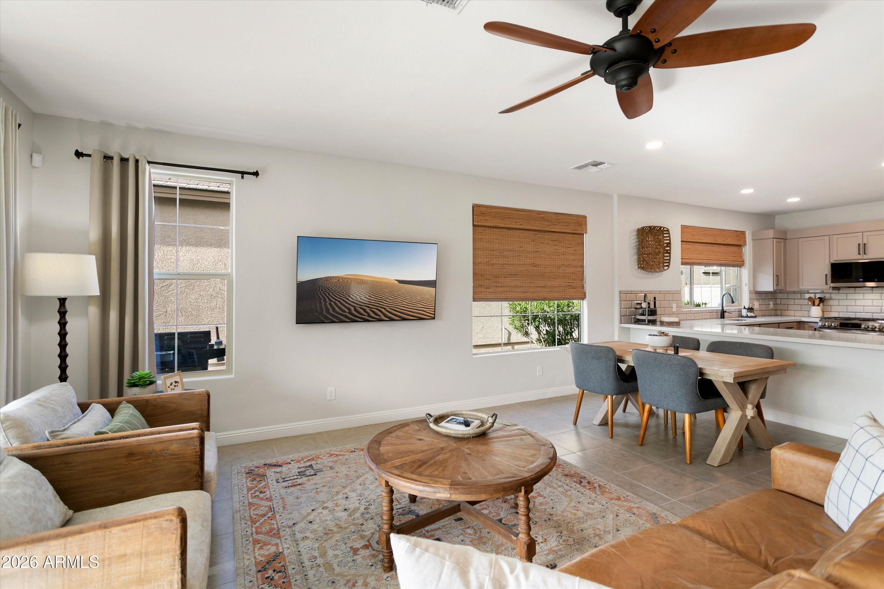 MOUNTAIN VIEWS. ELEVATED 55+ LUXURY LIVING. This exceptional Inspire floorplan offers the perfect blend of comfort, sophistication, and effortless desert elegance, ideally located within the prestigious active adult community of Victory at Verrado. Thoughtfully enhanced with numerous upgrades and designer finishes, this home showcases custom accent walls in the hall, mudroom, and laundry, along with a stylish dry bar complete with a wine fridge--creating a refined, modern atmosphere throughout. The beautifully designed wraparound kitchen is the heart of the home, featuring striking granite countertops, upgraded cabinetry, and premium appliances, making it ideal for both everyday living and seamless entertaining. Step outside to the covered back patio, where roll-down screens provide comfort and privacy while extending your living space year-round. The expanded patio backs to a scenic trail illuminated by elegant Bullard lighting, offering breathtaking views of the majestic White Tank Mountains. This serene outdoor setting delivers unforgettable Arizona sunsets and creates the perfect environment for quiet evenings or memorable gatherings under the stars. This is more than a home--it's a lifestyle defined by beauty, comfort, and inspiration.
