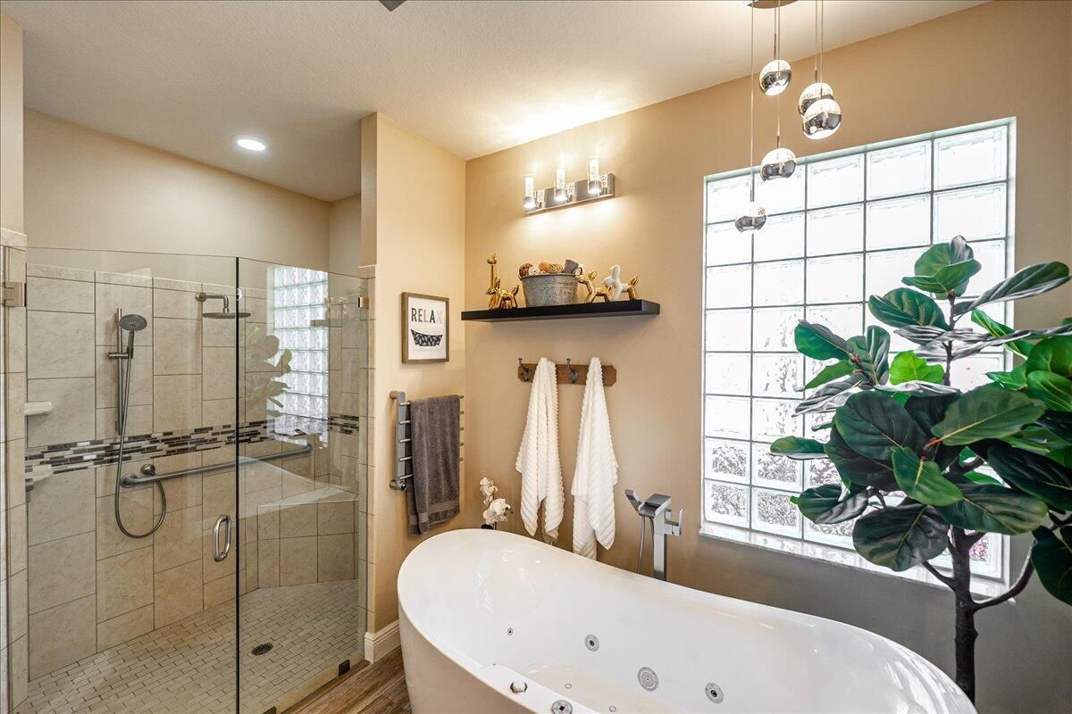 - Cathedral Ceiling(s), Pantry, Vaulted Ceiling(s), Walk-In Closet(s), Split Bedrooms, Impact Glass, Separate/Formal Dining Room, Dual Sinks, Main Level Primary, Separate Shower, Soaking Tub, Tub Shower