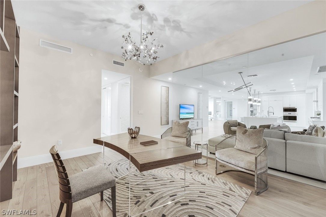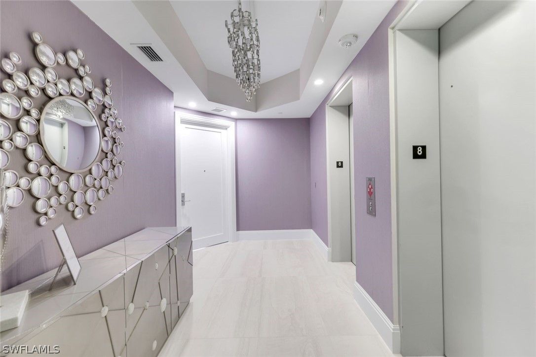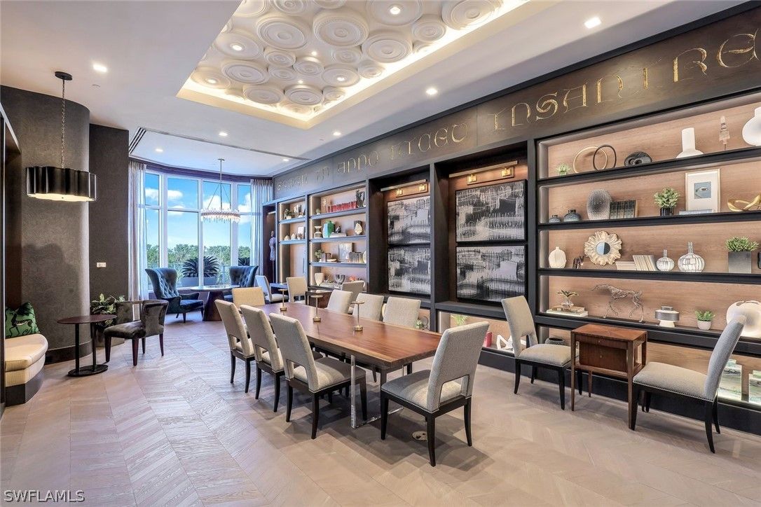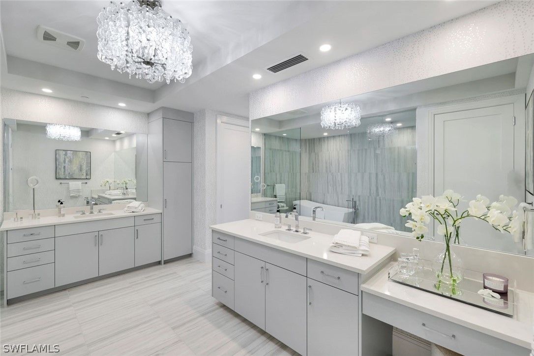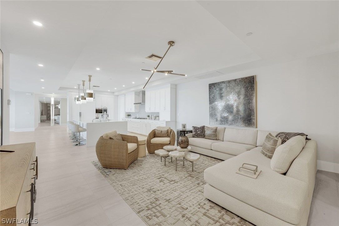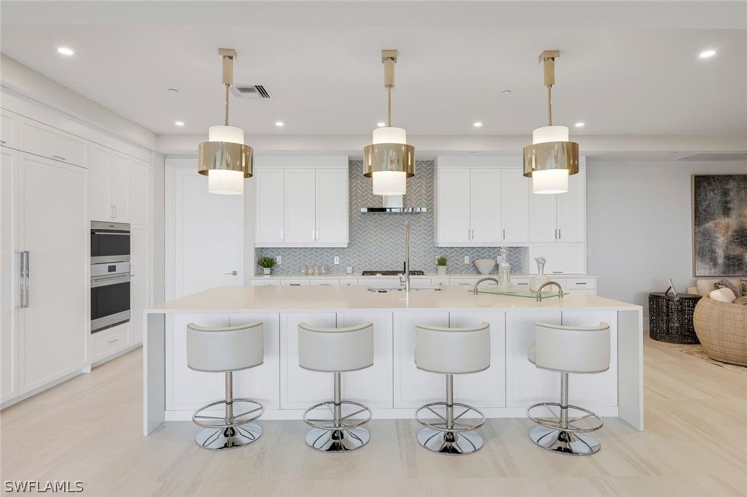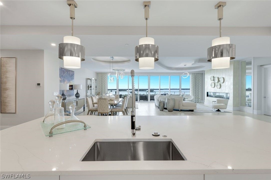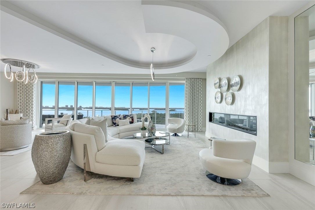 An exceptional standard of luxury living in one of Bonita Bay’s most prestigious addresses. Introducing an extraordinary, never-lived-in custom Robb & Stucky furnished model that exemplifies refined luxury living in Omega at Bonita Bay. Encompassing 4,210 square feet of impeccably curated interiors, this remarkable residence offers an unparalleled blend of sophistication, comfort, and panoramic beauty. From the moment of arrival, a sense of exclusivity unfolds as your private elevator opens to a personal foyer, setting the stage for the dramatic open-concept design beyond. Soaring 10-foot-4-inch ceilings, designer lighting, and elegant flooring frame walls of floor-to-ceiling glass that flood the home with natural light and showcase breathtaking 78-foot-wide vistas of the Gulf, bay, and golf course. The expansive living area is anchored by a sleek fireplace and seamlessly transitions into a spectacular terrace complete with an outdoor kitchen—perfect for sunset dining and elevated entertaining against sweeping western skies. At the heart of the home, the gourmet kitchen is a statement of both beauty and performance, featuring Wolf and Sub-Zero appliances, white Irpinia cabinetry, quartz countertops, and an oversized center island designed for gathering. A sophisticated glass partition subtly separates the den and office, maintaining openness while adding architectural interest and flexibility. The thoughtfully designed layout includes three luxurious bedroom suites, each offering its own captivating view, private ensuite bath, and walk-in closet. The primary retreat is a sanctuary of comfort, complemented by spa-inspired finishes, a soaking tub, an expansive walk-in shower, and dual vanities designed for indulgent daily living. A total of three and a half beautifully appointed bathrooms ensure comfort for both residents and guests. Impact-resistant glass, meticulous craftsmanship, and over $250,000 in designer upgrades elevate the residence even further. Completing this rare offering is a private three-car garage—one of only six within Omega—an exceptional feature in high-rise luxury living. Residents of Omega enjoy white-glove amenities including 24-hour staff, a resort-style pool and spa, an elegant gathering room, a state-of-the-art fitness center overlooking the golf course and lake. Residents of Bonita Bay enjoy an unmatched lifestyle with access to a private beach club, kayaking and canoeing, pickleball and tennis, multiple parks, and more than 12 miles of walking and biking paths. Golf enthusiasts will appreciate five championship courses, along with multiple dining venues, a state-of-the-art fitness center, and a full-service marina (club membership required). Ideally located just minutes from world-class dining, shopping, beaches, and nature preserves, with easy access to Downtown Bonita Springs, Downtown Naples, and RSW International Airport, this residence offers the perfect balance of luxury, convenience, and coastal living.