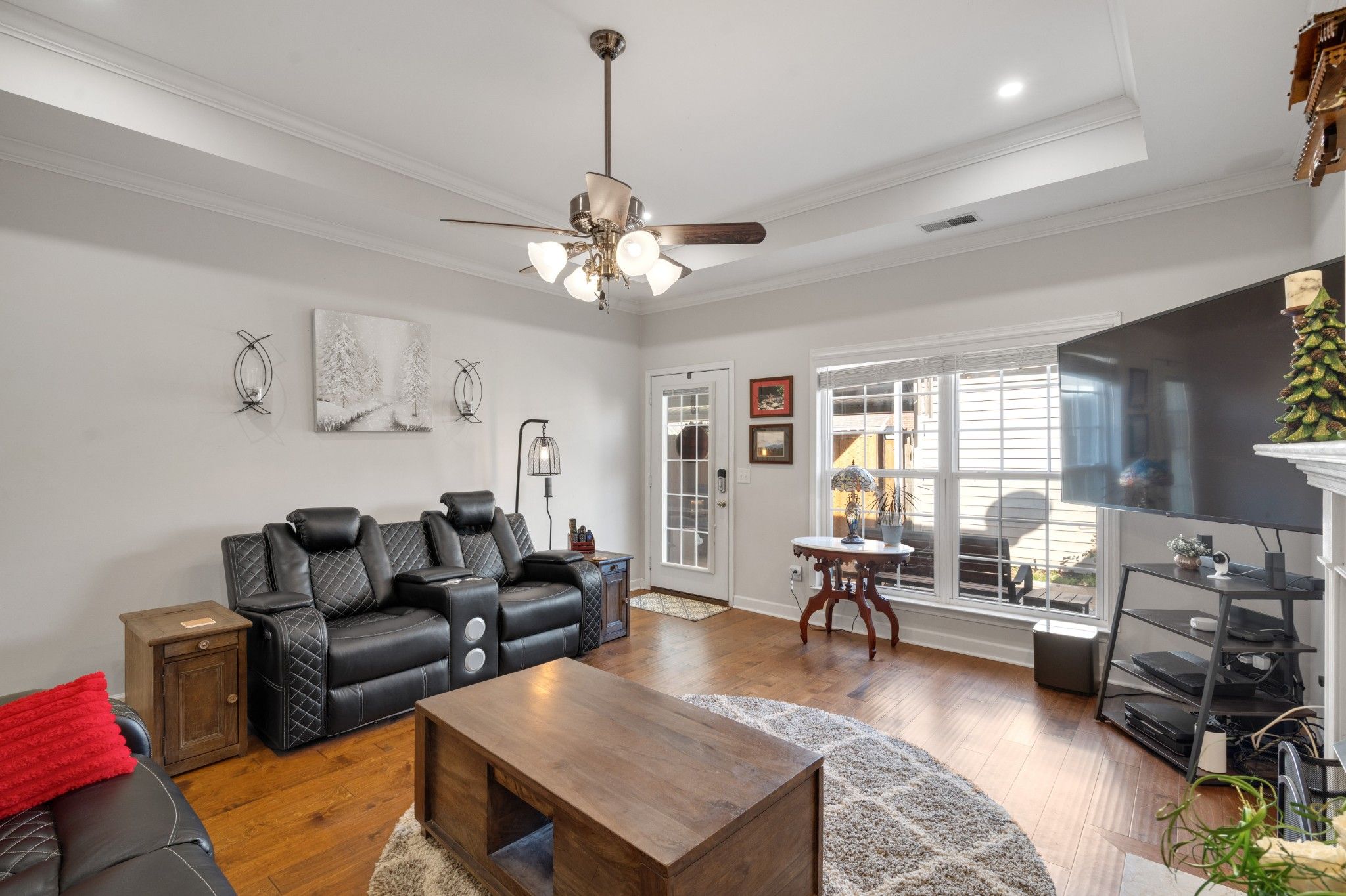 Come enjoy your new friends and home at Highly Desirable Academy Place, Lebanon's gated 50+ community. Enjoy sidewalks for your morning walks, 2 covered parking spaces, privacy fenced covered patio, and plenty of guest parking! Take a walk to the pool & clubhouse in this pet-friendly gated community. The HOA covers mowing, insurance, outside pest control, pool, club house and trash pickup. This home was custom built with no steps, tray ceilings, hardwood floors & tiled floors in the bathrooms. This Kendall floor plan offers 2 bedrooms and 2 full bathrooms all on one level. The huge primary bedroom offers his & her closets with custom storage buildouts in 2025. The ensuite offers a large remodeled tile and glass separate shower, soaking jacuzzi tub and quartz double vanity in 2021. The kitchen was completely remodeled in 2018 offering a pantry, granite counter tops and tall custom cabinets with soft close and under cabinet lighting in 2021. All new appliances in 2018. 5 inch Dark Birch hardwood floors through out the home installed in 2023. Your den has a traditional gas fireplace with new screen and logs in 2020. The dining room is perfect for entertaining right off the kitchen. This home brand new blinds and every wall plug and light switch has been replaced for a fresh look in 2024. HVAC replaced in 2023, Roof is covered in HOA and new water heater in 2013. You will enjoy having a fenced private courtyard and ex-large storage under your double carport. The guest bedroom TV & refrigerator to remain. Academy Place was built to have close proximity to Don Fox Community Park, Dog Park, Nashville STAR commuter train, Jimmy Floyd Family Center, Lebanon's wonderful Senior Center, Historic Lebanon town square, Vanderbilt Wilson Co hospital, restaurants, boutique shopping & Much More. This property is move In Ready and Low maintenance living at its finest. Only 30 minutes to Nashville Airport. Schedule your private tour today.