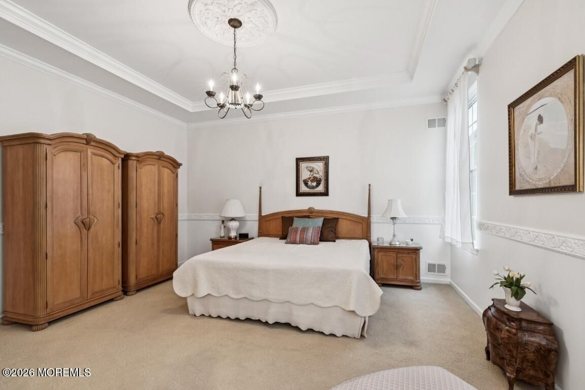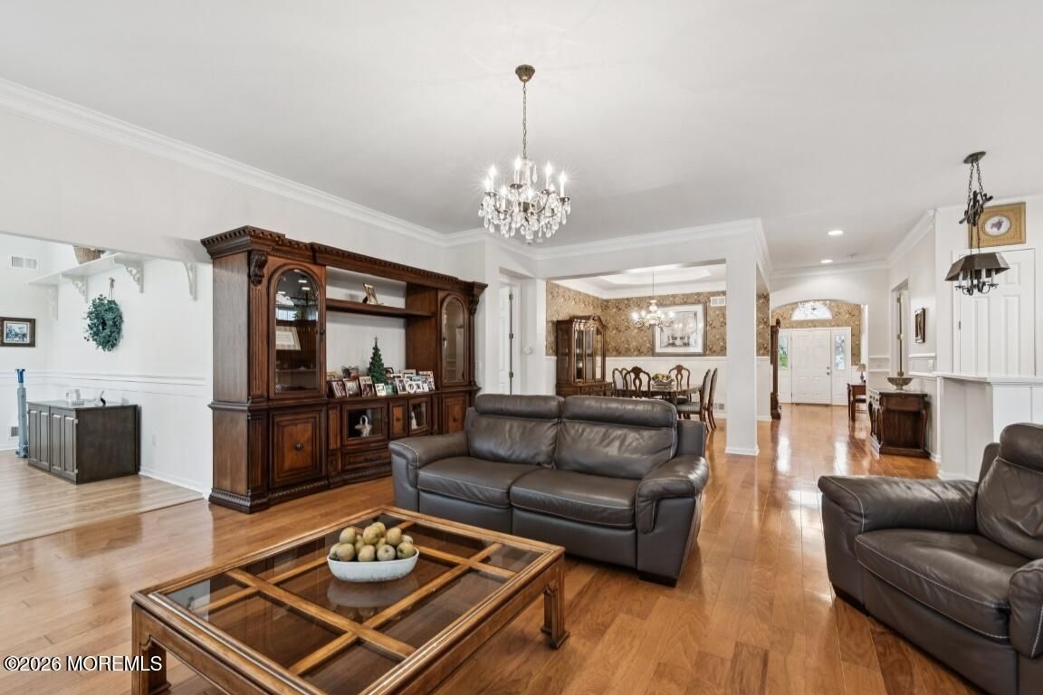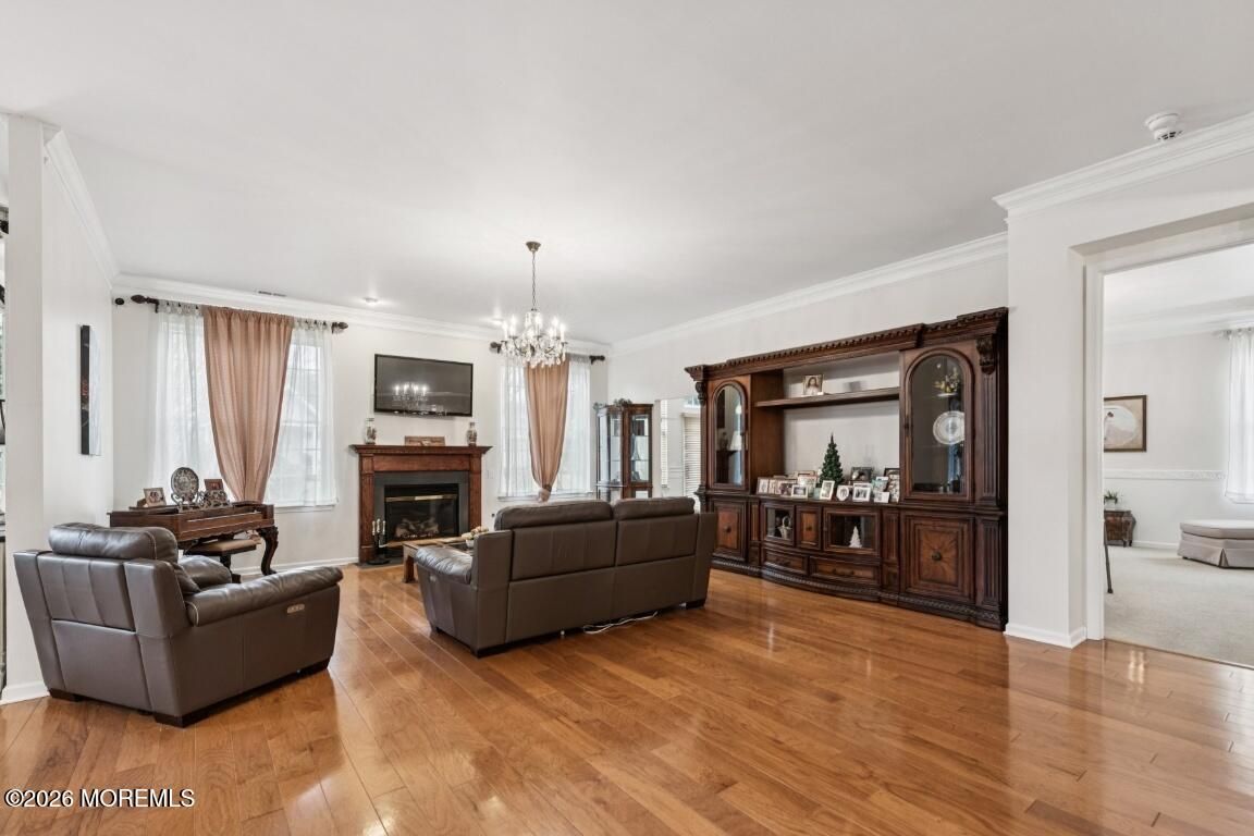 Prestigious Riviera at Freehold, Gated Active Adult Age 48+ Community by Toll Brothers. Ranch Bayhill Expanded Model w a premium lot on a Cul De Sac. Open floor concept with 10 ft ceilings throughout. Crown moldings, custom window dressings included. Den currently used as a 3rd bedroom. Gourmet Kitchen w 42 inch cabinets and corian countertops. Extended breakfast area w sliding doors leading to paver patio. Extended Master suite w sitting area oversized closet and soaking tub. Extended family room w gas fireplace. Hardwood floors and recessed lights throughout. Custom cabinets in laundry room, and security system. Amenities include, clubhouse, outdoor pool w hot tub, tennis court, exercise room, bocci court, and shuffle board. Beautiful fountains throughout development.