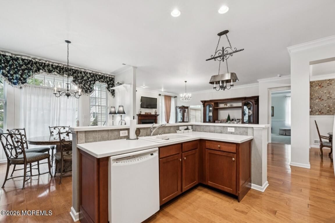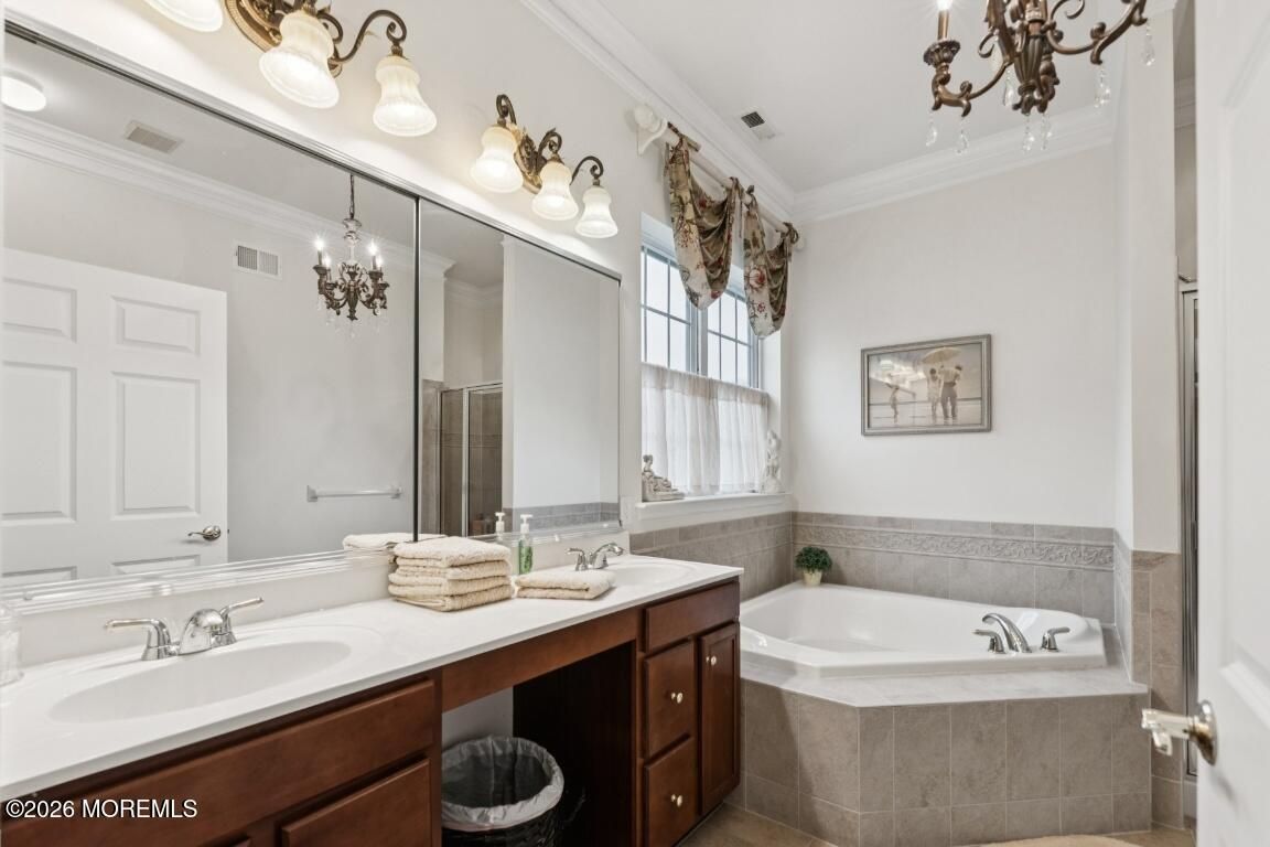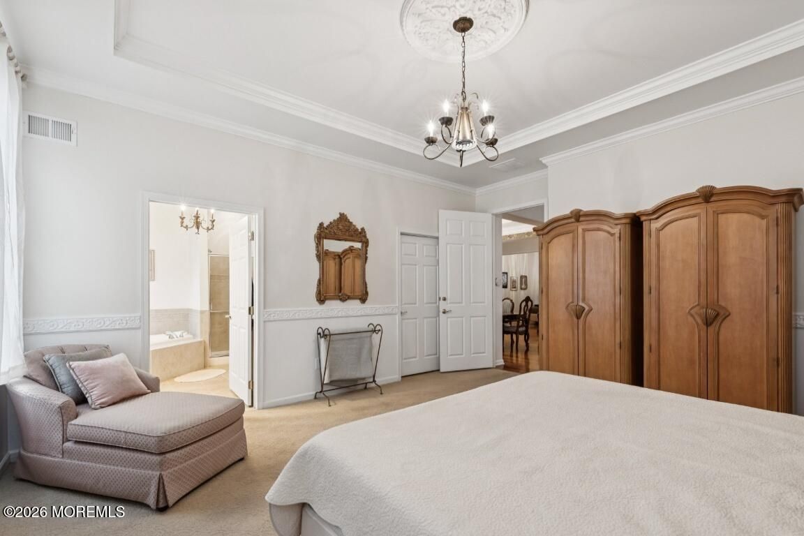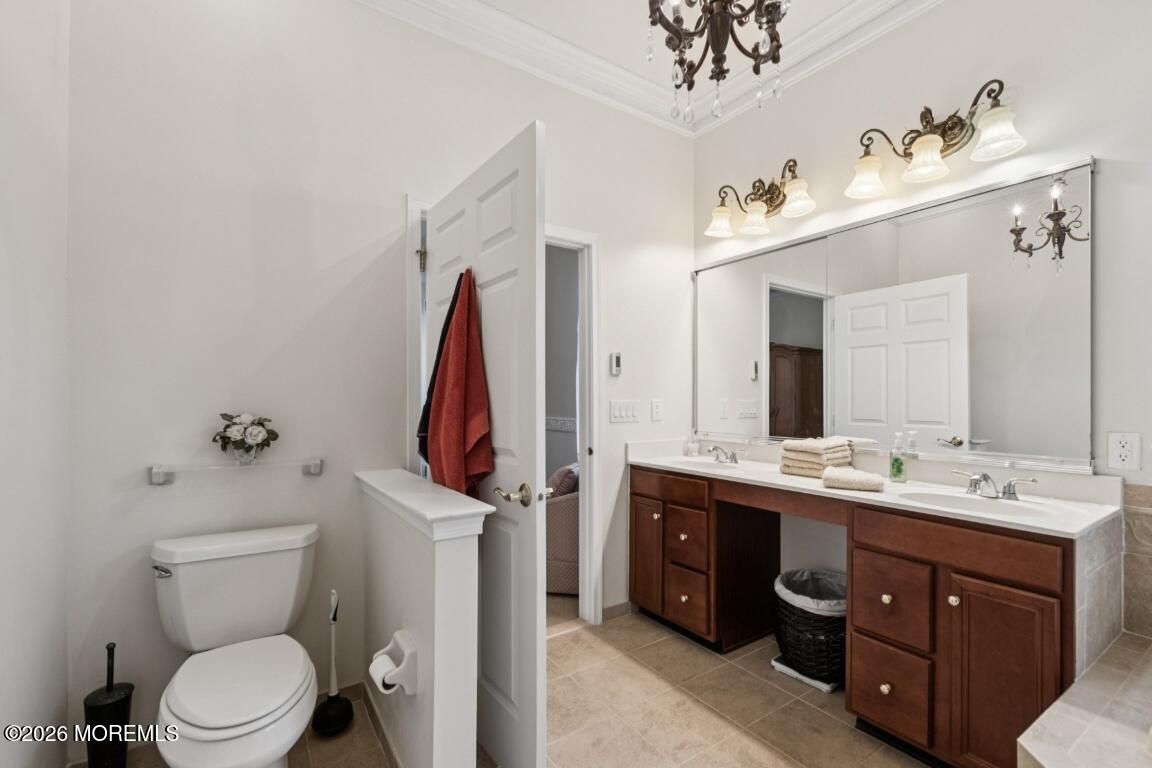Prestigious Riviera at Freehold, Gated Active Adult Age 48+ Community by Toll Brothers. Ranch Bayhill Expanded Model w a premium lot on a Cul De Sac. Open floor concept with 10 ft ceilings throughout. Crown moldings, custom window dressings included. Den currently used as a 3rd bedroom. Gourmet Kitchen w 42 inch cabinets and corian countertops. Extended breakfast area w sliding doors leading to paver patio. Extended Master suite w sitting area oversized closet and soaking tub. Extended family room w gas fireplace. Hardwood floors and recessed lights throughout. Custom cabinets in laundry room, and security system. Amenities include, clubhouse, outdoor pool w hot tub, tennis court, exercise room, bocci court, and shuffle board. Beautiful fountains throughout development.