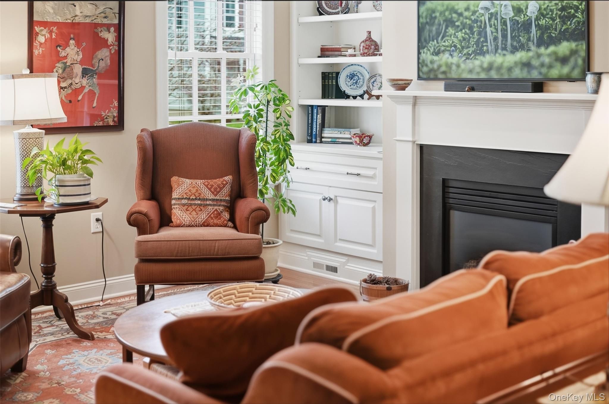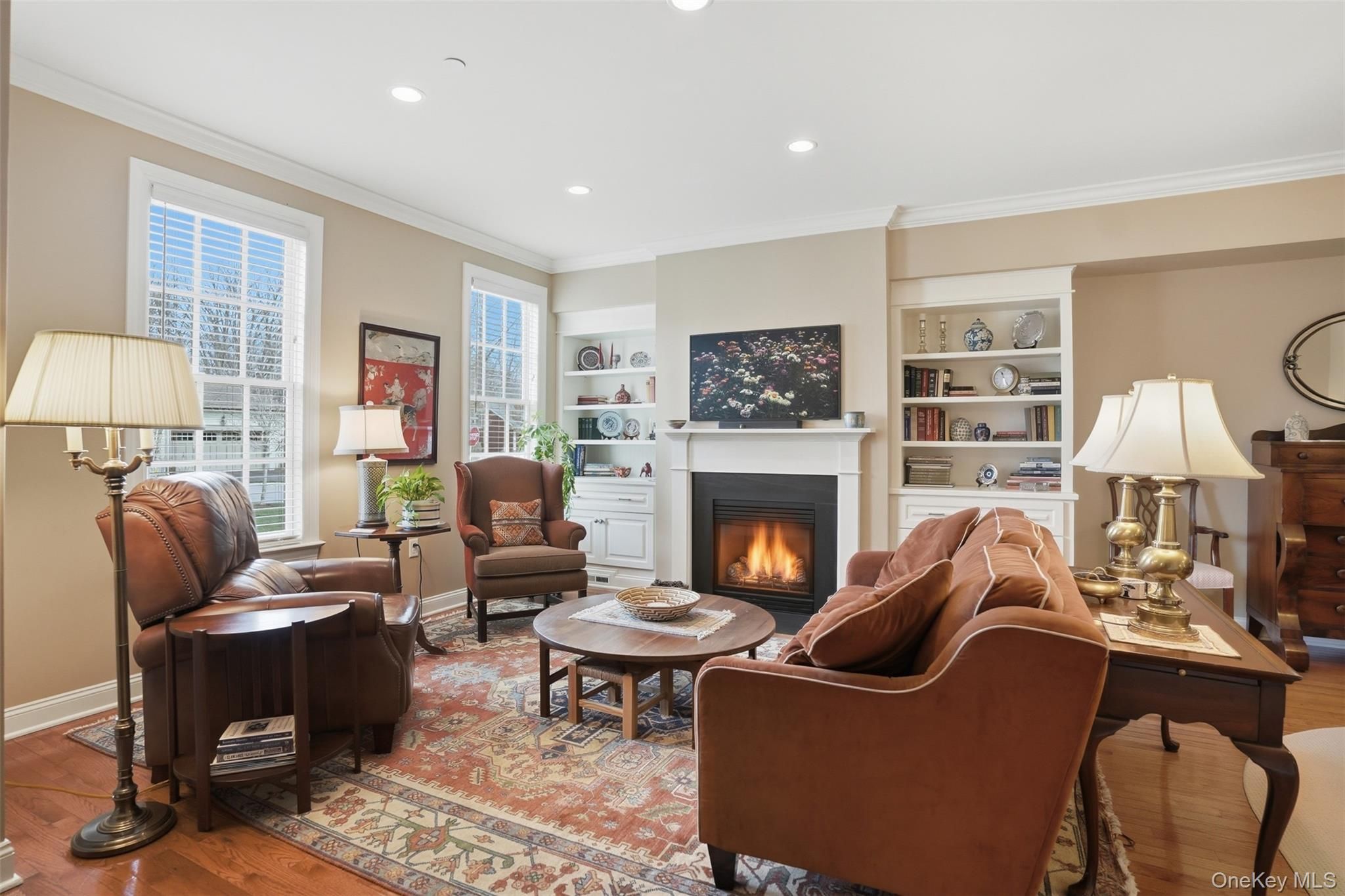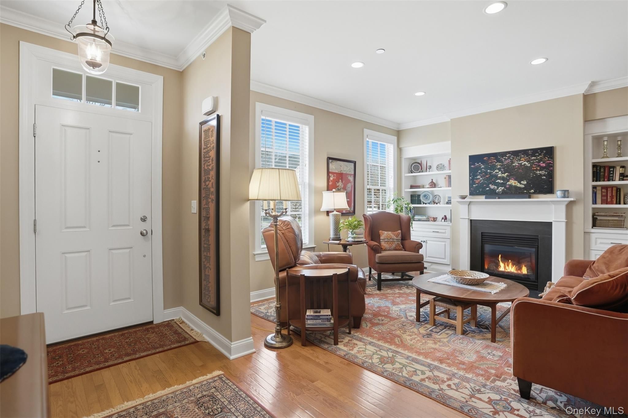 Located in the highly sought-after Warwick Grove community, this exceptional townhouse offers the perfect blend of style, comfort, and easy living. Step inside to an inviting open floor plan enhanced by crown moldings throughout and stunning, thoughtfully curated decor. The sun-filled living space features oversized windows and a cozy natural gas fireplace beautifully set into a custom built-in bookcase—creating a warm and elegant focal point. The kitchen flows seamlessly into the great room and casual dining area, ideal for everyday living and entertaining. A custom pantry with built-in shelving adds both convenience and organization. The generously sized primary suite is a true retreat, complete with two large custom walk-in closets and a totally renovated spa-like bathroom. A well-appointed guest bedroom offers its own private en-suite bath, providing comfort and privacy for visitors. Throughout the home you notice elegant crown molding and the rich hardwood oak flooring that adds warmth and continuity to the first floor. Outdoor living is just as impressive, featuring a private courtyard with a covered porch, plus a beautifully landscaped patio with a grill—perfect for relaxing or entertaining. This is refined, low-maintenance living at its best, all within close proximity to the charming Village of Warwick and all it includes.
