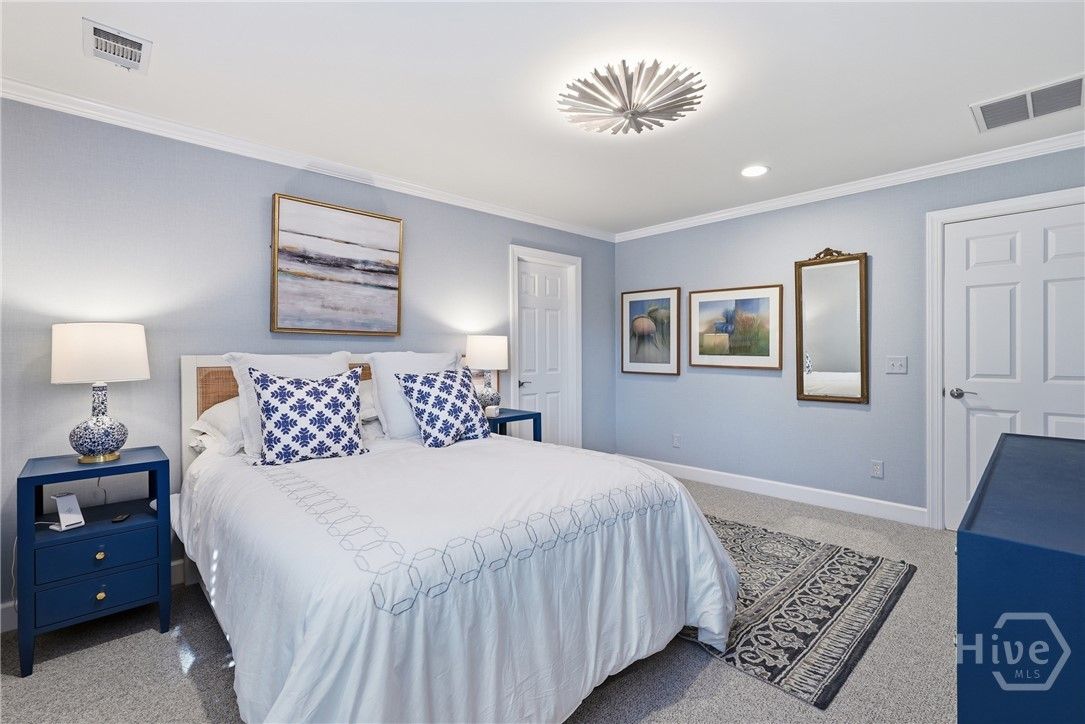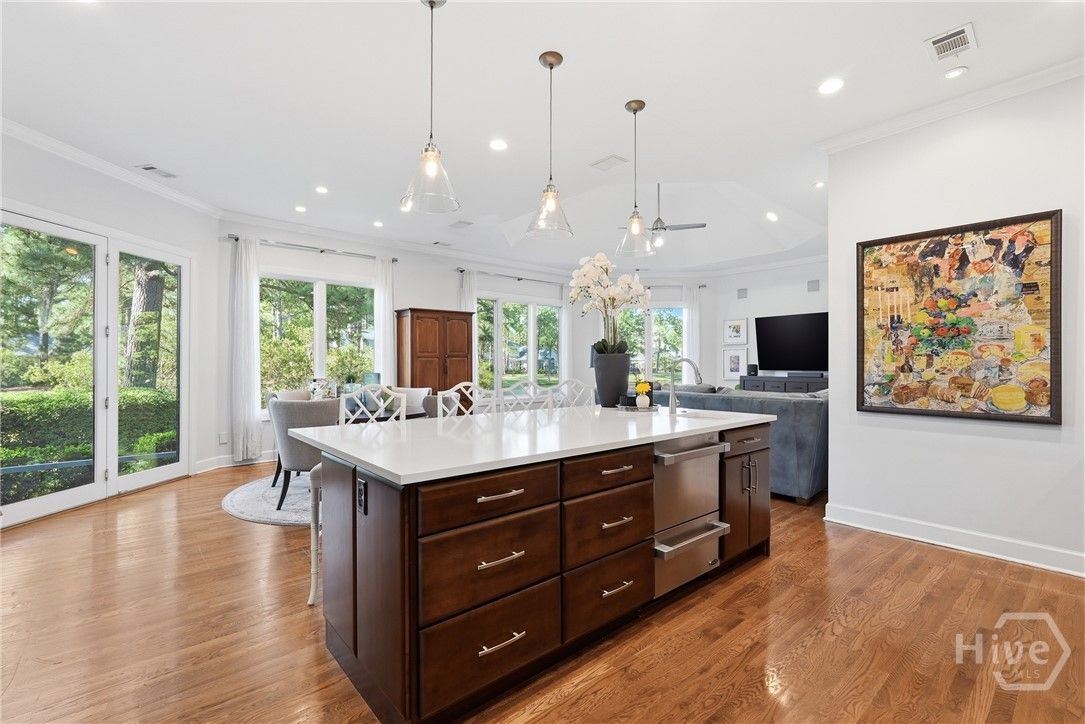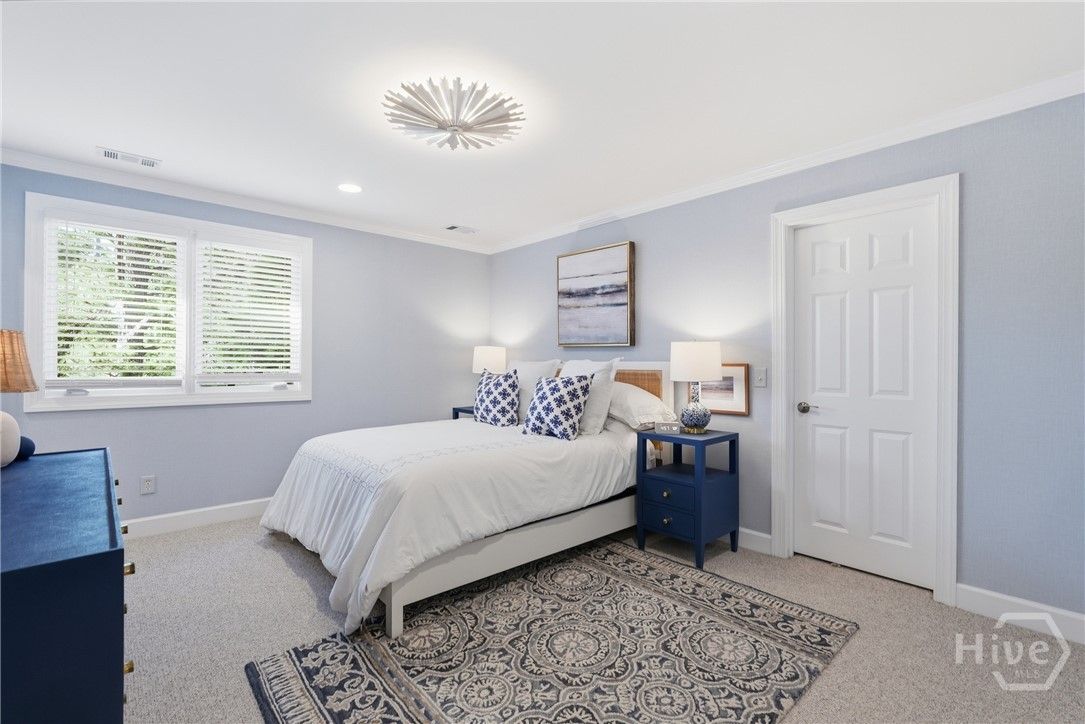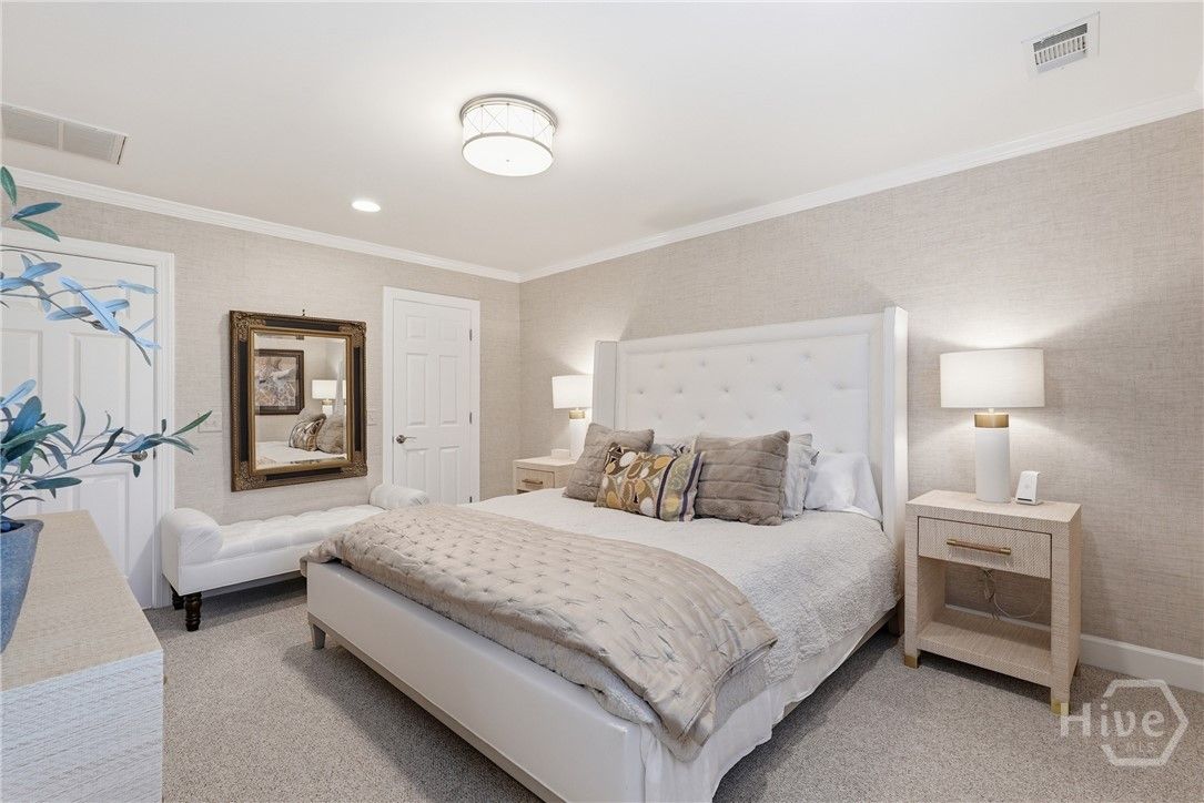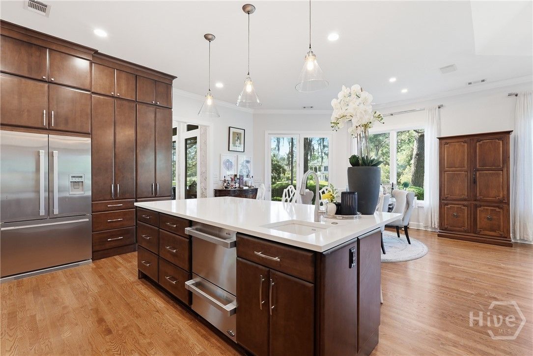 This beautifully maintained 4-bedroom, 4.5-bath home is located in the Oakridge area of The Landings on Skidaway Island and offers the perfect blend of comfort and style. Enjoy breathtaking lagoon views from the light-filled living spaces and relax year-round on the screened porch, ideal for taking in the serene surroundings. Designer finishes and 9’+ ceilings throughout this home elevate every room. The living and dining rooms are ideal for entertaining and feature a fireplace and lagoon views. The kitchen/family room combination with large island, quartz counters and high end appliances are ideal for gathering with family and friends. The thoughtfully designed layout features an owners’ suite on the main level with updated bath and an extra large walk in closet with built-ins. The first floor office features a custom storage system. 3 en-suite bedrooms on the second floor provide views, privacy and comfort for family and guests. The home has ample storage throughout, a whole house generator, landscape lighting, spray foam insulation, designer finishes, an EV car charger and a 2 car plus golf cart garage with a conditioned storage room. This homes is sited in an X-flood zone close to the village. Some amenities require additional membership.