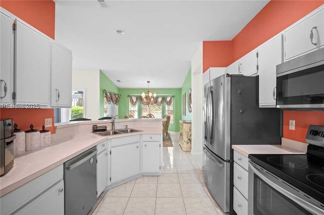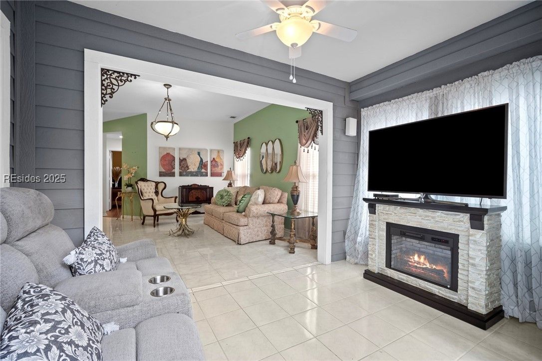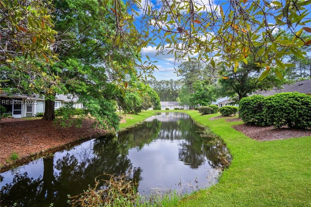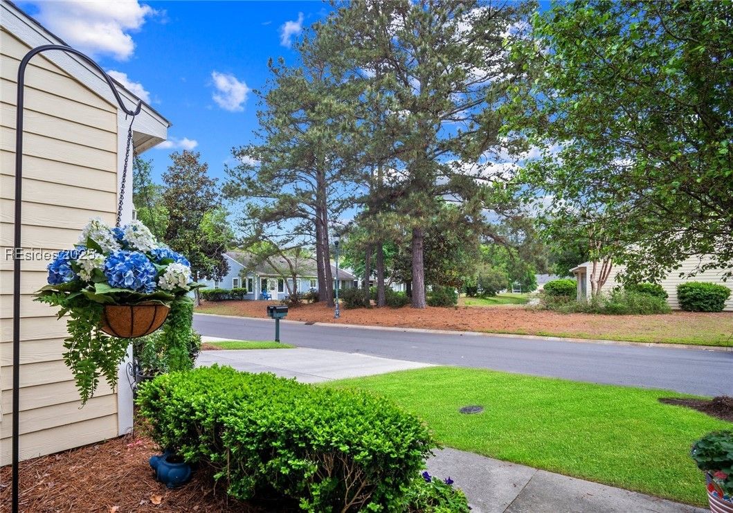 Light-Filled One-Level End Unit in Sun City! Nestled in a peaceful cul-de-sac on Beaufort County side with lower taxes! This well-maintained 2BR, 2BA townhome offers easy one-level living with an open floor plan, formal dining, and an eat-in kitchen with stainless appliances & counter-height bar. Bright Carolina room invites relaxation with wooded views. Home features primary suite with walk-in closet, smooth ceilings, tile & LVP flooring, charming front porch with lagoon views. With a 2-car garage & access to world-class amenities—golf, pools, clubhouse, pickleball & more—you're just minutes from downtown Bluffton, shops & dining.