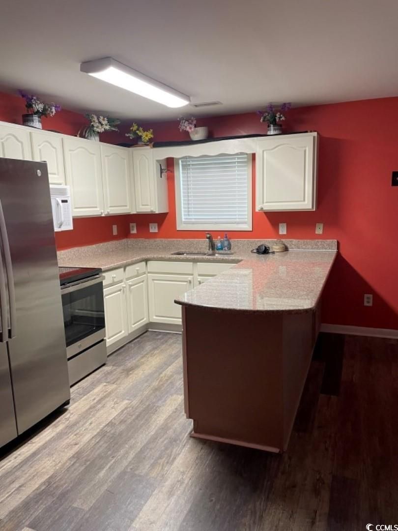 FIRST FLOOR, END UNIT, BATH-AND-A-HALF with rear porch converted into additional inside living space. Luxury vinyl plank flooring throughout, fully upgraded kitchen with large side-by-side stainless fridge, range microwave and dishwasher are among the features in this cozy corner gem. Stackable washer & Dryer in the converted porch area, and rear door exit for safety and convenience. Enjoy the convenience of dining at the breakfast bar or the cozy dinette area with extra light from the end unit windows. Convenient to everything this villa is located in Myrtle Beach’s Island Green community. Enjoy two community pools with gazebo, out-door shower and bathrooms amidst ample green space to beautify your living experience. Moderate HOA includes, Insurance, pools, water, cable, internet, trash, lawn and landscape, and exterior building maintenance; pest control and more. Island Green is convenient to Murrells Inlet, Surfside Beach, International Airport, Highway 31, Huntington Beach State Park, Brookgreen Gardens, Market Common, the Marsh Walk, and Myrtle Beach State Park.