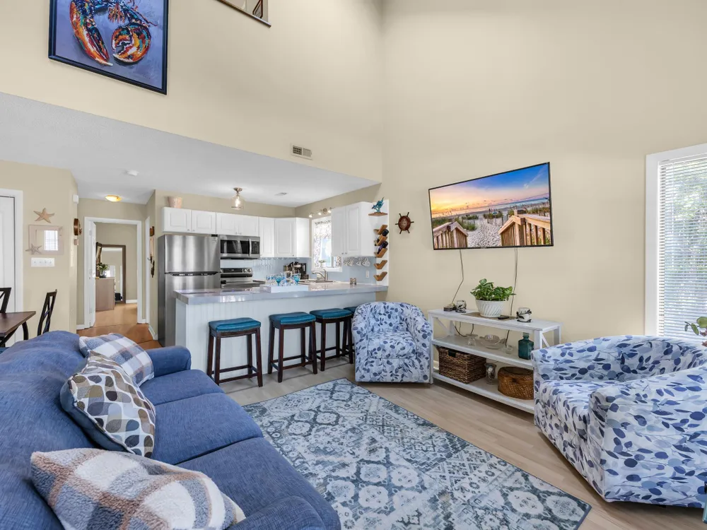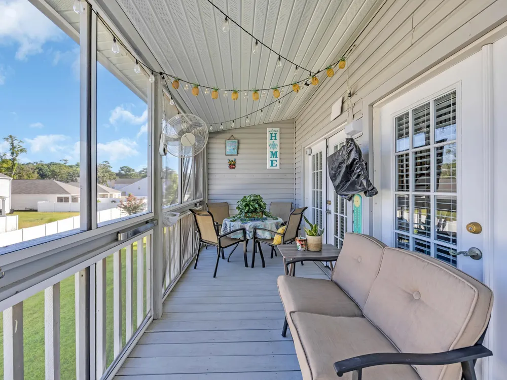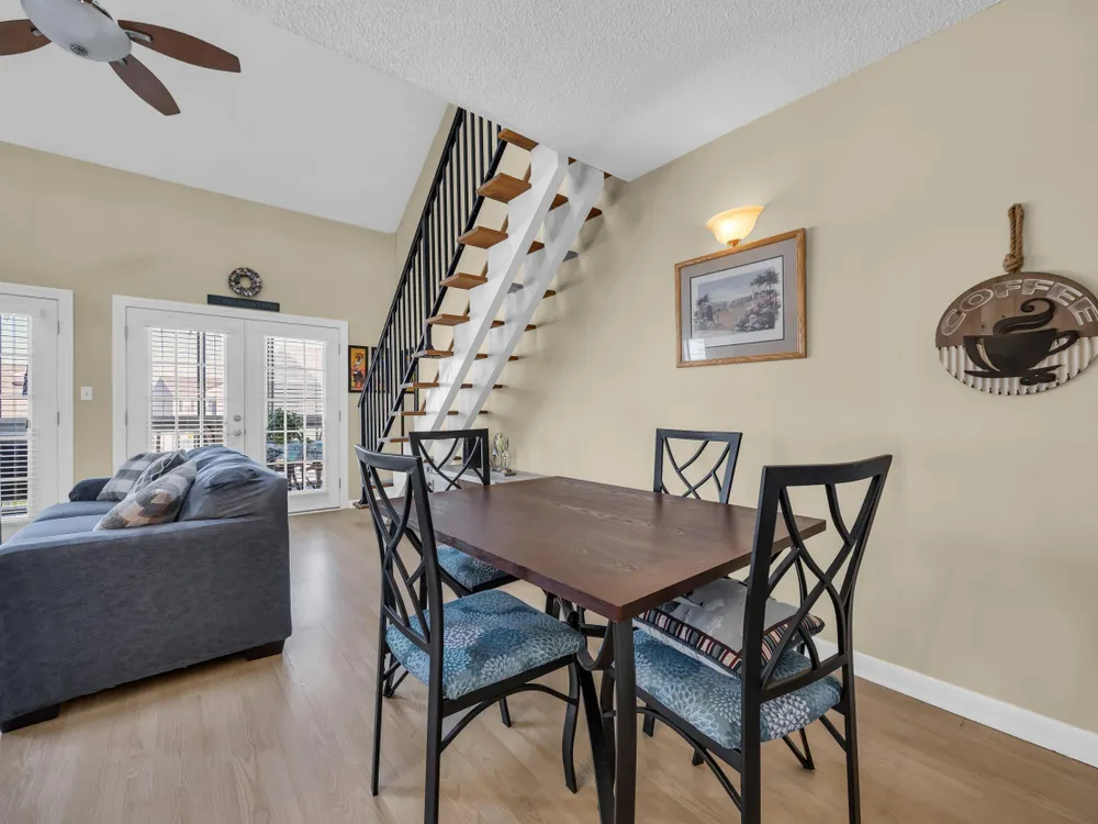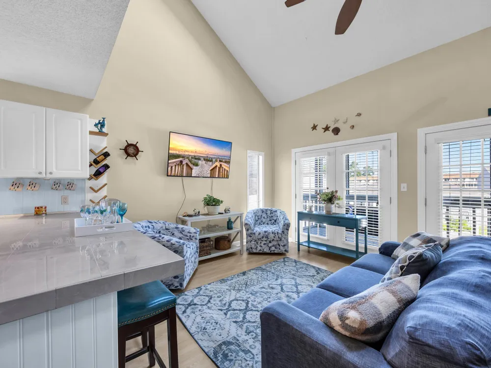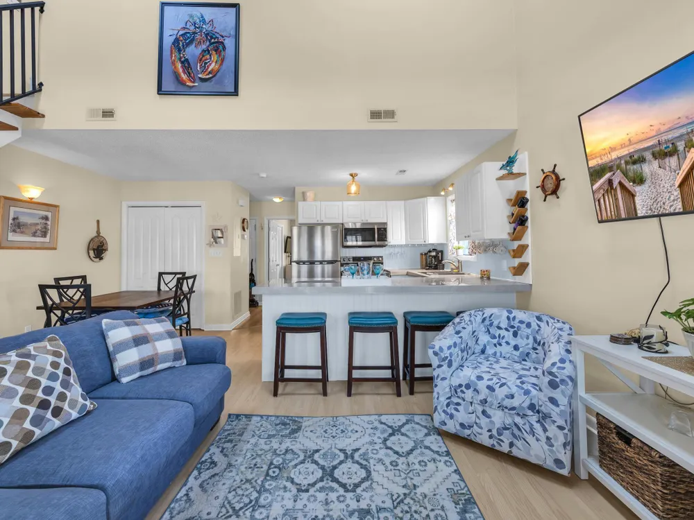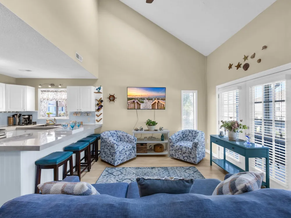 Welcome to Fairway Village at Island Green, where comfort meets convenience in this beautifully updated and fully furnished 2-bedroom, 2-bath home. From the moment you step inside, you'll appreciate the thoughtful upgrades and inviting layout. Vaulted ceilings with skylights and extra windows flood the living area with natural light, creating an open and airy feel. The living room seamlessly extends to the screened-in back porch through elegant double French doors, providing the perfect space to enjoy your morning coffee, unwind with a book, or simply take in the peaceful surroundings. The kitchen is both stylish and functional, featuring stainless steel appliances installed in 2022, including a smooth-top stove, built-in microwave, and refrigerator, along with a dishwasher replaced in 2020. In 2023, the kitchen was further enhanced with new countertops and a modern sink. Fresh laminate flooring in the entryway and both bathrooms was added in 2024, while the HVAC system and washer/dryer were replaced in 2020, giving you peace of mind for years to come. The primary bedroom, conveniently located on the main level, provides comfort and privacy with easy access to the first-floor full bath. Upstairs, the loft-style second bedroom is spacious and versatile, complete with its own full bath, perfect for guests family members, or even a home office. Fairway Village is an established community that offers flexibility whether you're searching for a primary residence, a second home, or an investment property. Annual rentals are permitted, giving you multiple opportunities to generate income. The community features a swimming pool just a short walk away, ideal for cooling off on warm Carolina days. HOA dues include water, sewer, internet and basic cable, adding extra value and convenience. Located within the Island Green community, this condo offers a peaceful retreat that's still close to everything you need. You'll enjoy easy access to shopping, dining, and entertainment, with the beach just a short drive away. All of this comes without the congestion and crowds of busier areas, making it the perfect Coastal Carolina lifestyle getaway.