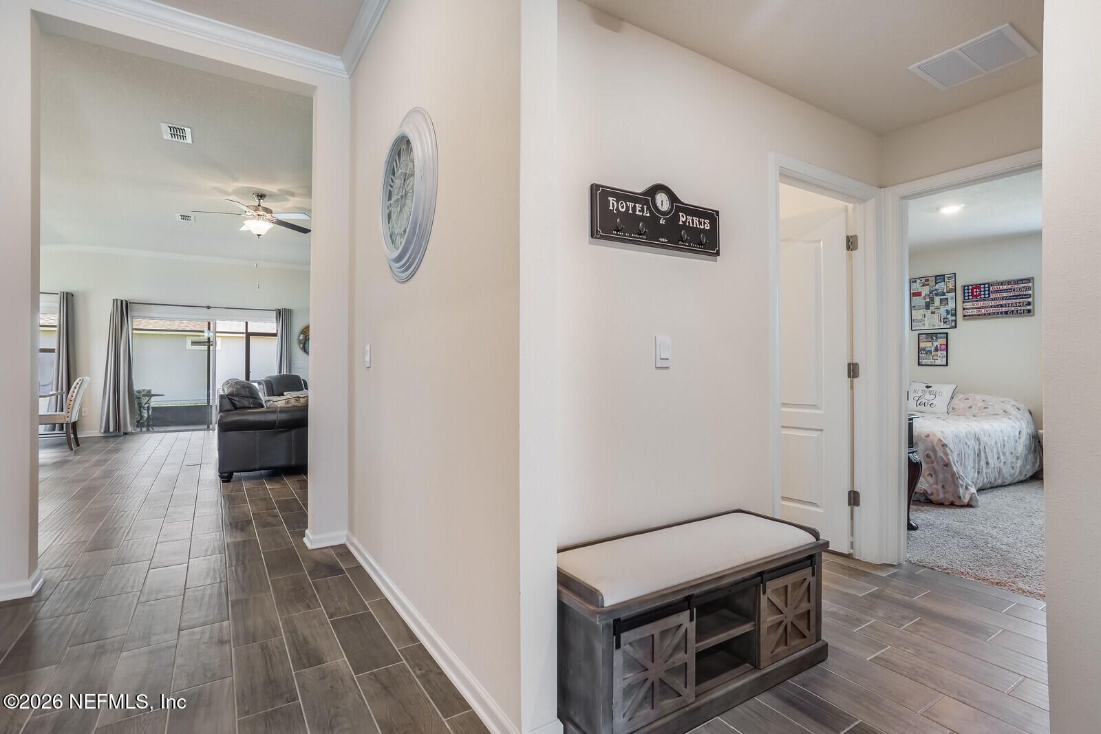 Attractively priced & rarely available Elton Plan in Parkland Preserve 55+ Community - Welcome to an exceptional opportunity to own the sought-after Elton floor plan in the thriving, gated 55+ community of Parkland Preserve. Perfectly situated on a spacious corner lot, this single-story home features two private bedroom suites plus an additional guest room—ideal for visitors, a hobby room, or a comfortable home office. The primary suite offers dual walk-in closets that flow into a private bath with a walk-in shower. An open-concept design connects the gracious kitchen, expansive dining area, and inviting living room—perfect for entertaining. Slide open the glass doors and extend your living space onto the screened lanai overlooking a peaceful partial water view. Thoughtfully maintained and beautifully appointed, the home features tile flooring throughout most spaces, plus tray ceilings and crown molding in both primary suites for an added touch of elegance. Enjoy resort-style amenities just moments from your doorstep! Bring your pickleball paddle to the courts, relax under shaded poolside cabanas, stay active in the fitness center, play bocce with neighbors, or take your pup to the community dog park. All of this, just minutes from shopping, dining, golf courses, and St. Augustine's fabulous beachesless than 30 minutes away!