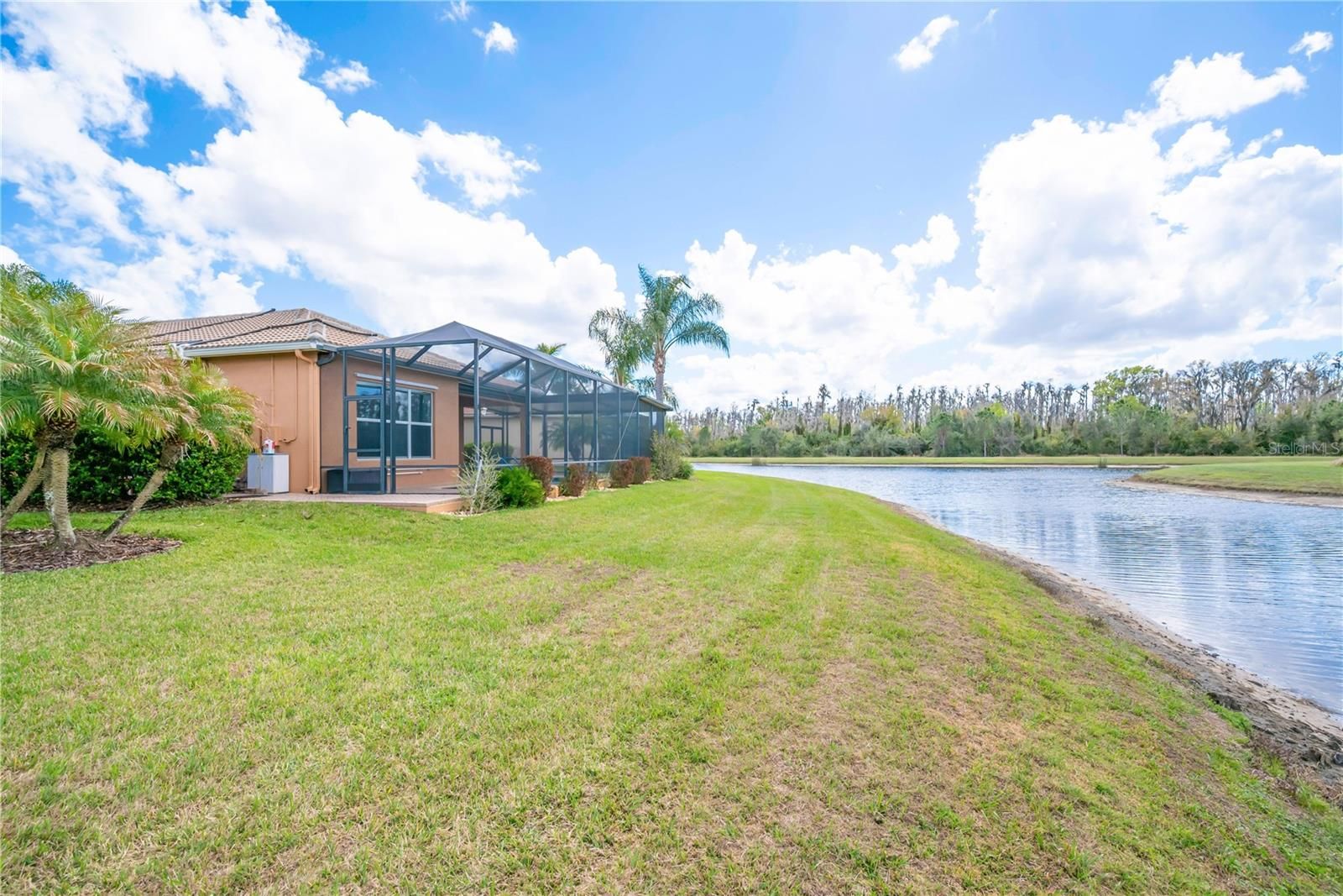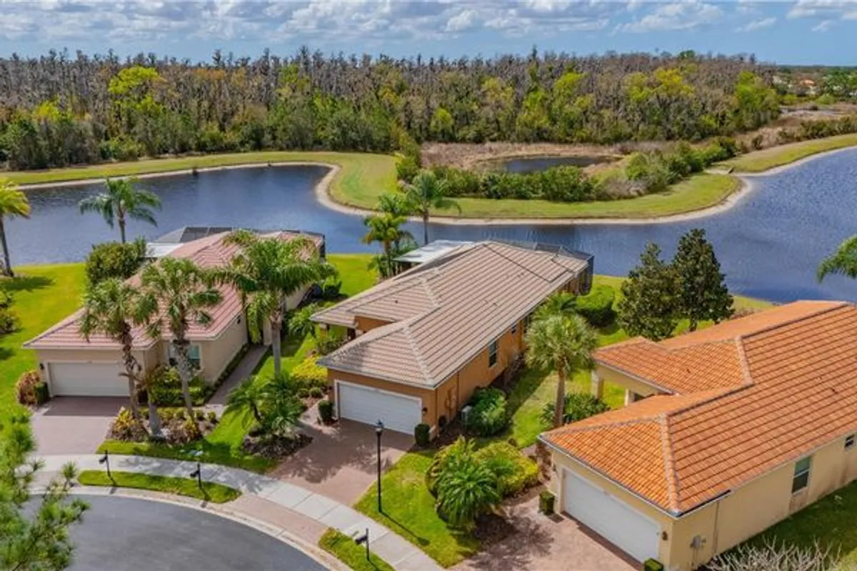 One or more photo(s) has been virtually staged. Welcome to your own private backyard oasis, showcasing breathtaking panoramic water views with a serene nature preserve backdrop and a sparkling saltwater pool designed for ultimate relaxation. This stunning Capri model offers two bedrooms, two baths, and a spacious den that can easily serve as a third bedroom, all ideally situated on a private cul-de-sac homesite with spectacular water views greeting you the moment you step inside. Exceptional curb appeal sets the tone, featuring a brick paver driveway and walkway, barrel tile roof, bay window, and a screened front porch that creates a warm and inviting entrance. Inside, a dramatic 12-foot coffered ceiling in the foyer, complemented by crown molding throughout, enhances the open and airy feel of the home. Large diagonal tile flooring spans the main living areas, while the primary bedroom showcases upgraded porcelain tile for a refined touch. The versatile den is highlighted by elegant double six-panel doors, making it ideal for a home office, media room, or guest space. The great room is truly an entertainer’s dream, featuring triple 8-foot sliding glass doors that open to an extended covered and screened lanai. The 22x8 solar-heated saltwater pool overlooks tranquil water views, creating a peaceful outdoor retreat perfect for morning coffee, breathtaking Florida sunsets, or hosting gatherings with friends and family. The gourmet kitchen is equally impressive with granite countertops, a stainless steel undermount sink with reverse osmosis system, 42-inch maple cabinetry, a pantry cabinet with roll-out shelves, under and over cabinet lighting, designer backsplash, and upgraded stainless steel appliances. A charming breakfast bay window fills the space with natural light and is the perfect place for everyday meals, while the adjacent informal dining area offers an intimate setting special occasions. The luxurious primary suite features a coffered ceiling with custom molding and two spacious walk-in closets with custom built-ins. The spa-inspired en-suite bath includes separate granite-topped vanities with maple cabinetry, a large walk-in shower with built-in seat, and a relaxing Roman tub. Guests will appreciate their private accommodations with a generously sized second bedroom and a well-appointed bath featuring a fully tiled shower and granite countertop with extended banjo top. A separate laundry room with GE washer and dryer adds convenience and leads directly to the garage, which includes an insulated overhead door, split HVAC system, and whole-home surge protector. Additional upgrades include an electric roll-down solar shade on the lanai, water softener system, hurricane shutters, gutters, a new water heater installed in 2022 with a 10-year warranty, freshly painted exterior, and numerous thoughtful enhancements throughout. Located in Valencia Lakes, Tampa Bay’s premier 55+ resort-style community, residents enjoy access to a spectacular 40,000-square-foot clubhouse, a newly opened restaurant and bar, 24-hour fitness center, resort-style pools, tennis and pickleball courts, bocce ball, walking trails, arts and crafts studios, cooking classes, live entertainment, and dozens of clubs and social activities. This is more than just a home—it’s a lifestyle. Don’t miss the opportunity to own this immaculate, move-in-ready residence and experience the very best of 55+ living at Valencia Lakes.