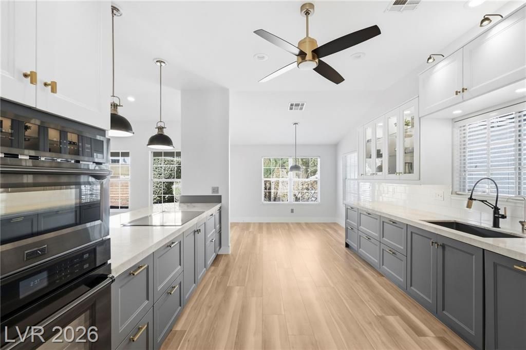 Fully remodeled single-story home with a 3-car garage on a nearly ¼-acre lot and over $65K in modern upgrades! This spacious 2,349 sq ft move-in ready home offers 3 bedrooms plus a den (possible 4th bedroom) and a bright open floorplan with separate living and family rooms featuring a cozy fireplace and vaulted ceilings throughout. Elegant modern chandeliers highlight the entry and dining areas. The stunning custom chef’s kitchen features quartzite countertops, a large breakfast bar, recessed lighting, custom cabinetry with interior lighting, and a walk-in pantry. High-end appliances include GE induction cooktop, ZLINE convection oven and microwave, and Samsung refrigerator. Additional upgrades include R/O and hydrogen water systems, large laundry room with cabinets and sink plumbing, new 40-gallon water heater, and new main water valve. Beautifully upgraded and designed for comfortable living and entertaining inside and out. Come walk through this beauty today!!!