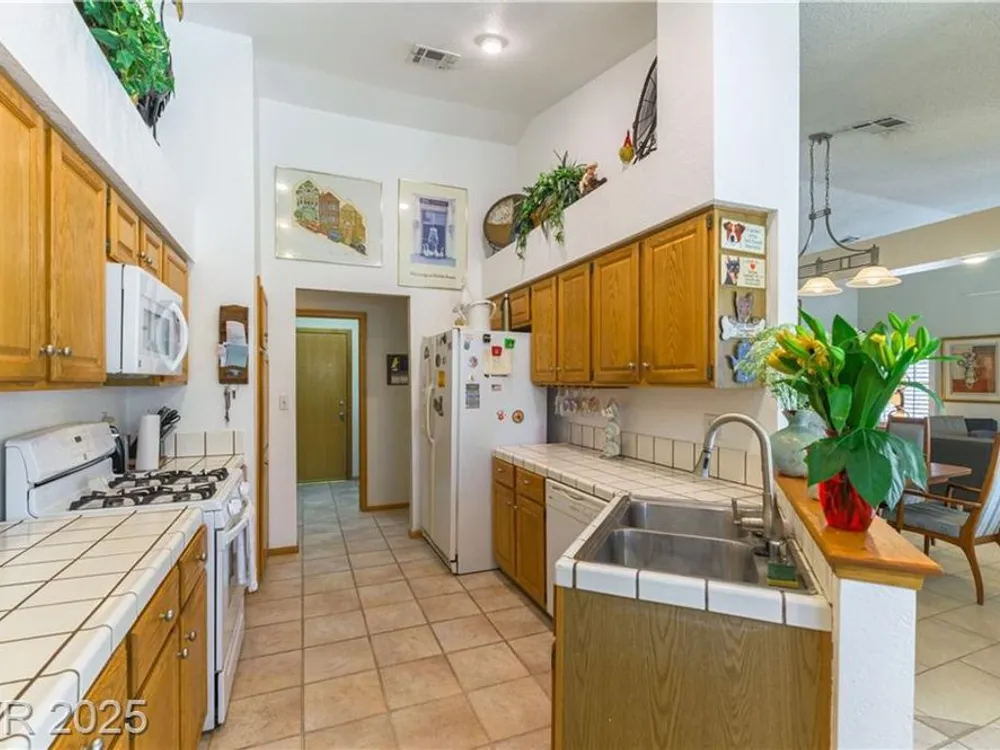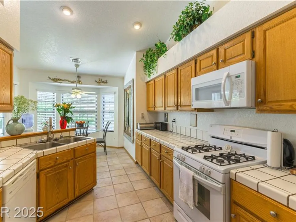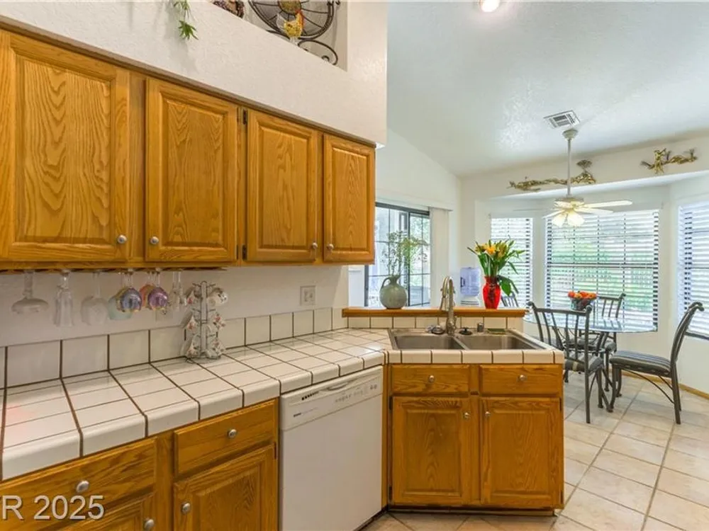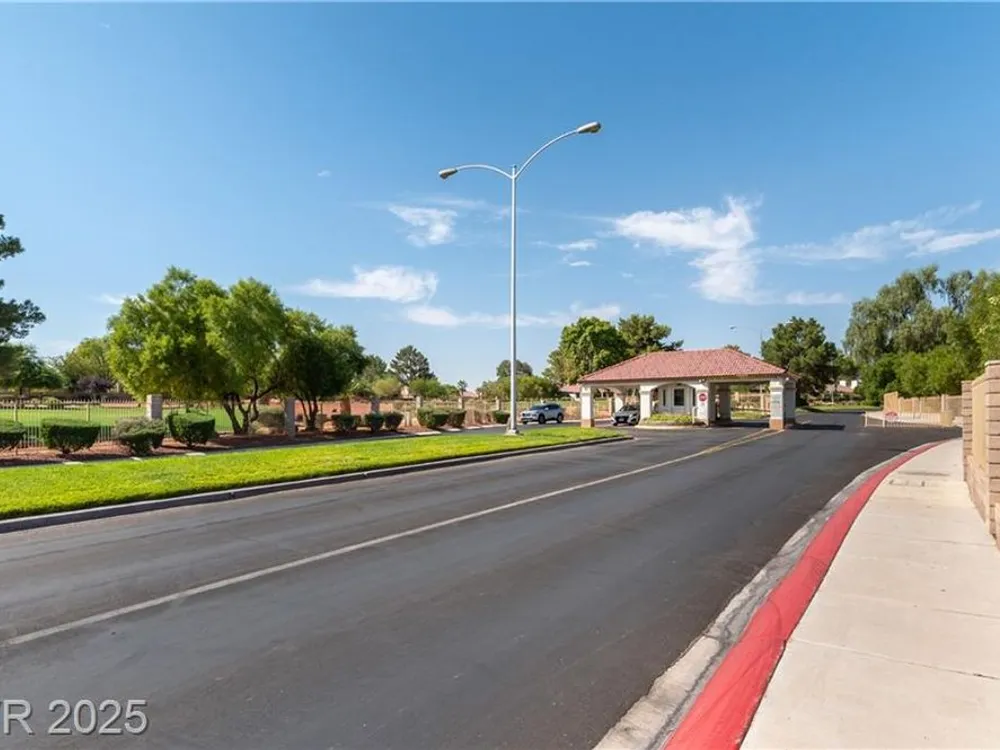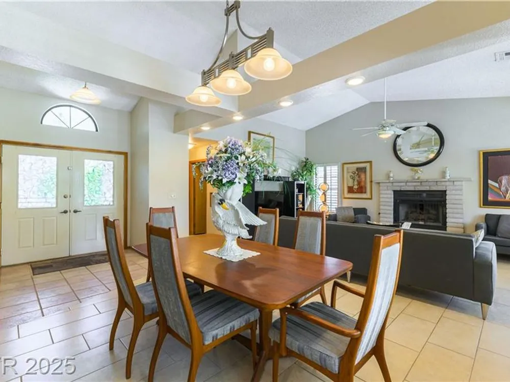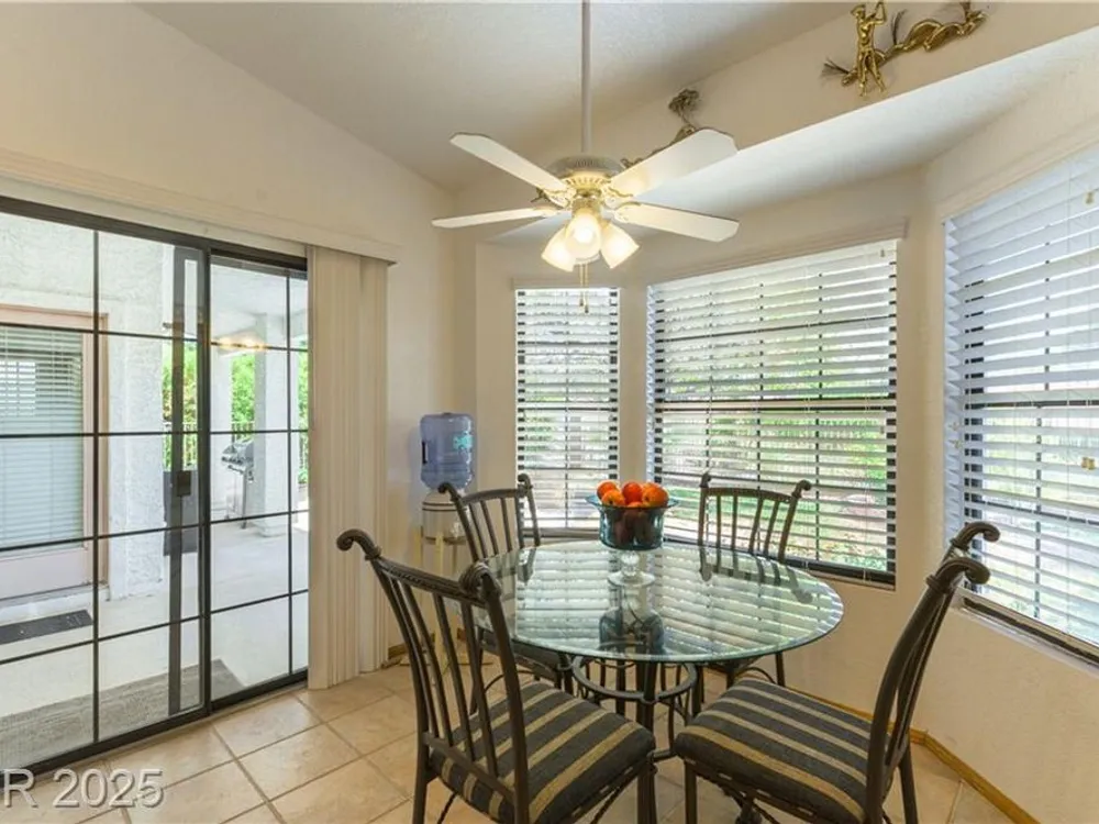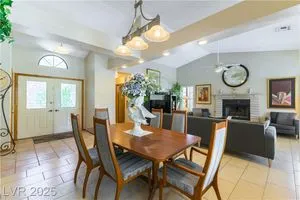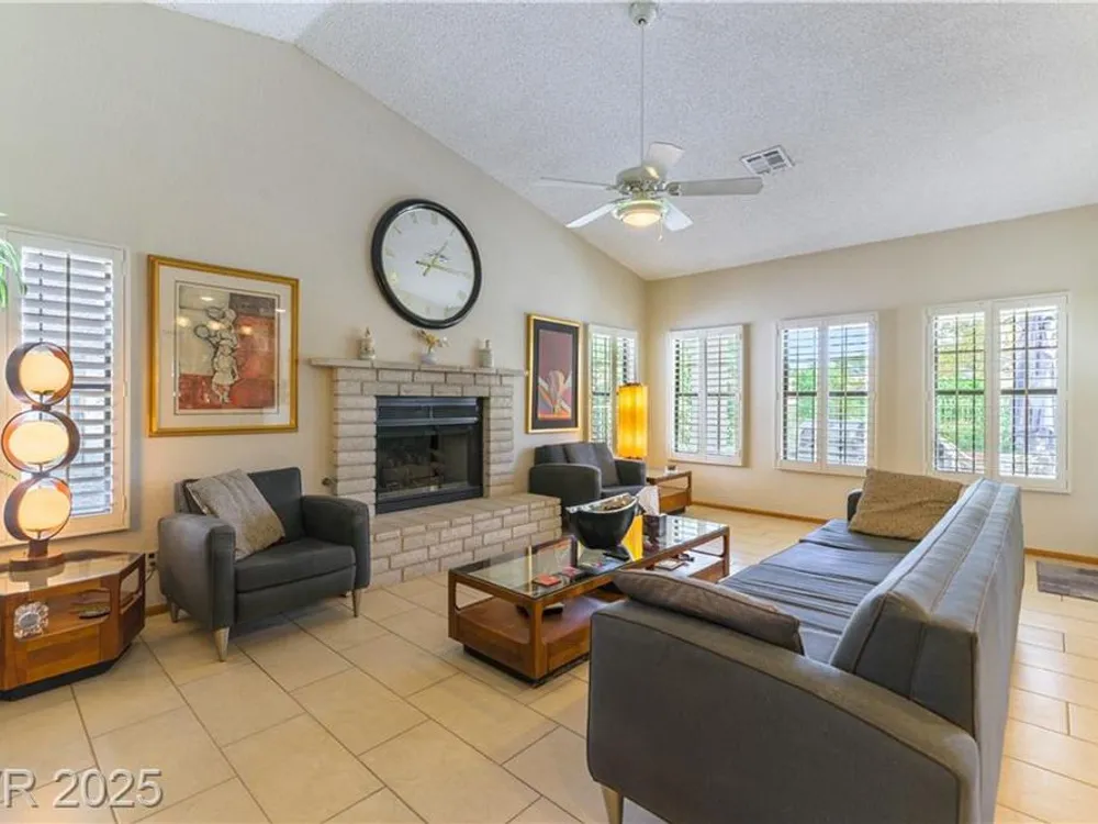 Las Vegas' best-kept secret! Located in a guard-gated community offering resort-style amenities including clubhouse, golf, pools, tennis, and pickleball. This light-filled 2-bedroom, 2-bath home features ceiling fans throughout, plantation shutters, and a cozy gas fireplace in the living/dining room. The eat-in kitchen is perfect for everyday dining. The spacious primary bedroom includes a versatile area ideal for a sitting room or office. The primary bath offers double sinks and a walk-in shower. Mirrored closet doors add a stylish touch. The 2-car garage includes a refrigerator. Recent upgrades: AC/heater (1 year old) and water heater (2 years old). A must-see!