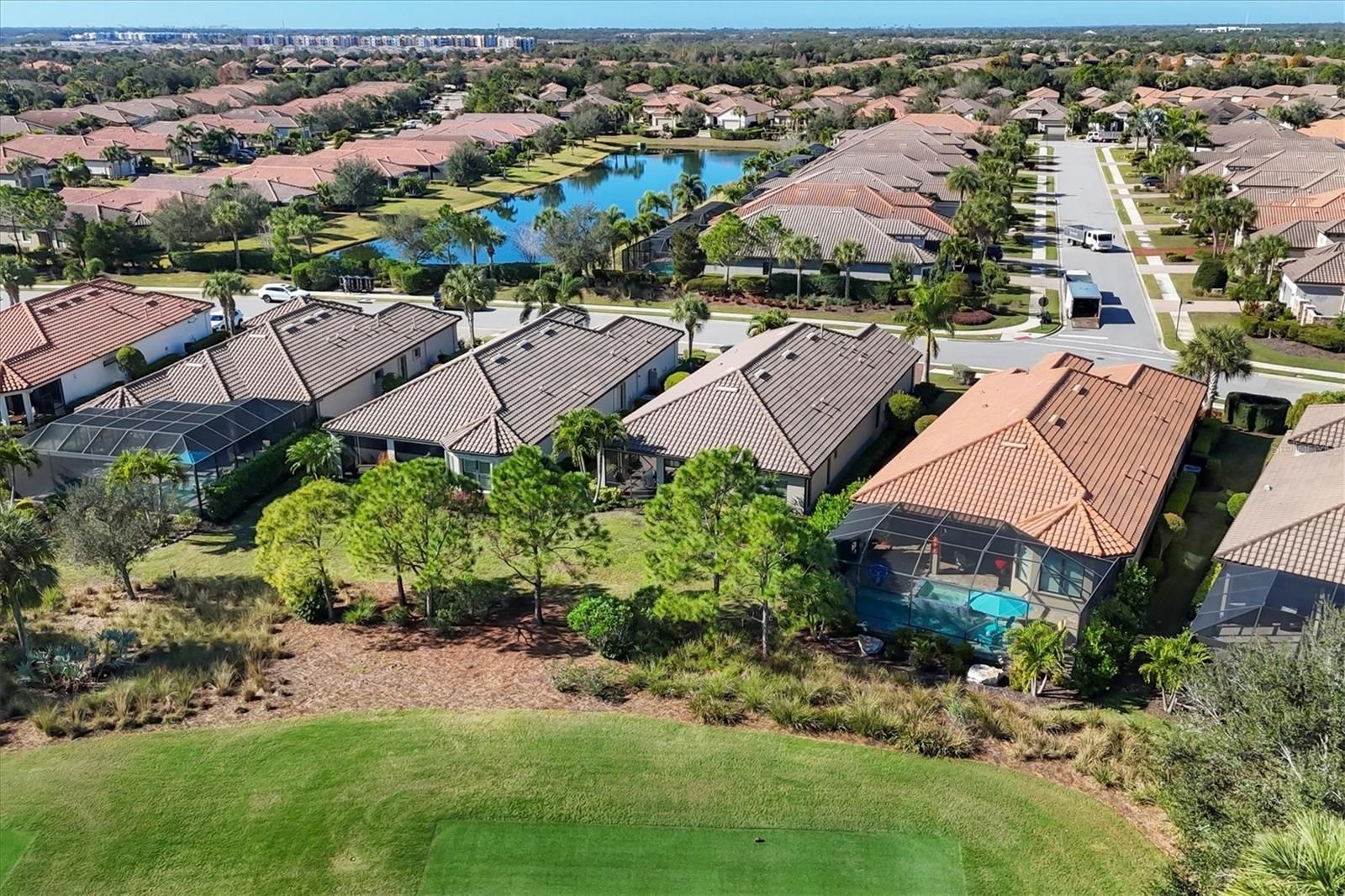 This beautiful home is a must-see! Along the second fairway of the Esplanade Golf and Country Club, this three-bedroom, three- full bath Taylor Morrison extended Lazio model residence offers a spacious layout and an atmosphere of refined comfort. Engineered hardwood floors flow throughout the main living areas, while crown molding and plantation shutters enhance the home’s architectural detail and provide privacy. A soft, neutral palette creates a timeless backdrop for a variety of personal design styles. Meticulous maintenance and pride of ownership are evident throughout. The HVAC system has been recently updated, and the home’s exterior was professionally repainted in 2025. Each bedroom features a full bath and professionally designed closets with built-in storage. The primary suite serves as a serene retreat with a well-appointed bath. Glass French doors enclose the den, offering flexibility as a private office or guest space. The kitchen centers around a large quartz island with a valued breakfast area, and features GE Café Series appliances for a polished culinary experience. A deeded golf membership comes with the property. Expansive fairway rear views and an eastern exposure provide bright and picturesque mornings and shaded afternoons on the spacious lanai. Furnishings are available for purchase under a separate agreement. Residents of Esplanade Golf and Country Club enjoy an array of resort-style amenities, including pickleball and tennis, fitness classes, dance and art classes, health lectures, card and book clubs, as well as numerous social and philanthropic opportunities. Meet up with friends at the Bahama Bar or the popular Culinary Center dining options. Esplanade is within 30 minutes of downtown Sarasota and all its cultural offerings, and less than an hour from famous Gulf Coast beaches. Take this opportunity to enjoy the Florida lifestyle!