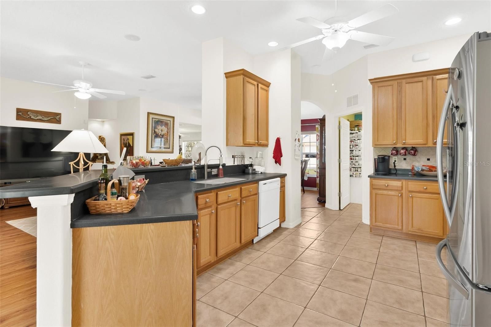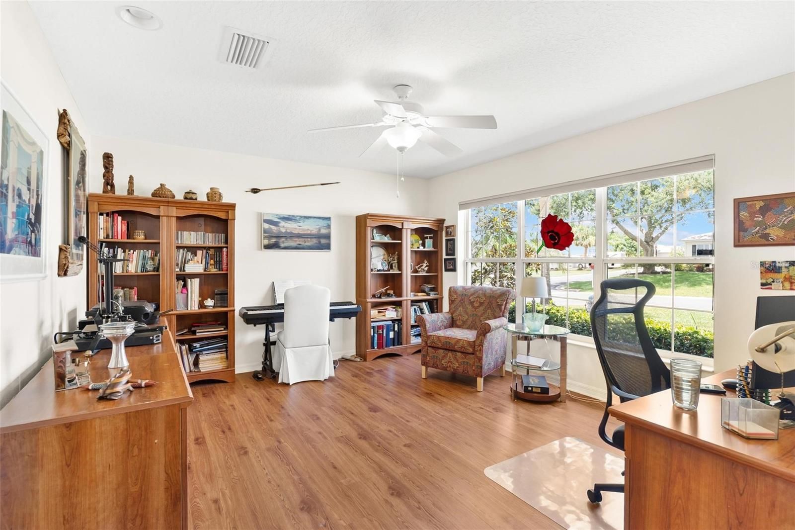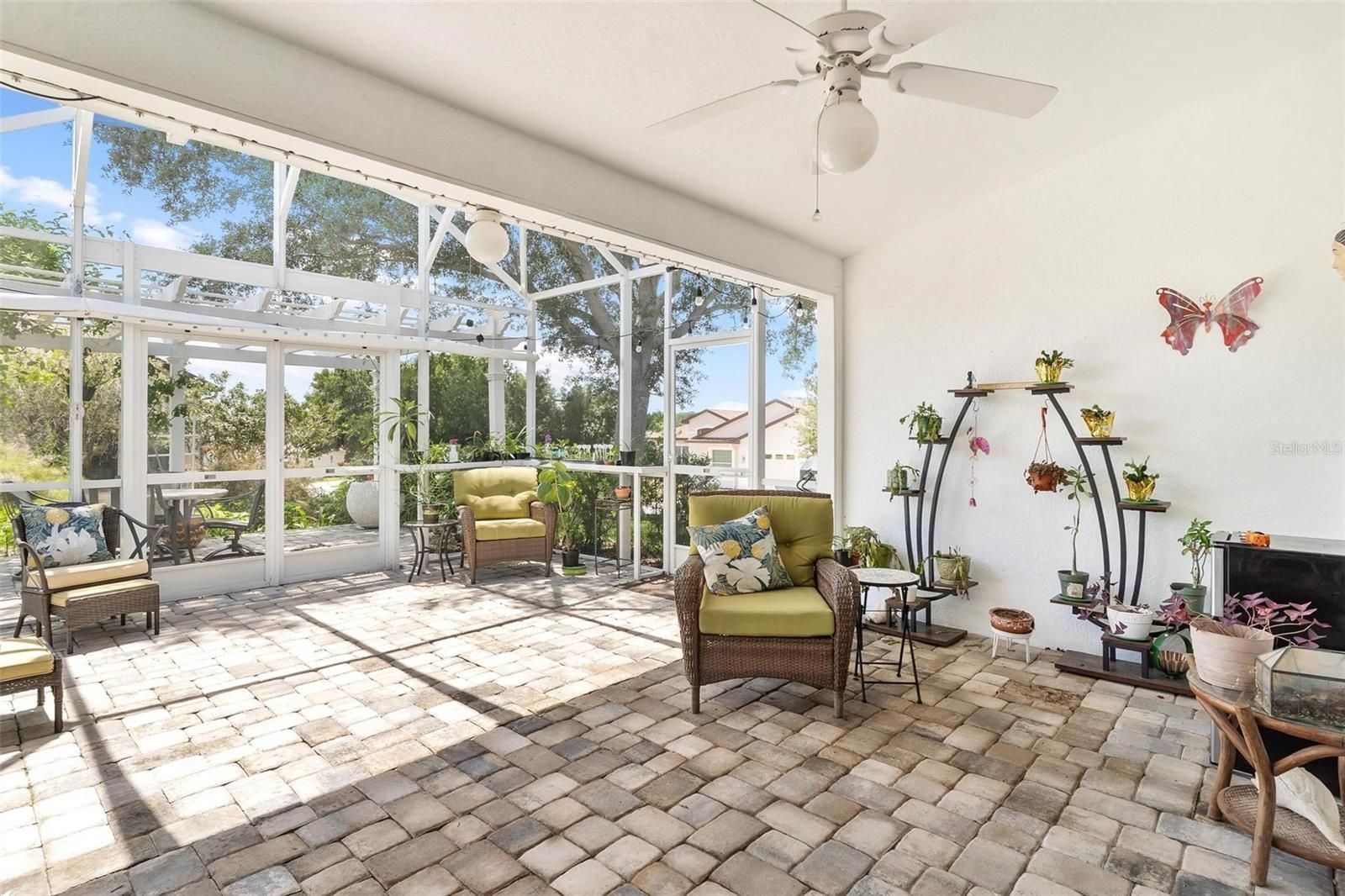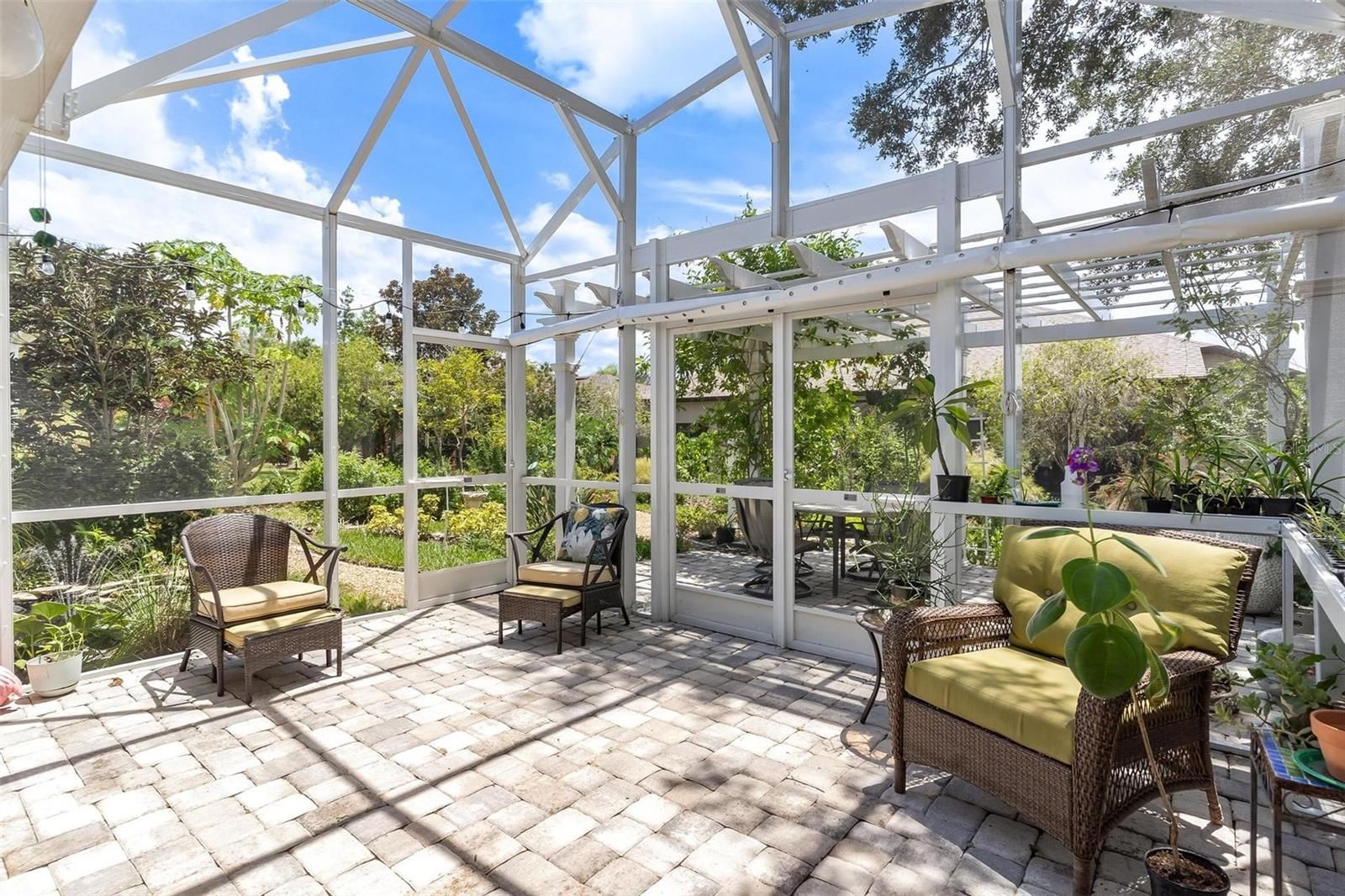 This quality custom home, in the prestigious 55+ Waterfront community of Royal Harbor, sits proudly on an extensively landscaped corner lot. Enjoy the lushly landscaped Garden oasis in your own backyard, complete with pathways, pond and fountains, and a custom irrigation system for each area. The lovely front entry with leaded glass front door and custom stained glass transom window welcomes you and your guests. Once inside, you will immediately appreciate the thoughtful custom floor plan, with a large Great Room , Dining Room, and living Room/Den/Office/Bonus Room. The Great Room, with gas fireplace, provides access, through large sliders, to a large Screened Lanai with beautiful pavers, and is open to the spacious Kitchen and inviting Breakfast Nook, all overlooking the Garden Oasis, pond, and fountains. The Kitchen also includes a large breakfast bar and has ample solid wood cabinets and Corian countertops. The Primary Suite provides the retreat you deserve, with vaulted ceilings, oversized walk-in closet, and ensuite Bath featuring a large walk-in shower and double vanity. Your guests will also appreciate the privacy provided by the Guest Wing of this nicely designed 3 bedroom Split Plan. The Garage just may be your favorite thing, with 763 square feet of wonderful space for you to use and enjoy. It is set up with a large workshop area and a separate area for special creative projects. There is lots of space for storage, toys and cars too! This home has been very well maintained, and has a New Roof installed 2-2025, and New A/C in 2024. This home is ready for you to move right in and enjoy the lifestyle you deserve, in the community that has it all! Royal Harbor on the Harris Chain of Lakes, is a great community, with all the Amenities and Activities that you would expect! Enjoy the Clubhouse, with Social Hall, Fitness Center, Library, Billiards, Pool and Spa. Play Tennis, Pickleball, Bocce and Shuffleboard. Enjoy the Community Docks. There is even RV, Boat and Trailer Storage. Come make new friends and live the lifestyle you have been dreaming of. Call today for your private showing. The main living area has been recently painted in neutral colors. All of the furniture has been removed. Furnished photos remain for reference.