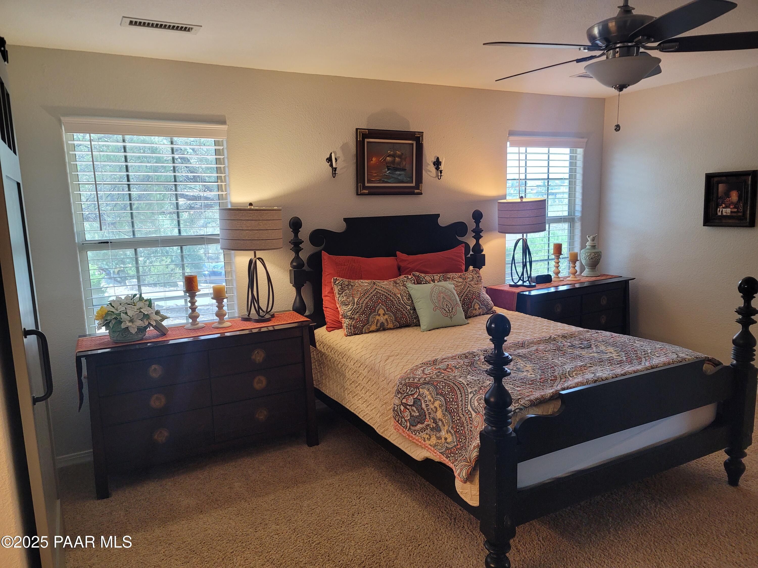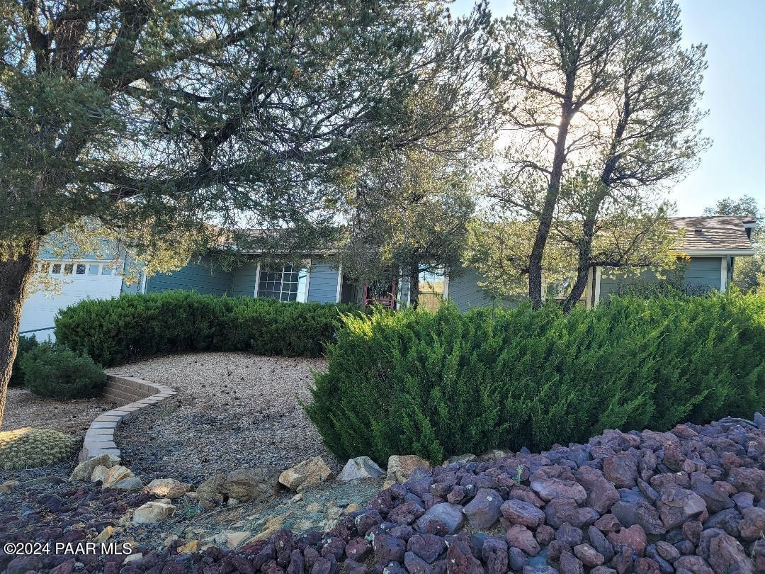 Beautifully cared for home in a cul de sac located in the desirable Yavapai Hills surrounded by pines, junipers, apple and other trees. Remodeled with modern finishes and upgrades. Plantation shutters and Anderson Doors and Windows in the living and kitchen areas. Granite counters in the kitchen with a beamed ceiling and double doors leading you to the new pergola covered and trex deck. New roof, paint and pavers. Cozy wood burning fireplace in the great room. Quartz counter in primary bath with an awesome claw foot tub and large closet. Murphy bed in guest room conveys making it easy for you to have overnight guests and have a potential office/den. Overhead storage in the garage and already set up to charge your electric car! Access to community center with swimming pool, pickle ball and more!