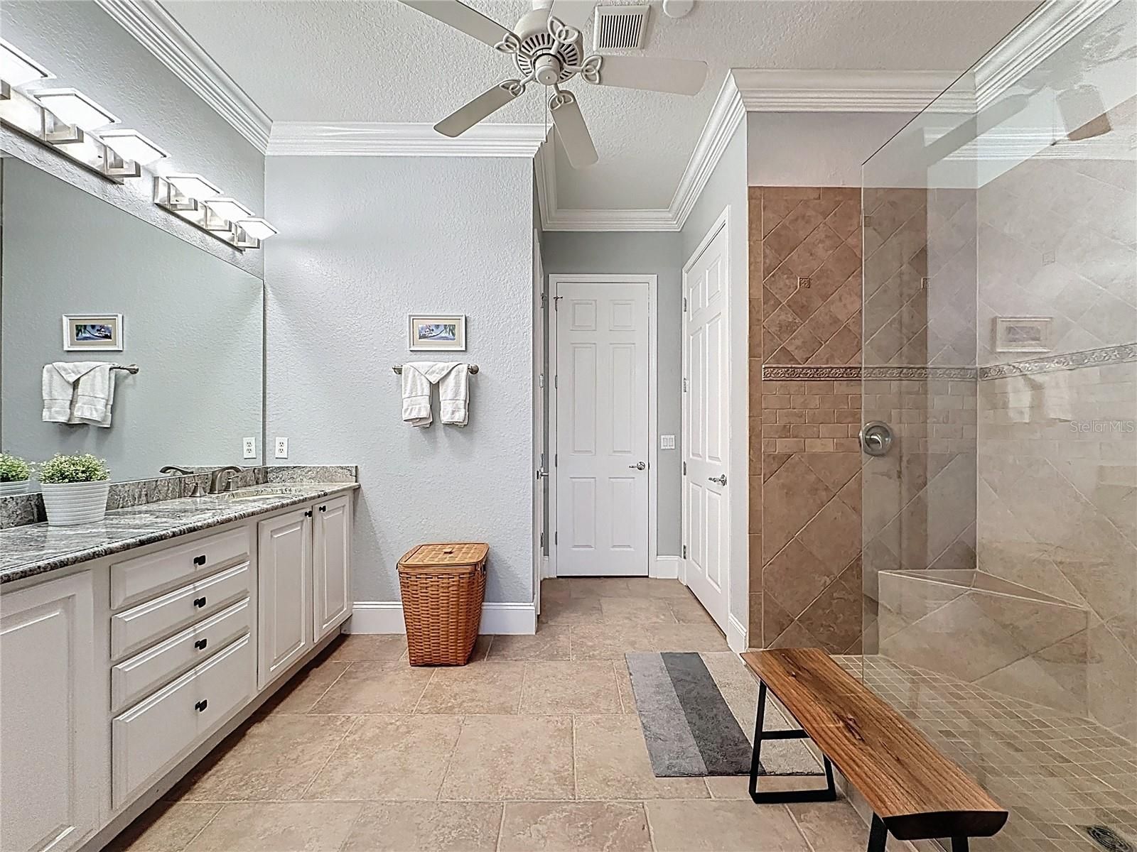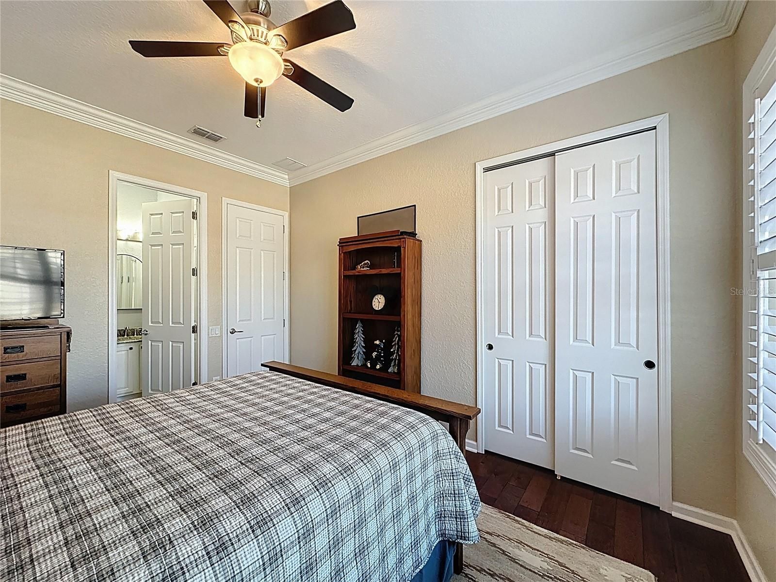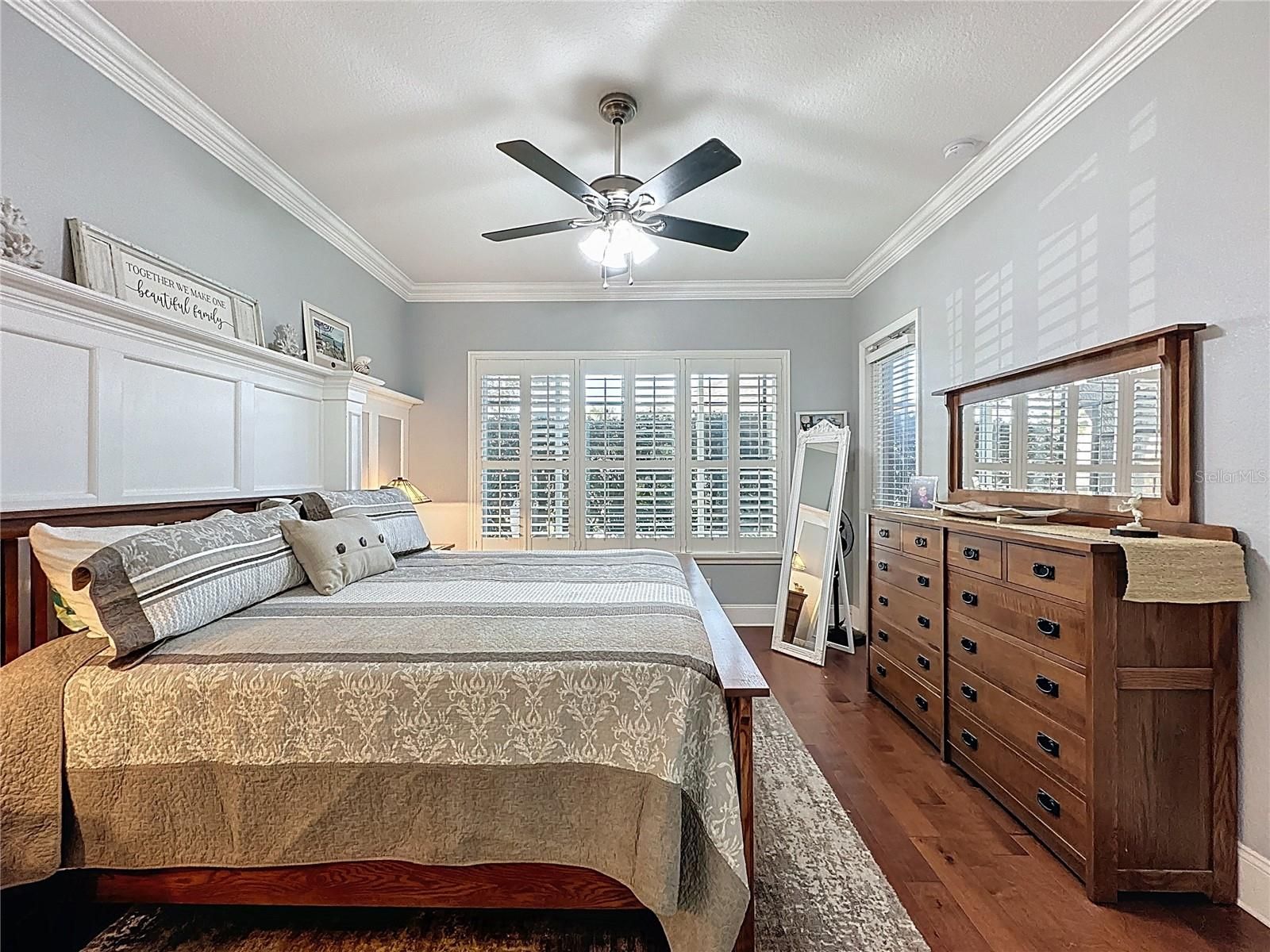 - Ceiling Fan(s), Crown Molding, Eat-in Kitchen, Open Floorplan, Main Level Primary, Solid-Wood Cabinets, Split Bedrooms, Stone Counters, Thermostat, Walk-In Closet(s)