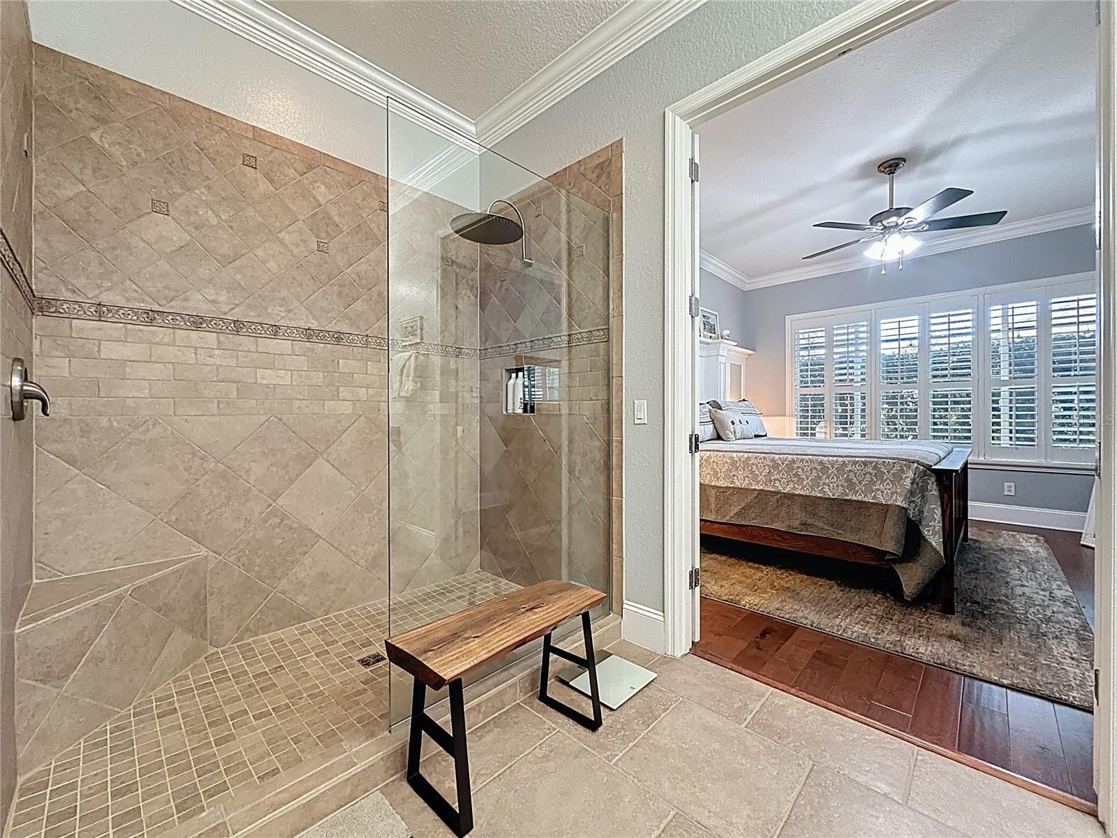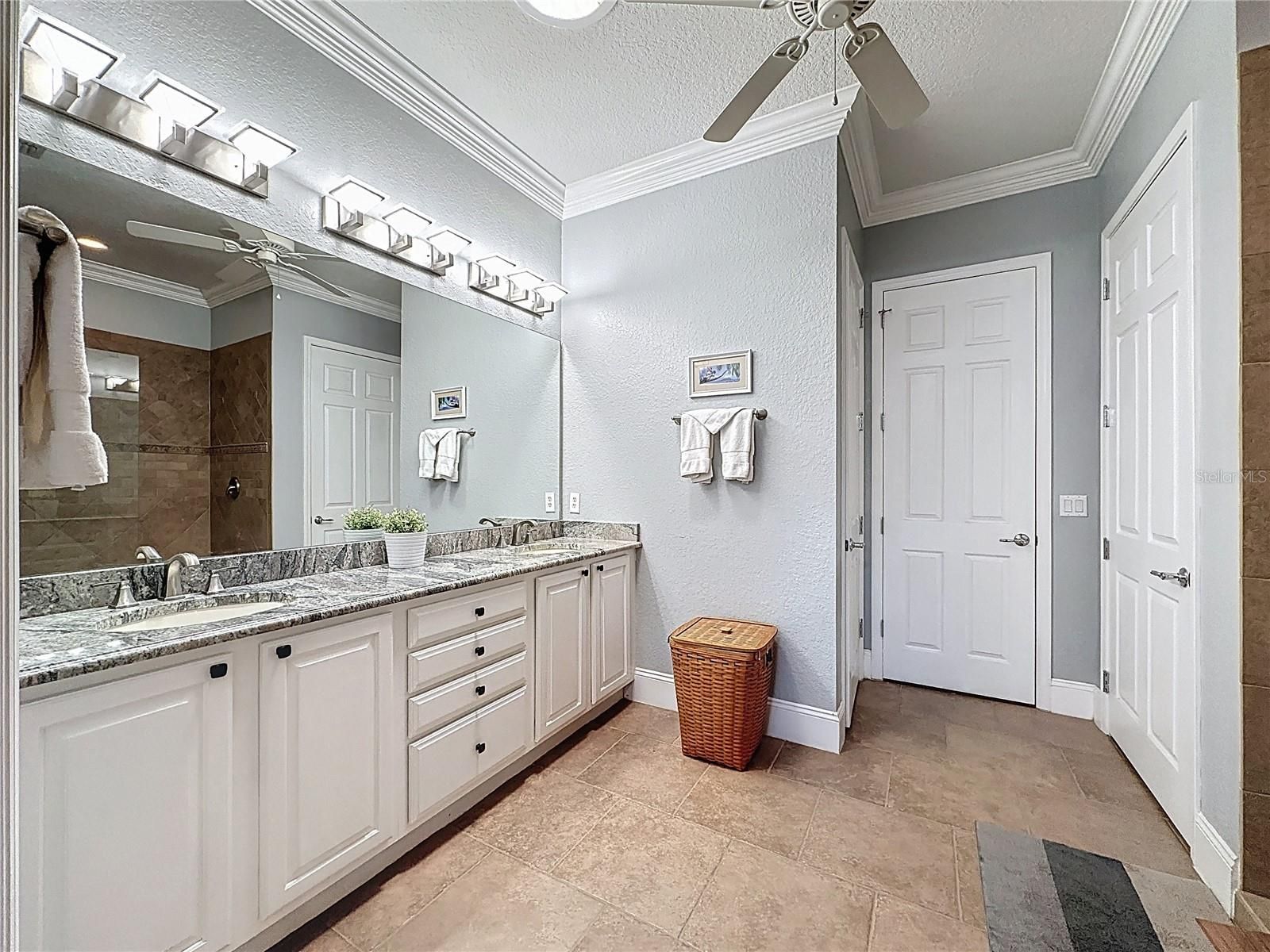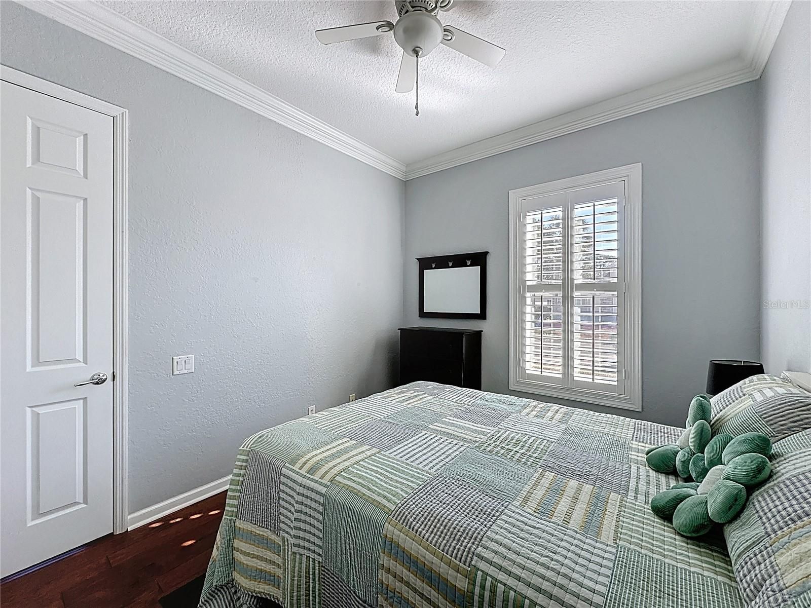 - Ceiling Fan(s), Crown Molding, Eat-in Kitchen, Open Floorplan, Main Level Primary, Solid-Wood Cabinets, Split Bedrooms, Stone Counters, Thermostat, Walk-In Closet(s)