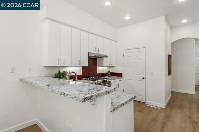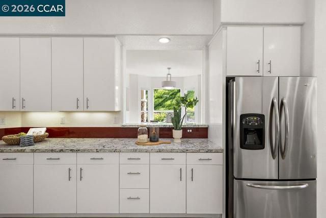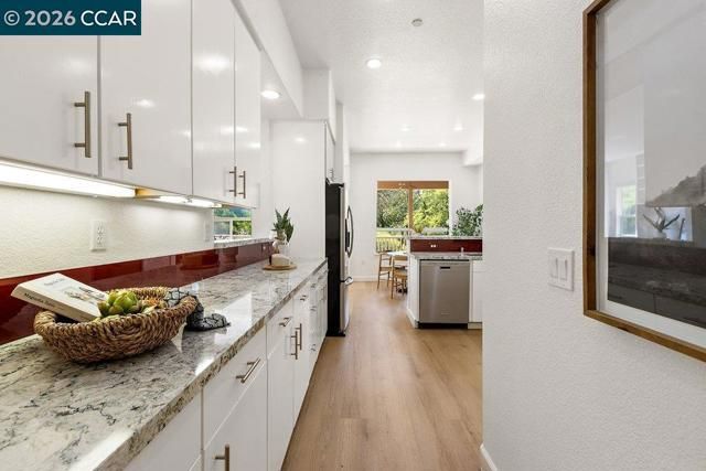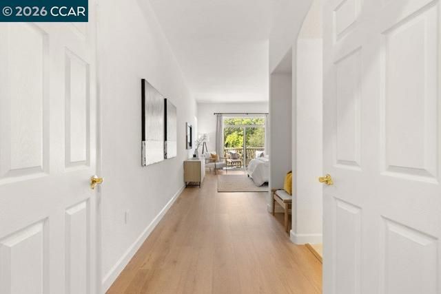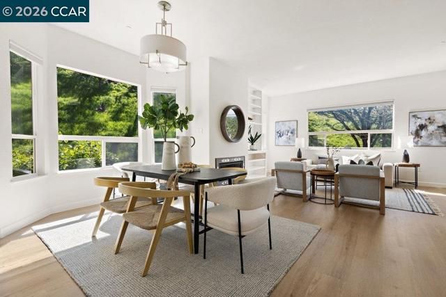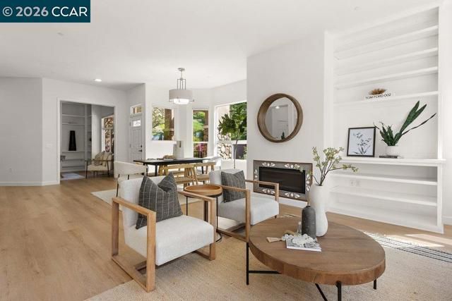 Welcome to this Eagle Ridge end-unit condo located in the lone building situated on a private cul-de-sac surrounded by a picturesque setting. The pathway to the home provides level-in access to the front door and the attached garage with interior access keeps you protected from the elements throughout the year. Step inside and enjoy over 2,000 square feet of modern Rossmoor living with high ceilings, stylish plank hardsurface flooring, and sleek, smooth front cabinetry in the Kitchen and both baths. The property has been reconfigured with a wall removed between the Dining Room and Living Room, making the space feel large and welcoming. A gas fireplace provides instance ambiance with a push of a button and built-in cabinetry allows the perfect place for displaying your treasures. Floor-to-ceiling bookshelves have been added in the Den, making the perfect home library or studio. Downsizing is not an issue with an enormous walk-in closet off the Primary Bathroom that has been all finished out with a custom storage solution system. Home chefs will appreciate the gas stove and the abundance of counter and cabinet space and rare walk-in pantry in this massive Kitchen.