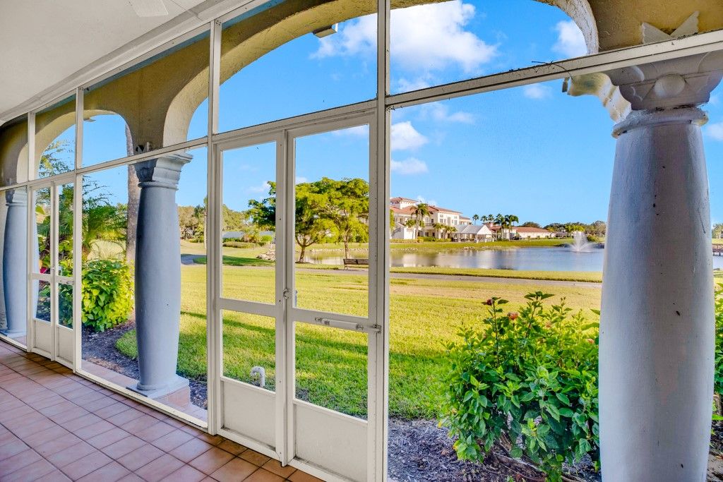 Best view in Harmony Island. Lake view w/ fountain, and golf course. Southern exposure adds extra light. $20k assessment paid in full, re-piped, A/C 2025. Magnificent Sunsets from your large screened 30ft porch. 2 dogs allowed, no weight limit. Community allows rentals 12x a year. Resort style pool/hot tub. Sizes are approx/subj to error.