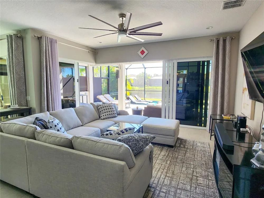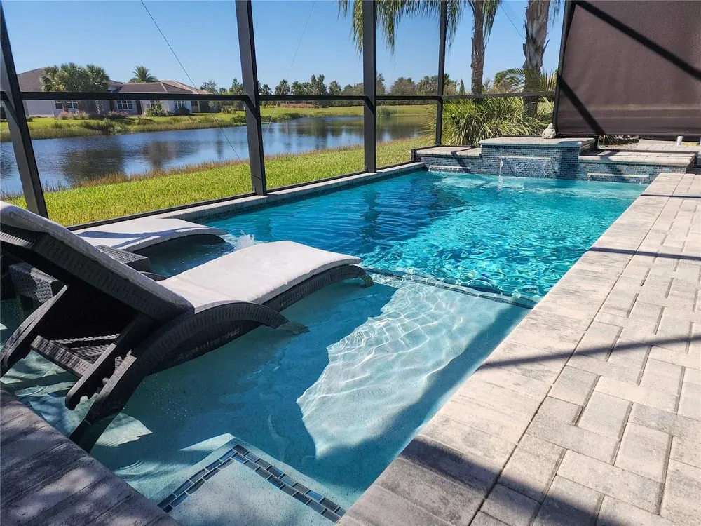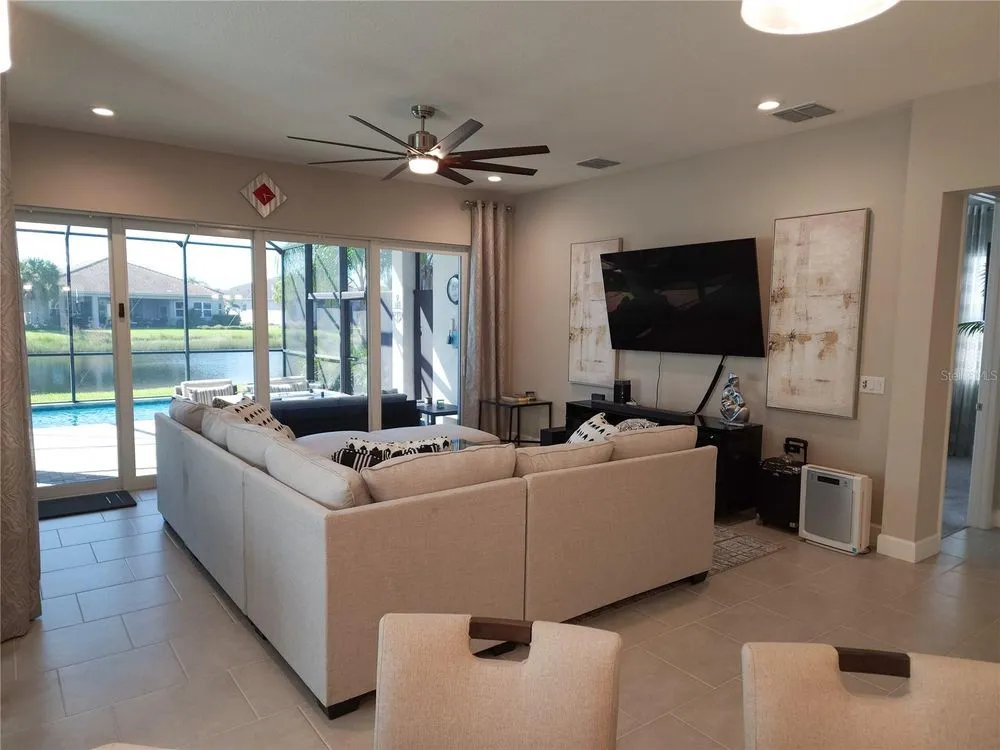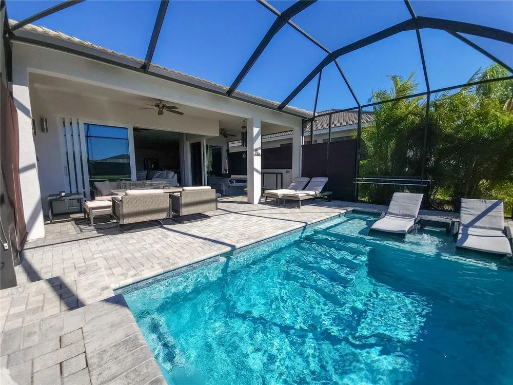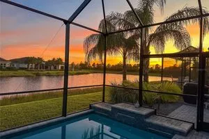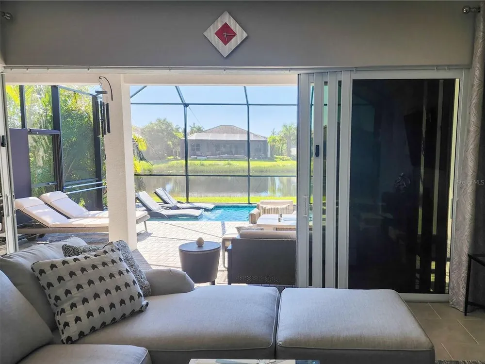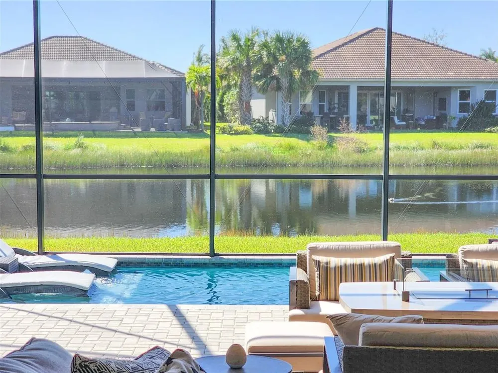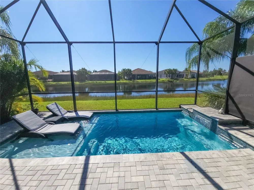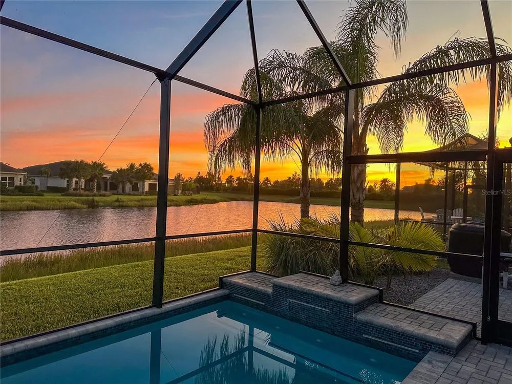 Welcome to luxury living in a secure, gated 55+ community that offers resort-style amenities. Enjoy the pool, socialize at the on-site café and bar, or see Broadway style shows at the on-site theater. Stay active with a well-equipped gym, tennis, pickleball, and bocce ball courts. Dive into your hobbies in the crafts and card rooms, Billiards room or unwind at the dog parks and fire pit's. Living here feels like being on vacation in a community designed for style, comfort, and active living! Step into this inviting home through an impact-resistant glass front door, where the Great Room with coffered ceilings opens to an L-shaped Lanai and extended screen room and pool overlooking a serene lake. The Gourmet Kitchen features stainless steel appliances, quartz countertops, and soft-close cabinetry, while the dining options span from a formal Dining Room to a casual breakfast area. Relax in the private Master Suite with expansive views, custom closets, and a frameless glass shower. Additional highlights include a versatile den/ 3rd bedroom, LED lighting, climate control with humidity settings, and a Carrier variable-speed air handler. Outdoors, enjoy a custom pool with sun-shelf, automation, salt chlorination, and privacy blinds, all set on a beautiful paver deck within a screened enclosure. Upgrades include a tankless gas water heater, whole-house water softener, UV-light air filtration, custom garage epoxy flooring, and LG laundry and kitchen appliances. You need to come see this amazing property and feel the stress melt away. This home can be yours, and you will want it to be!