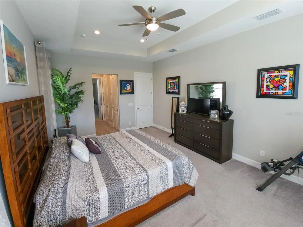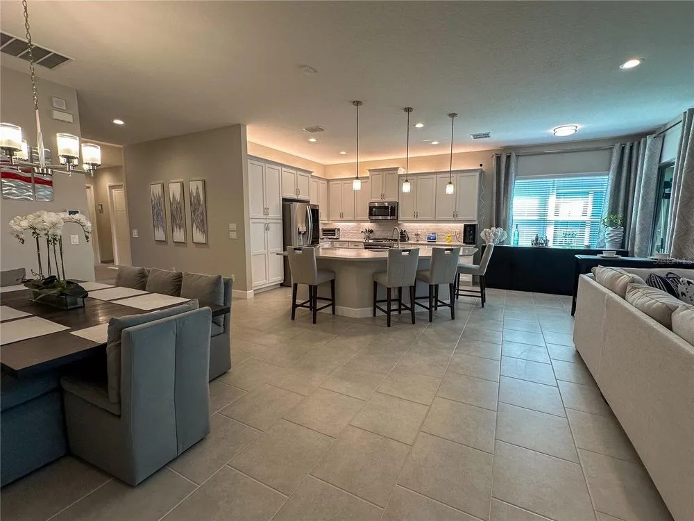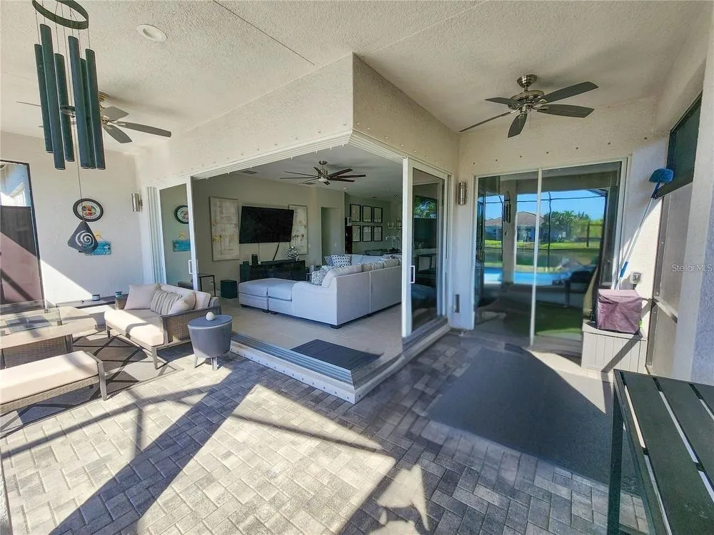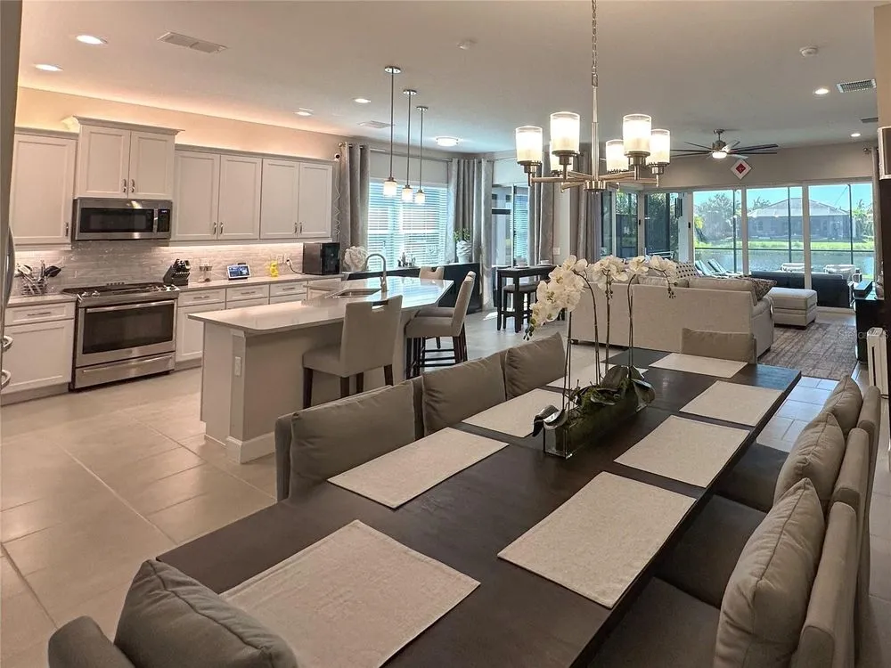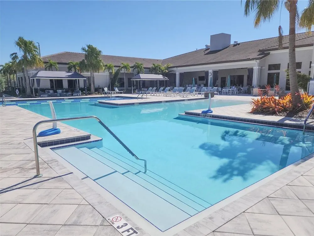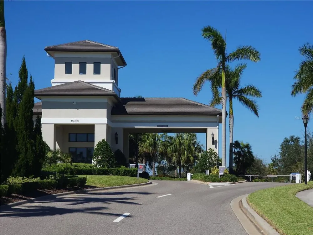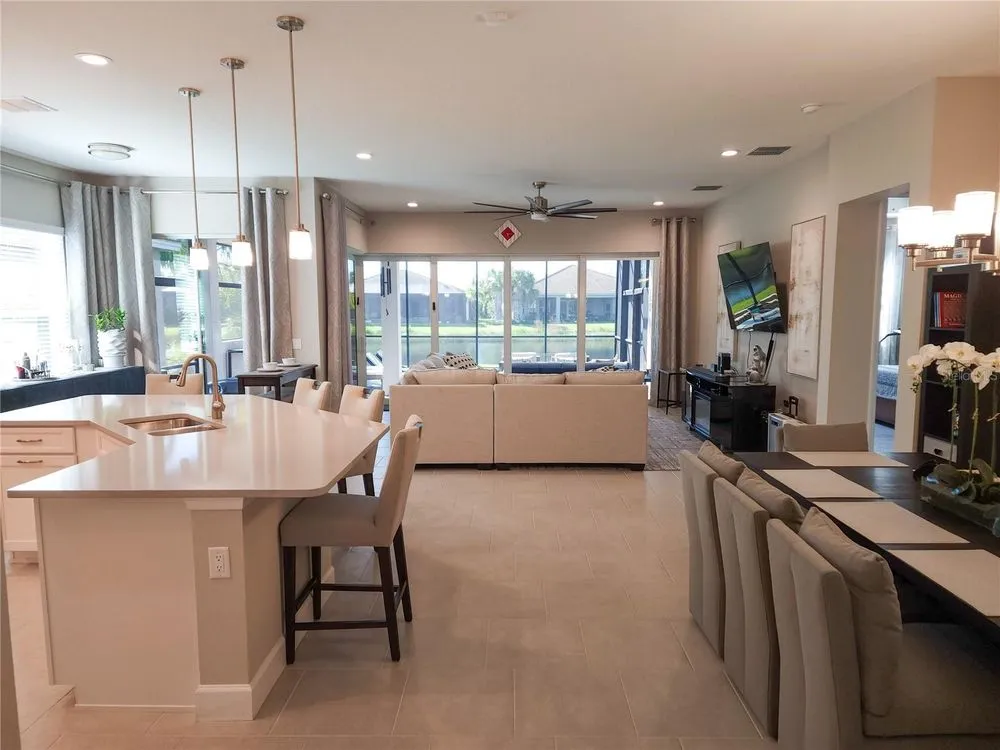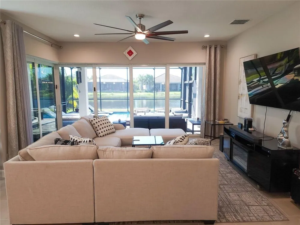 Welcome to luxury living in a secure, gated 55+ community that offers resort-style amenities. Enjoy the pool, socialize at the on-site café and bar, or see Broadway style shows at the on-site theater. Stay active with a well-equipped gym, tennis, pickleball, and bocce ball courts. Dive into your hobbies in the crafts and card rooms, Billiards room or unwind at the dog parks and fire pit's. Living here feels like being on vacation in a community designed for style, comfort, and active living! Step into this inviting home through an impact-resistant glass front door, where the Great Room with coffered ceilings opens to an L-shaped Lanai and extended screen room and pool overlooking a serene lake. The Gourmet Kitchen features stainless steel appliances, quartz countertops, and soft-close cabinetry, while the dining options span from a formal Dining Room to a casual breakfast area. Relax in the private Master Suite with expansive views, custom closets, and a frameless glass shower. Additional highlights include a versatile den/ 3rd bedroom, LED lighting, climate control with humidity settings, and a Carrier variable-speed air handler. Outdoors, enjoy a custom pool with sun-shelf, automation, salt chlorination, and privacy blinds, all set on a beautiful paver deck within a screened enclosure. Upgrades include a tankless gas water heater, whole-house water softener, UV-light air filtration, custom garage epoxy flooring, and LG laundry and kitchen appliances. You need to come see this amazing property and feel the stress melt away. This home can be yours, and you will want it to be!