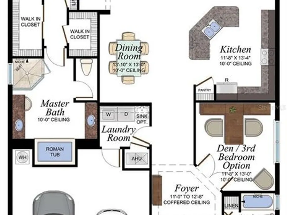 - Coffered Ceiling(s), Eat-in Kitchen, High Ceilings, Open Floorplan, Solid Surface Counters, Split Bedrooms, Thermostat, Walk-In Closet(s)