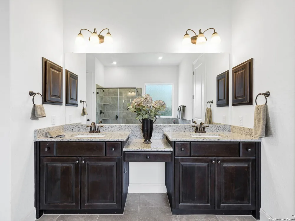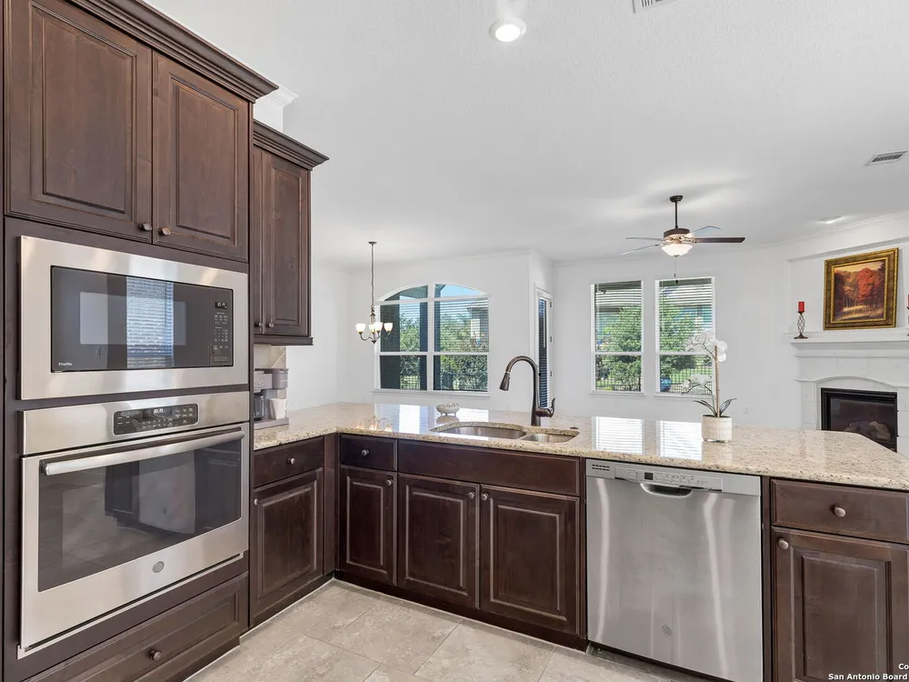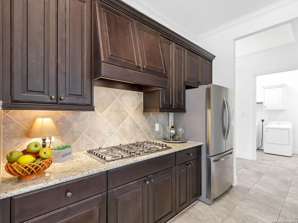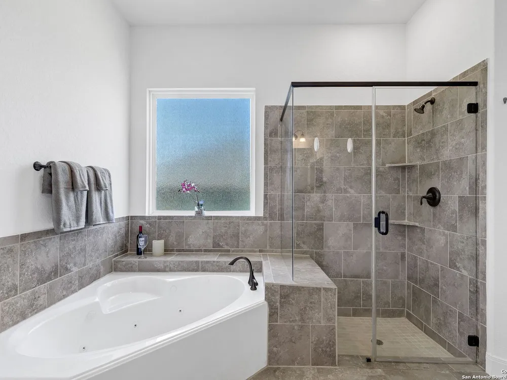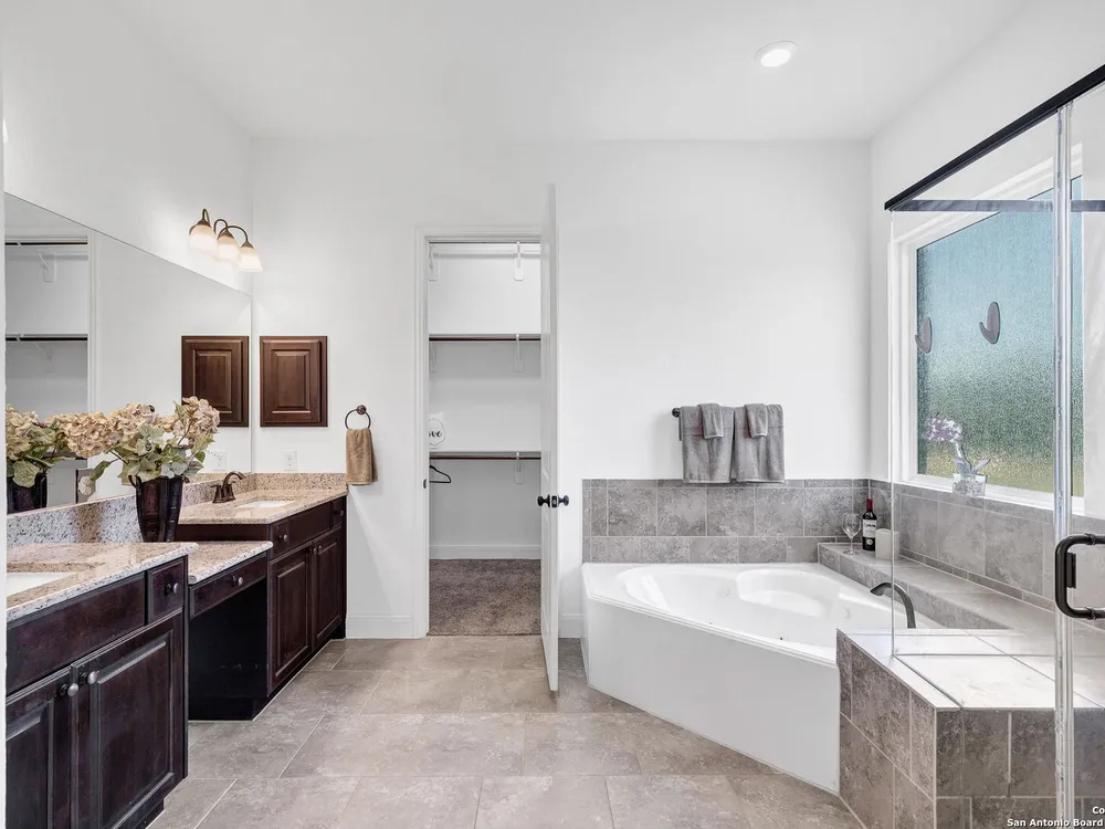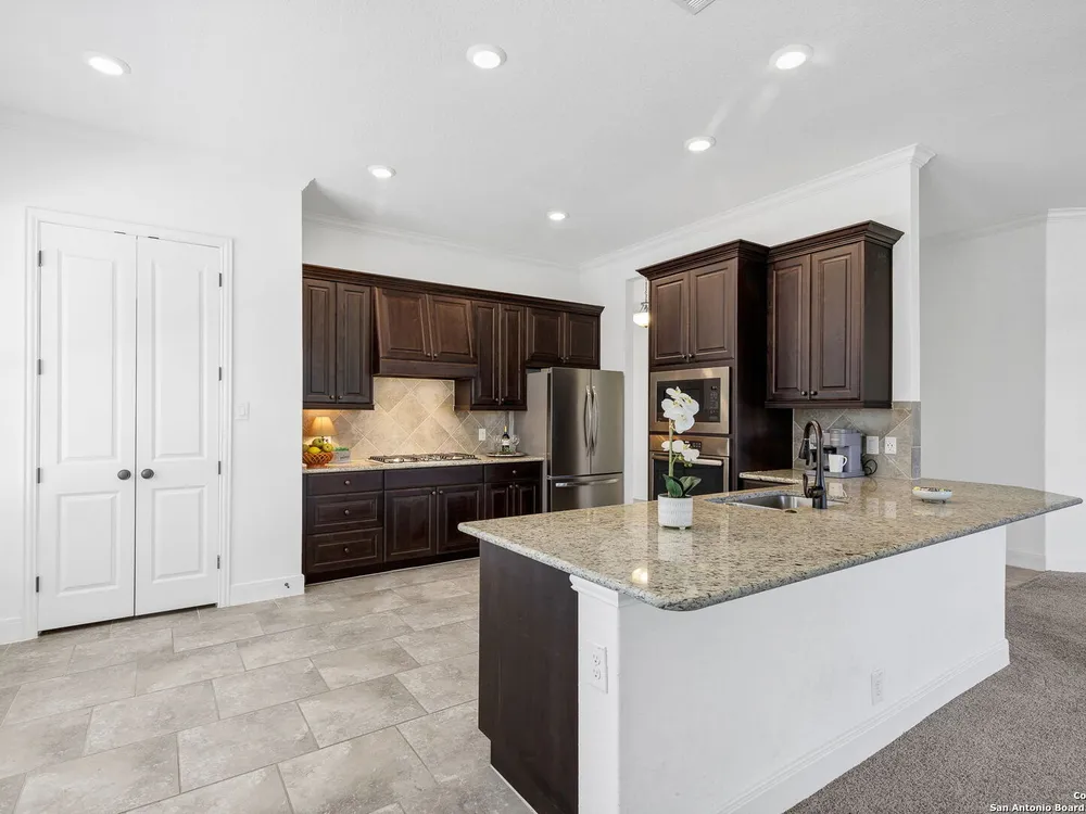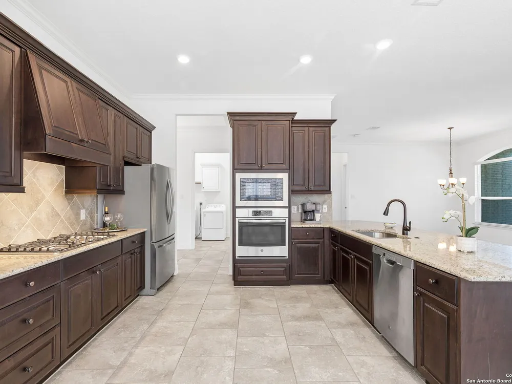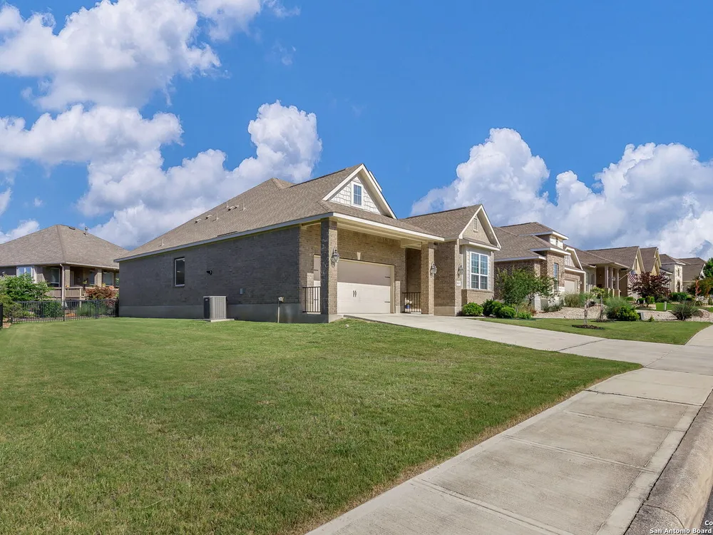 Here's your chance to own a truly elegant home at an affordable price. This 3 bedroom gem built by Village Builders has all the bells and whistles. Chefs kitchen features custom cabinetry, stainless appliances, gas cook top, and spacious pantry. Granite countertops throughout, 10 foot ceilings, generous crown molding, oversized laundry and open floor plan. The primary suite overlooks the back yard and features luxurious dual vanities, garden tub and separate shower, and did I mention the huge closet? The yard is spacious and landscaping is in great condition. The community resort features ballroom, meeting rooms, library, state of the art gym, indoor pool and spa, two outdoor pools and spa, pickle ball and much more. It's time to pack your bags and get ready to enjoy the good life at Del Webb San Antonio Hill Country Retreat!