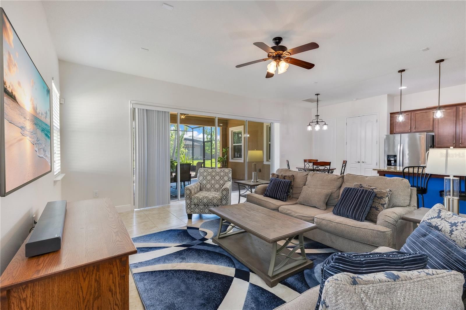 Resort style living in Twin Lakes, a gated 55+ active adult community on Live Oak Lake in St. Cloud. Enjoy maintenance free exterior and lawn care. This home starts with a paver driveway and tropical landscaping. Inside, high ceilings and large tile floors frame a bright open layout connecting the living area, dining space, and kitchen. The kitchen features granite countertops, wood cabinetry, a gas range, pendant lighting, and a large island for gatherings. Split bedrooms deliver privacy in the primary suite with tray ceiling, walk in closet, and a spa bath with frameless glass shower, dual shower heads, and bench. Two additional bedrooms and a guest bath support guests, office, or hobbies. Laundry room includes upper cabinets, utility sink, and a folding counter. Pocketing sliders open to an oversized screened lanai spanning nearly the full width of the home, with covered and open areas for grilling, dining, and lounging. Twin Lakes amenities include a lakefront clubhouse, fitness center, full time activities director, resort pool, heated lap pool, spa, pickleball, tennis, bocce, basketball, putting green, trails, dog parks, grilling pavilion, fire pit, and a private pier and boat dock for boating, kayaking, paddleboarding, and fishing. Close to US 192 shopping and dining, Lake Nona Medical City, Florida Turnpike access, and Orlando International Airport