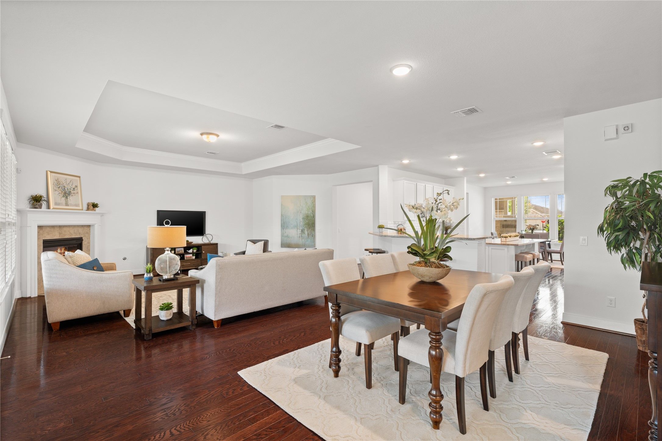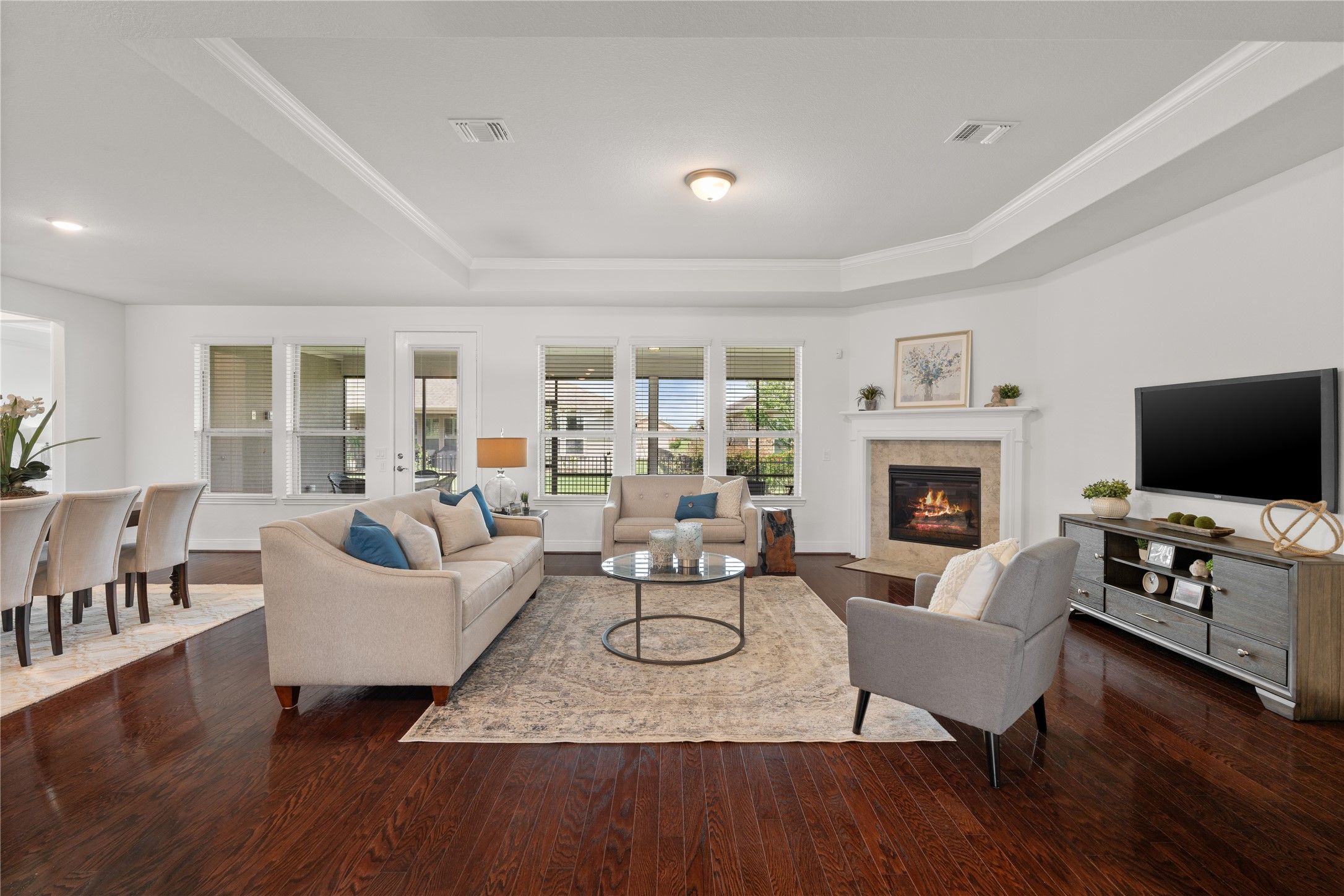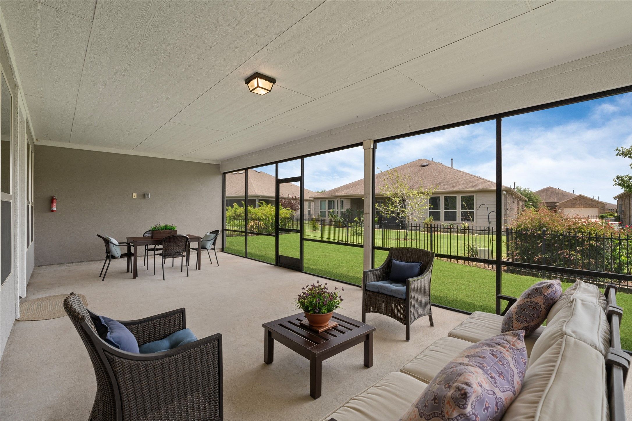 Tangerly Oak, offering 2BR/2.5BA + study, perfectly placed on oversized corner lot in 55+ Del Webb. Exterior showcases striking blend of Tx limestone & stucco, delivering clean, transitional style that sets home apart. Step inside & feel warmth of wd flooring that flows through main living, plush carpet in BR's & cozy corner fireplace — ideal for quiet evenings. Bright, white kit is truly heart of home, featuring upgraded granite counters, SS appls, gas cooktop, walk-in pantry, & oversized island. Breakfast nook offers inviting dining space w/natural light. Freshly painted in soft, neutral tone enhances home's airy, welcoming feel. No tubs — primary BA w/shower & built-in bench. Versatile study offers perfect workspace w/tranquil views of park just across the street. Outdoors, sprawling 38 x 14 screened-in patio invites yr-round relaxation, opening to fenced backyard w/room to garden or simply unwind. Tray ceilings in both Gathering Rm & Primary Suite add subtle architectural elegance.
