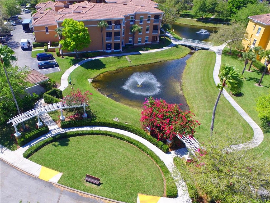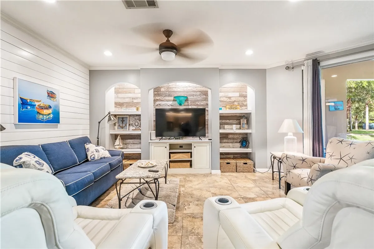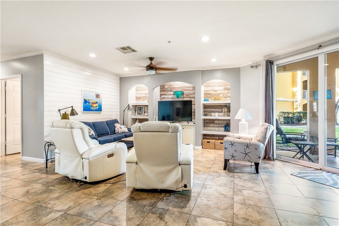 Turnkey 1st-floor condo offers effortless coastal style. Inside, a curated coastal design shines: chic shiplap wall, crown molding, & arched built-ins add character to the open floor plan while the kitchen gleams w/Quartz counters & SS appls. Sip your coffee w/tranquil pond views from the covered patio. Impact glass ensures peace of mind. Enjoy carefree living b/c life here is a permanent vacation-challenge friends to tennis or pickleball, relax by the resort-style pool & hot tub, or let your pup play in the fenced dog park. Centrally located near the beach, top dining, Riverside Theater, more