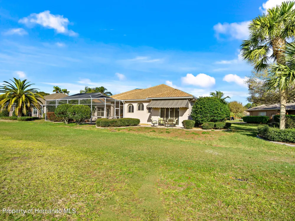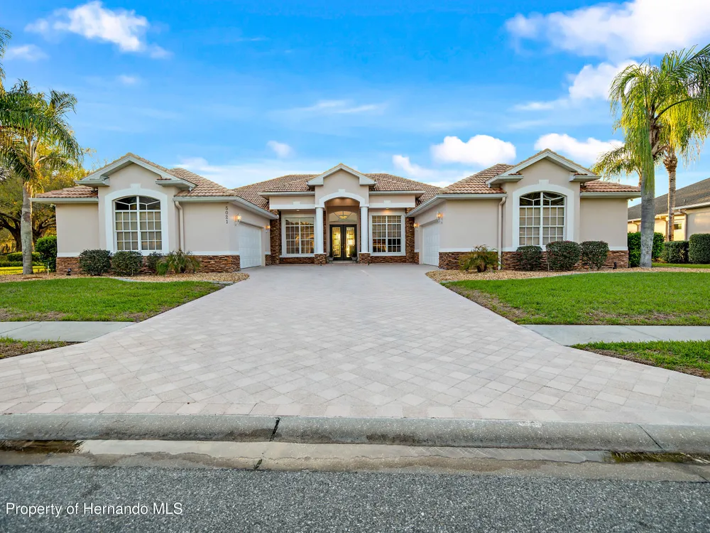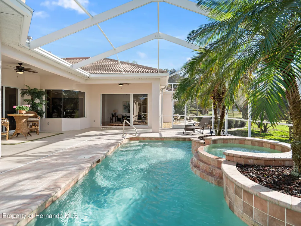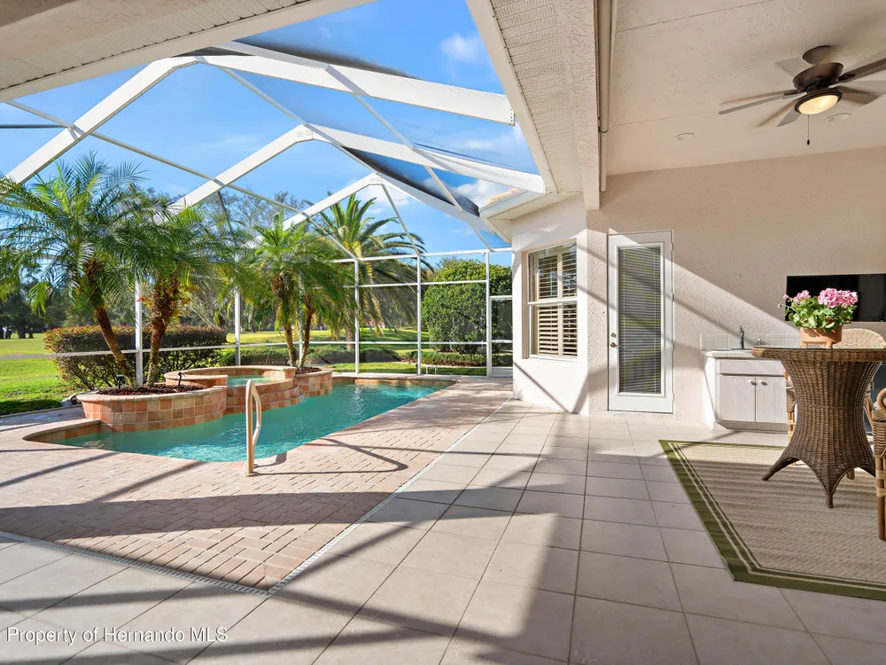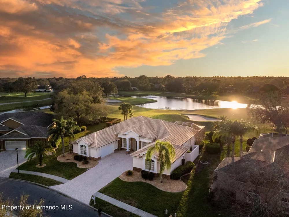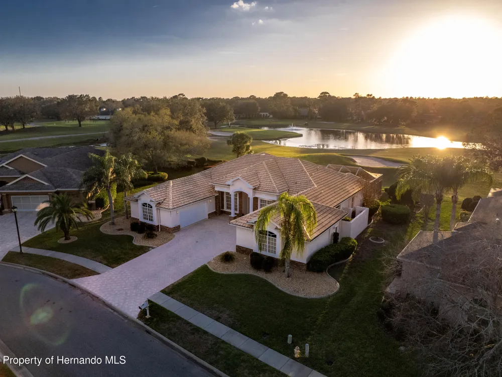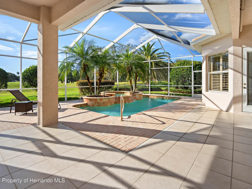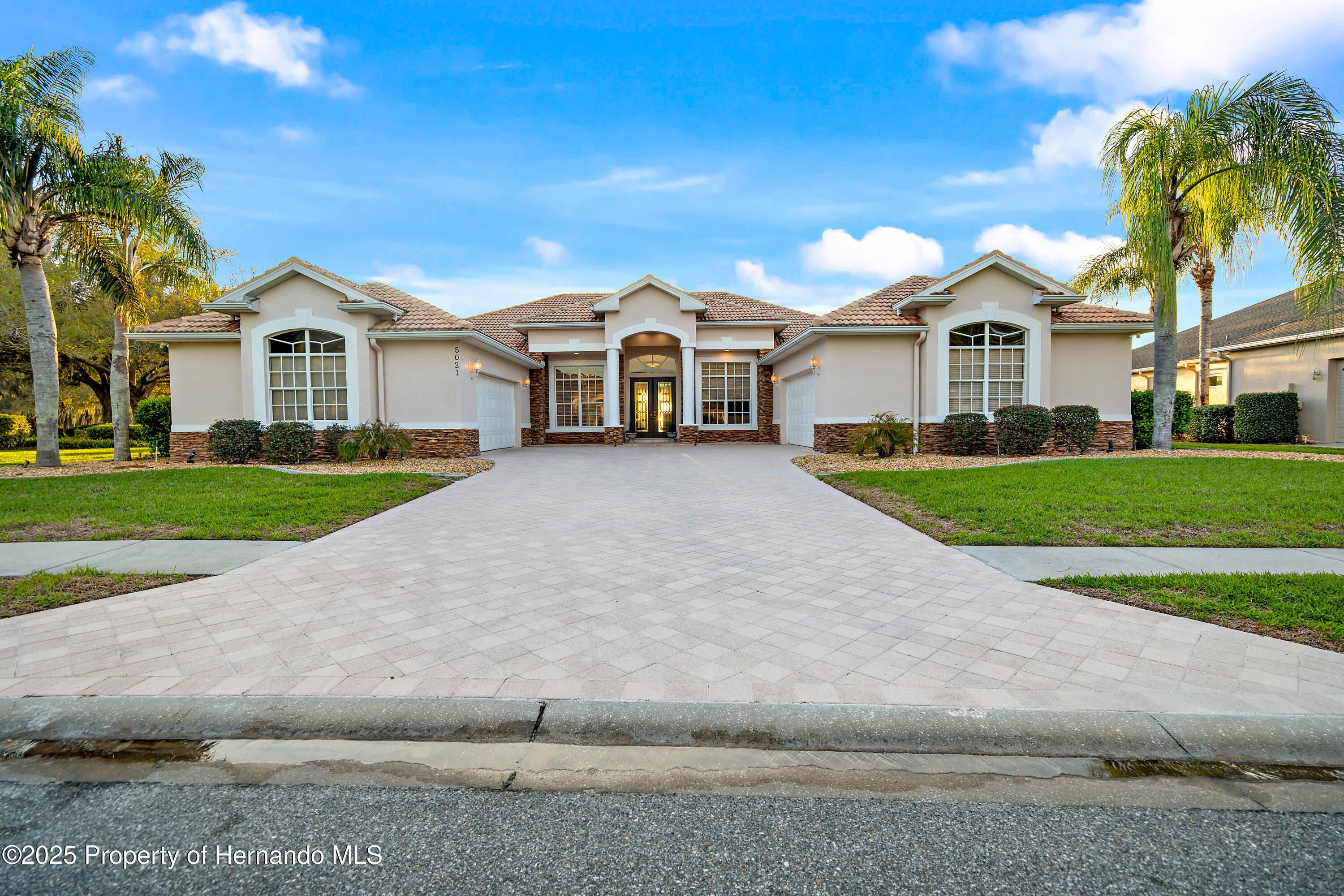 Tucked within the prestigious guard-gated Silverthorn Golf & Country Club community, this exquisite 4-bedroom, 4-bathroom estate blends timeless elegance, thoughtful craftsmanship, and serene golf course living. Meticulously maintained and tastefully upgraded, the home showcases soaring 12-foot ceilings, rich hardwood flooring, and over 70 custom cabinets and drawers thoughtfully placed throughout for optimal storage. The striking exterior features a wide pavered driveway, manicured landscaping, a Mediterranean-style tile roof, and eye-catching stone accents. Twin oversized 2-car garages with newer epoxy-coated floors are discreetly positioned on either side, offering ample room for vehicles, hobbies, or storage. A grand covered entry opens into a welcoming foyer flanked by a formal dining room on one side and a sophisticated office or den on the other, all grounded by elegant hardwood flooring. The formal living room centers around a stone gas fireplace and opens through sliding glass doors to a breathtaking lanai overlooking the 18th hole. Just beyond, the sunlit breakfast nook is surrounded by windows that maximize natural light and showcase the tranquil view. The heart of the home—a spectacular kitchen—is both functional and beautifully appointed with granite countertops and backsplash, a large center island with built-in wine racks and cabinetry, double convection wall ovens, a cooktop, a breakfast bar with double sink, and an exceptional volume of custom wood cabinetry beneath soaring ceilings. The kitchen flows seamlessly into a spacious family room featuring a dramatic triple trey ceiling, detailed crown molding, and another triple sliding door bringing the outdoors in. The luxurious primary suite serves as a peaceful retreat with tray ceilings, crown molding, private lanai access, a full wall of windows offering sweeping golf course views, and dual walk-in closets. The spa-like ensuite bathroom offers a jacuzzi garden tub with views of a private courtyard (with water and electric hookups), a large walk-in shower, dual vanities, a seated vanity space, and a private water closet. A generously sized second bedroom (20x13) is ideal as an in-law or guest suite and features private access to a serene patio with golf course views. The screened lanai is a showstopper, boasting a heated pool and spa with an in-floor cleaning system, brick paver decking, and a covered outdoor kitchen area with sink and refrigerator. Additional upgrades include hurricane-rated windows, a central vacuum system, a security system, commercial-grade water softener, 2019 Rheem dual-zone HVAC systems with NP2 filters and UV light, a newer Rheem Prestige water heater, exterior paint (2017), and an irrigation well for landscape maintenance. Residents of Silverthorn enjoy resort-style amenities including an Olympic-sized pool, tennis, pickleball, and basketball courts, a fitness center, library, activity rooms, and a stately clubhouse with a restaurant, bar, ballrooms, and golf pro shop. Just 2.5 miles from the Suncoast Parkway, this location offers a direct and convenient commute to Tampa. Nearby attractions include Weeki Wachee Springs State Park (9.5 miles), Hernando Beach (14 miles), and the Nature Coast Botanical Gardens (6 miles), making this home a rare blend of luxury, lifestyle, and location. Includes a 10K allowance for home decor like new carpet and interior painting with a full price offer.