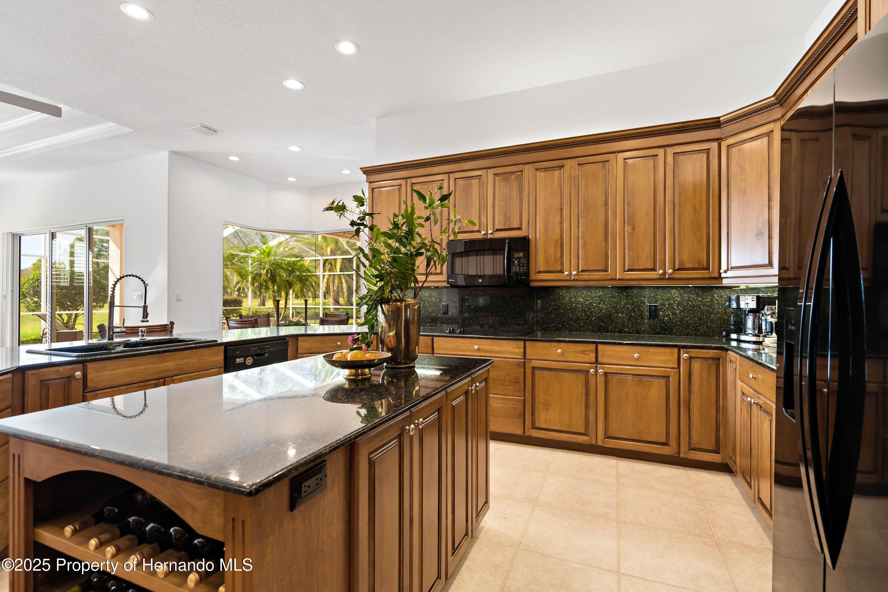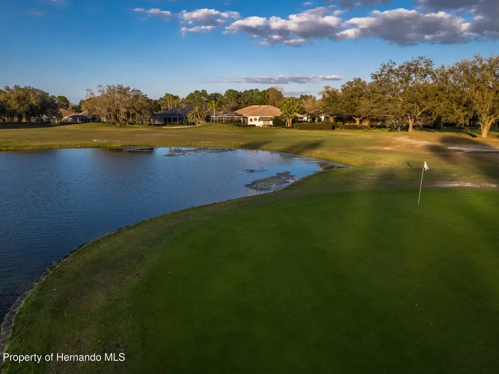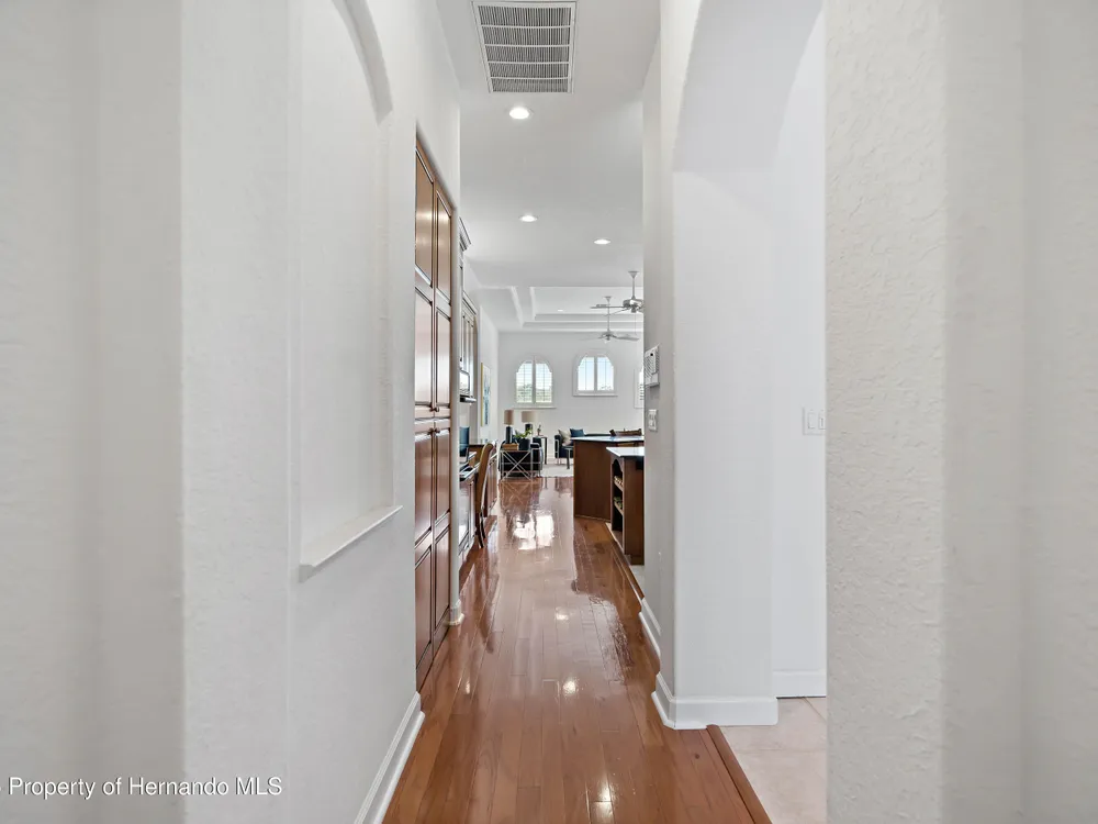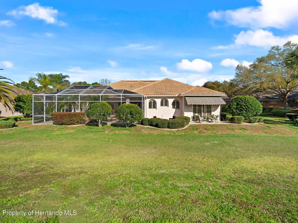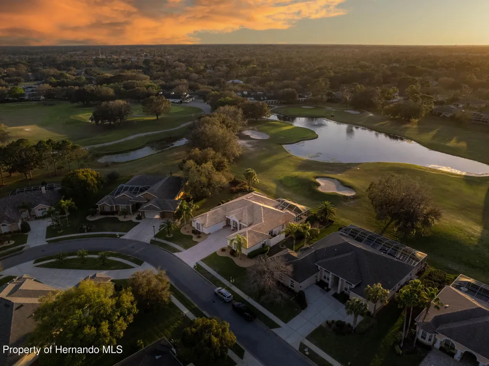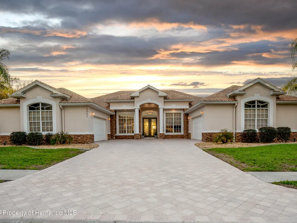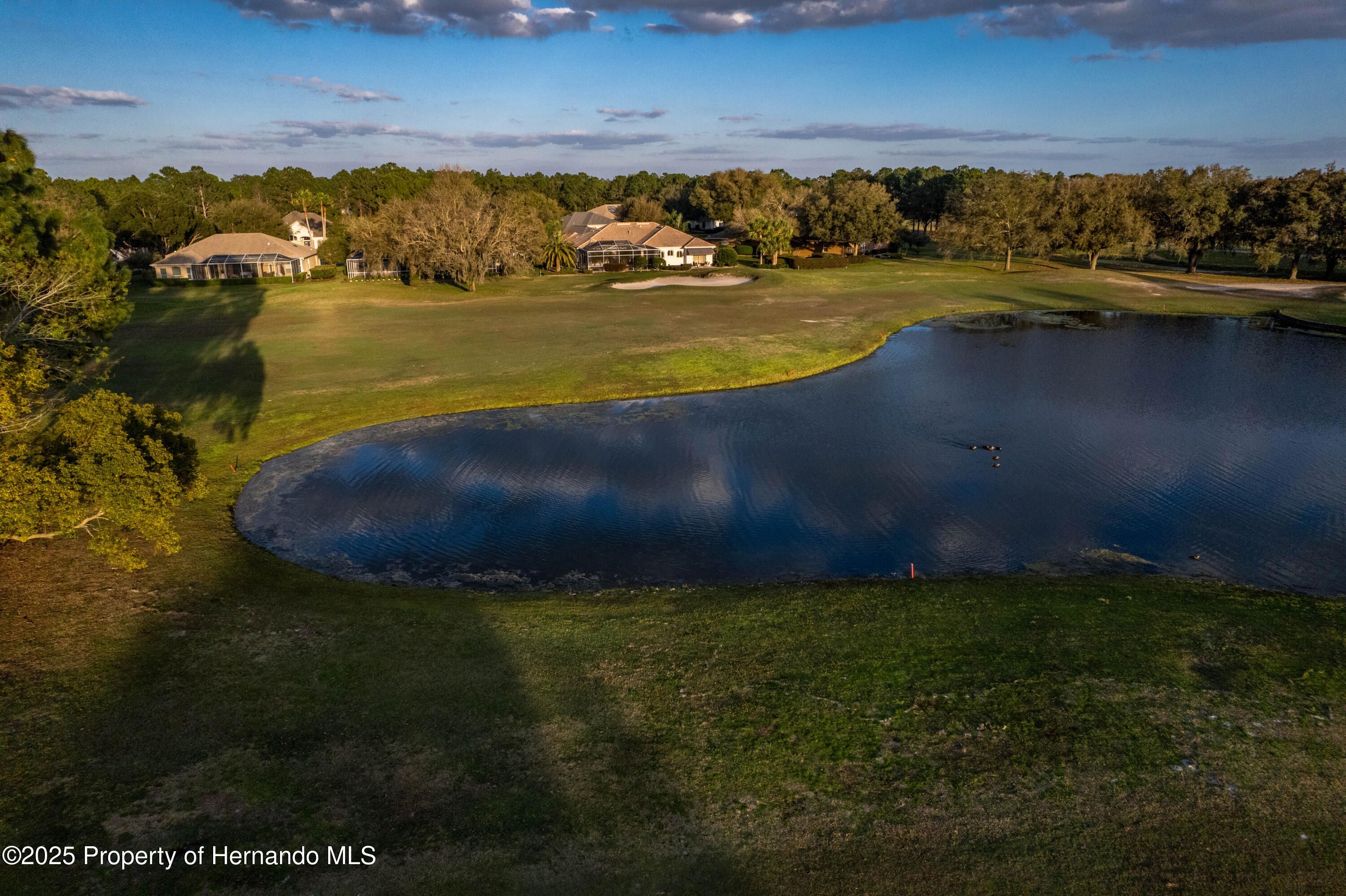 Tucked within the prestigious guard-gated Silverthorn Golf & Country Club community, this exquisite 4-bedroom, 4-bathroom estate blends timeless elegance, thoughtful craftsmanship, and serene golf course living. Meticulously maintained and tastefully upgraded, the home showcases soaring 12-foot ceilings, rich hardwood flooring, and over 70 custom cabinets and drawers thoughtfully placed throughout for optimal storage. The striking exterior features a wide pavered driveway, manicured landscaping, a Mediterranean-style tile roof, and eye-catching stone accents. Twin oversized 2-car garages with newer epoxy-coated floors are discreetly positioned on either side, offering ample room for vehicles, hobbies, or storage. A grand covered entry opens into a welcoming foyer flanked by a formal dining room on one side and a sophisticated office or den on the other, all grounded by elegant hardwood flooring. The formal living room centers around a stone gas fireplace and opens through sliding glass doors to a breathtaking lanai overlooking the 18th hole. Just beyond, the sunlit breakfast nook is surrounded by windows that maximize natural light and showcase the tranquil view. The heart of the home—a spectacular kitchen—is both functional and beautifully appointed with granite countertops and backsplash, a large center island with built-in wine racks and cabinetry, double convection wall ovens, a cooktop, a breakfast bar with double sink, and an exceptional volume of custom wood cabinetry beneath soaring ceilings. The kitchen flows seamlessly into a spacious family room featuring a dramatic triple trey ceiling, detailed crown molding, and another triple sliding door bringing the outdoors in. The luxurious primary suite serves as a peaceful retreat with tray ceilings, crown molding, private lanai access, a full wall of windows offering sweeping golf course views, and dual walk-in closets. The spa-like ensuite bathroom offers a jacuzzi garden tub with views of a private courtyard (with water and electric hookups), a large walk-in shower, dual vanities, a seated vanity space, and a private water closet. A generously sized second bedroom (20x13) is ideal as an in-law or guest suite and features private access to a serene patio with golf course views. The screened lanai is a showstopper, boasting a heated pool and spa with an in-floor cleaning system, brick paver decking, and a covered outdoor kitchen area with sink and refrigerator. Additional upgrades include hurricane-rated windows, a central vacuum system, a security system, commercial-grade water softener, 2019 Rheem dual-zone HVAC systems with NP2 filters and UV light, a newer Rheem Prestige water heater, exterior paint (2017), and an irrigation well for landscape maintenance. Residents of Silverthorn enjoy resort-style amenities including an Olympic-sized pool, tennis, pickleball, and basketball courts, a fitness center, library, activity rooms, and a stately clubhouse with a restaurant, bar, ballrooms, and golf pro shop. Just 2.5 miles from the Suncoast Parkway, this location offers a direct and convenient commute to Tampa. Nearby attractions include Weeki Wachee Springs State Park (9.5 miles), Hernando Beach (14 miles), and the Nature Coast Botanical Gardens (6 miles), making this home a rare blend of luxury, lifestyle, and location. Includes a 10K allowance for home decor like new carpet and interior painting with a full price offer.