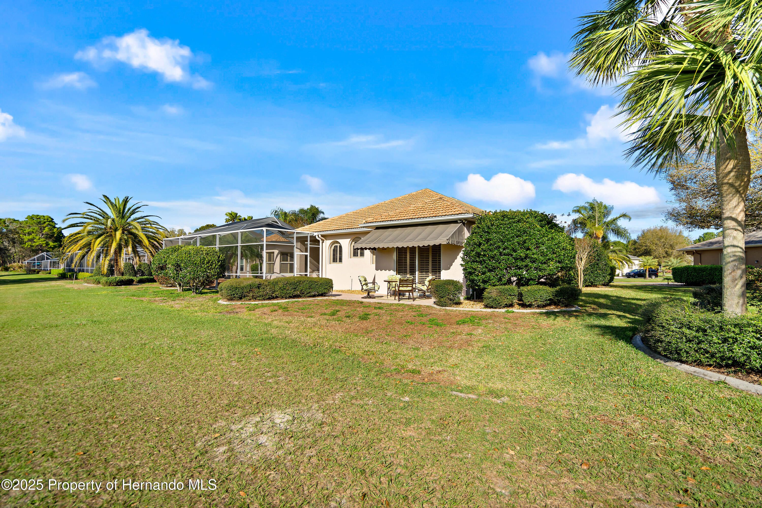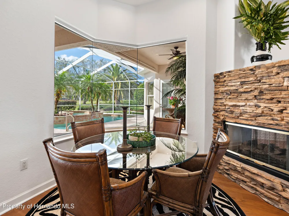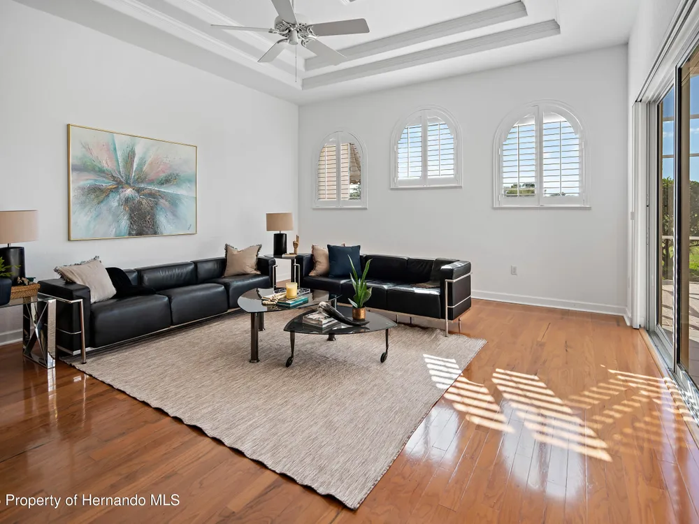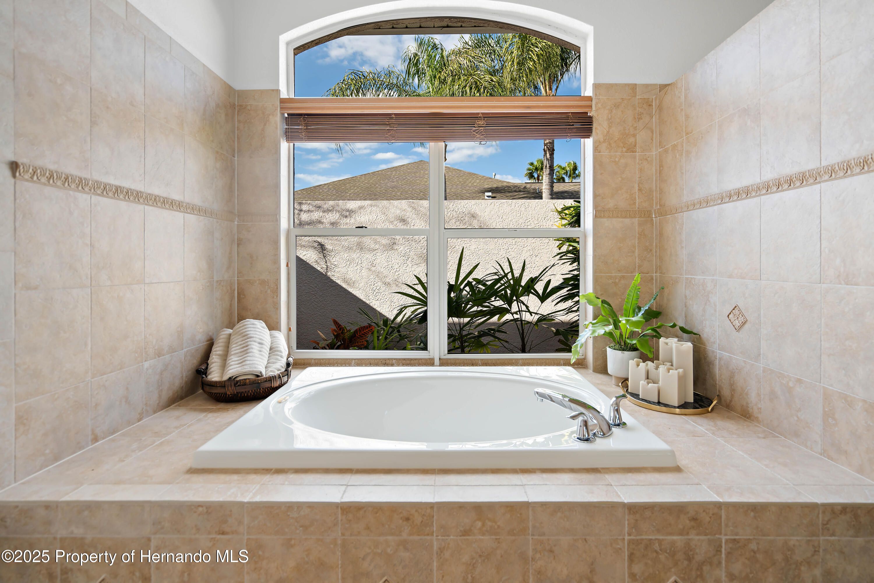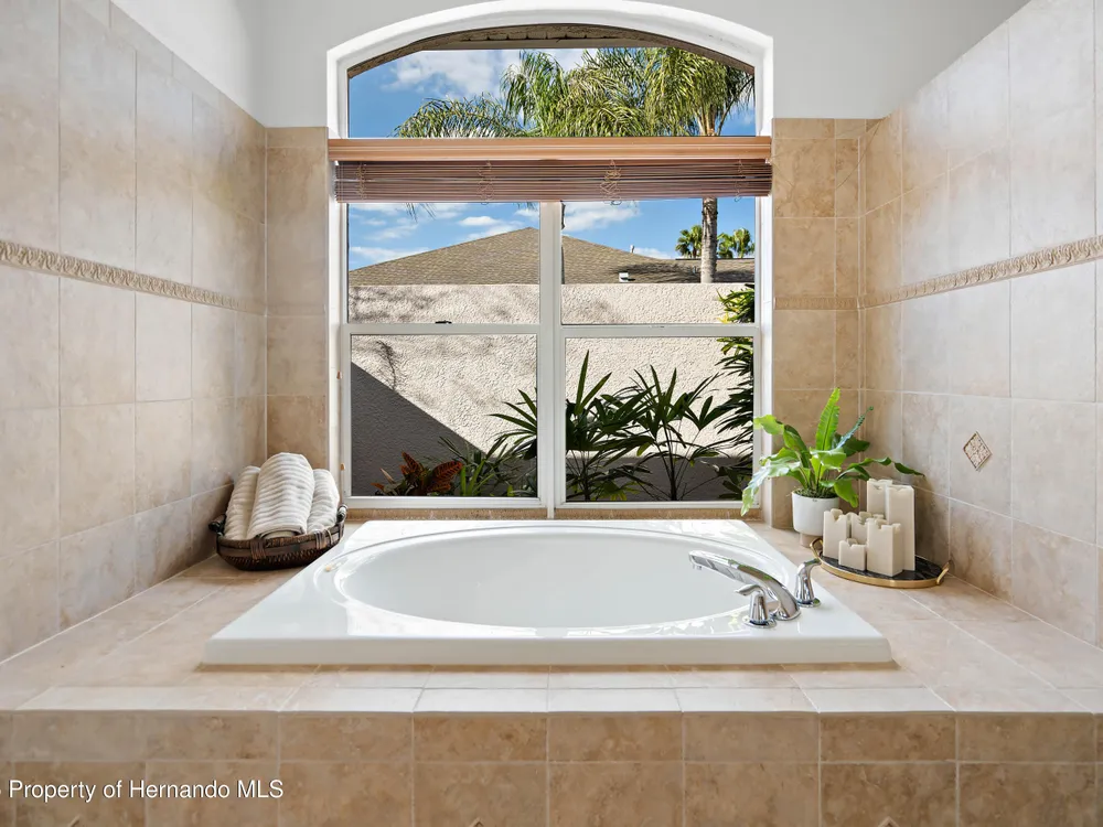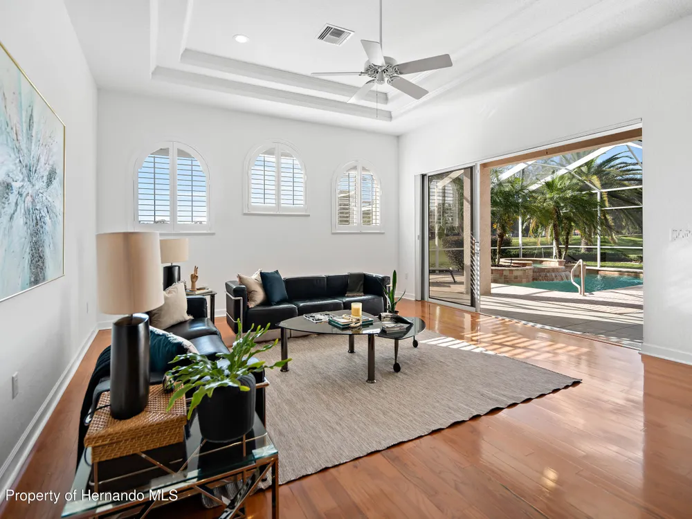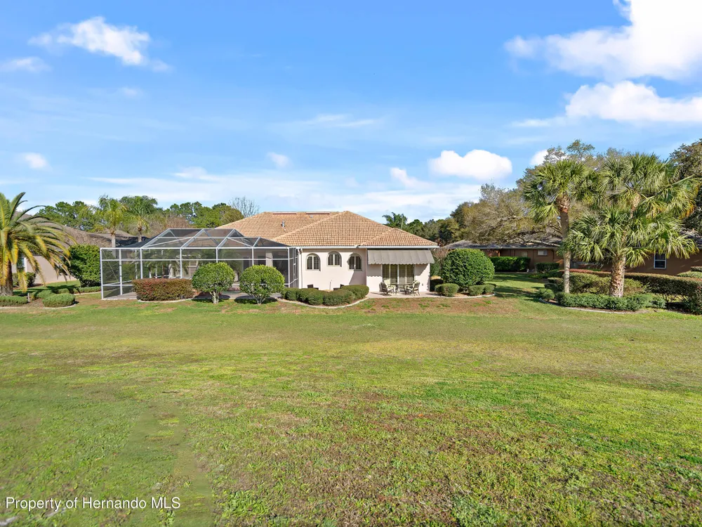 Tucked within the prestigious guard-gated Silverthorn Golf & Country Club community, this exquisite 4-bedroom, 4-bathroom estate blends timeless elegance, thoughtful craftsmanship, and serene golf course living. Meticulously maintained and tastefully upgraded, the home showcases soaring 12-foot ceilings, rich hardwood flooring, and over 70 custom cabinets and drawers thoughtfully placed throughout for optimal storage. The striking exterior features a wide pavered driveway, manicured landscaping, a Mediterranean-style tile roof, and eye-catching stone accents. Twin oversized 2-car garages with newer epoxy-coated floors are discreetly positioned on either side, offering ample room for vehicles, hobbies, or storage. A grand covered entry opens into a welcoming foyer flanked by a formal dining room on one side and a sophisticated office or den on the other, all grounded by elegant hardwood flooring. The formal living room centers around a stone gas fireplace and opens through sliding glass doors to a breathtaking lanai overlooking the 18th hole. Just beyond, the sunlit breakfast nook is surrounded by windows that maximize natural light and showcase the tranquil view. The heart of the home—a spectacular kitchen—is both functional and beautifully appointed with granite countertops and backsplash, a large center island with built-in wine racks and cabinetry, double convection wall ovens, a cooktop, a breakfast bar with double sink, and an exceptional volume of custom wood cabinetry beneath soaring ceilings. The kitchen flows seamlessly into a spacious family room featuring a dramatic triple trey ceiling, detailed crown molding, and another triple sliding door bringing the outdoors in. The luxurious primary suite serves as a peaceful retreat with tray ceilings, crown molding, private lanai access, a full wall of windows offering sweeping golf course views, and dual walk-in closets. The spa-like ensuite bathroom offers a jacuzzi garden tub with views of a private courtyard (with water and electric hookups), a large walk-in shower, dual vanities, a seated vanity space, and a private water closet. A generously sized second bedroom (20x13) is ideal as an in-law or guest suite and features private access to a serene patio with golf course views. The screened lanai is a showstopper, boasting a heated pool and spa with an in-floor cleaning system, brick paver decking, and a covered outdoor kitchen area with sink and refrigerator. Additional upgrades include hurricane-rated windows, a central vacuum system, a security system, commercial-grade water softener, 2019 Rheem dual-zone HVAC systems with NP2 filters and UV light, a newer Rheem Prestige water heater, exterior paint (2017), and an irrigation well for landscape maintenance. Residents of Silverthorn enjoy resort-style amenities including an Olympic-sized pool, tennis, pickleball, and basketball courts, a fitness center, library, activity rooms, and a stately clubhouse with a restaurant, bar, ballrooms, and golf pro shop. Just 2.5 miles from the Suncoast Parkway, this location offers a direct and convenient commute to Tampa. Nearby attractions include Weeki Wachee Springs State Park (9.5 miles), Hernando Beach (14 miles), and the Nature Coast Botanical Gardens (6 miles), making this home a rare blend of luxury, lifestyle, and location. Includes a 10K allowance for home decor like new carpet and interior painting with a full price offer.