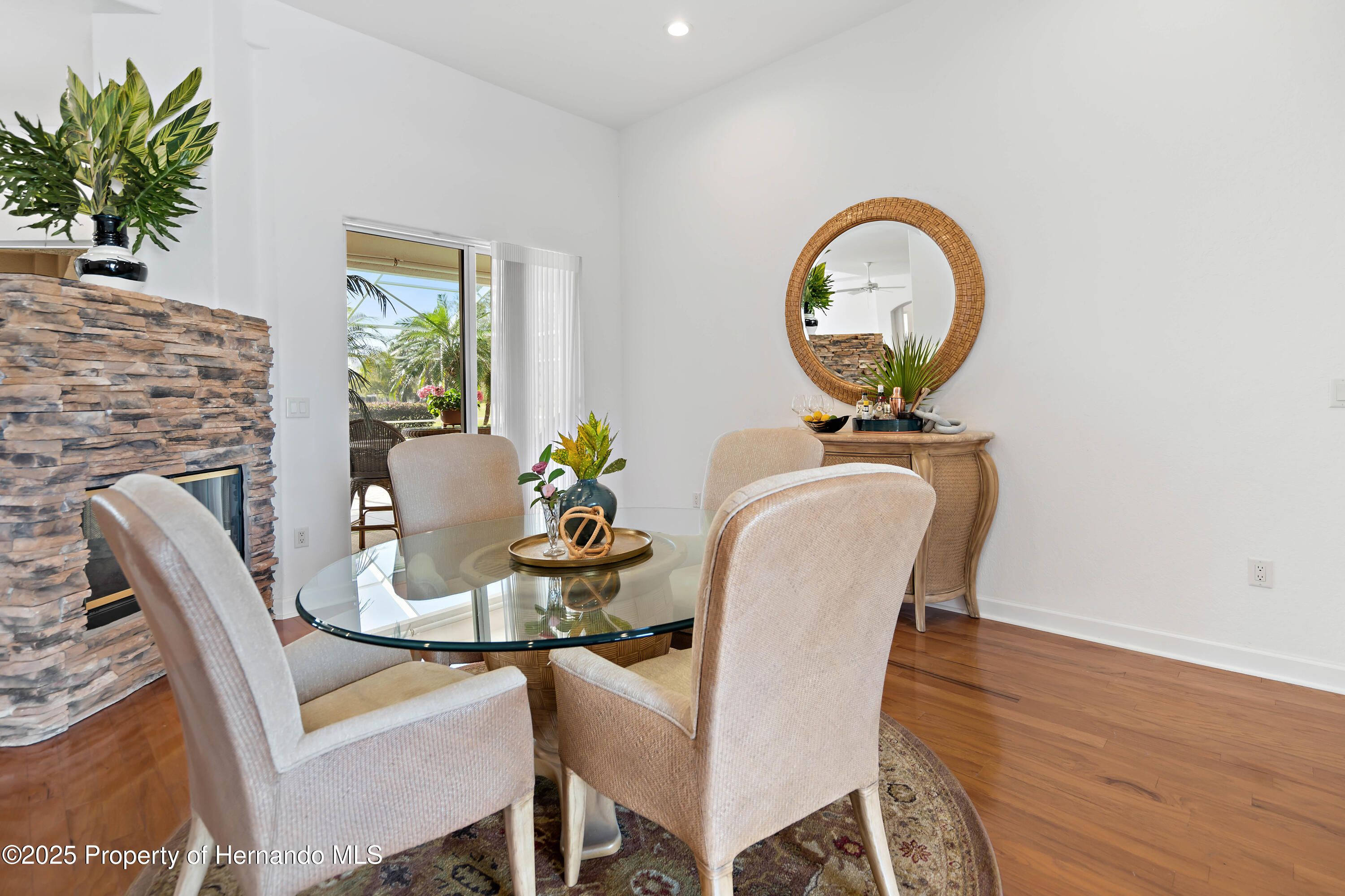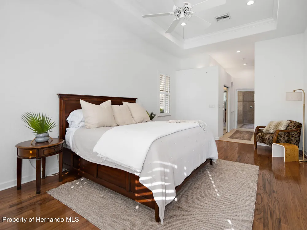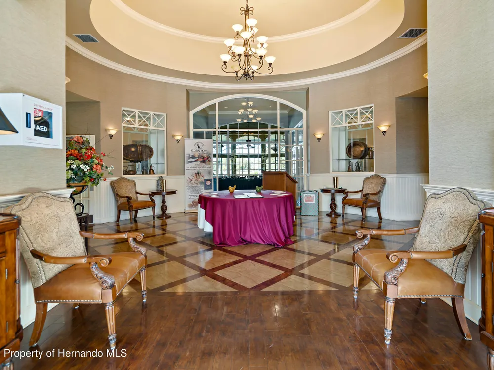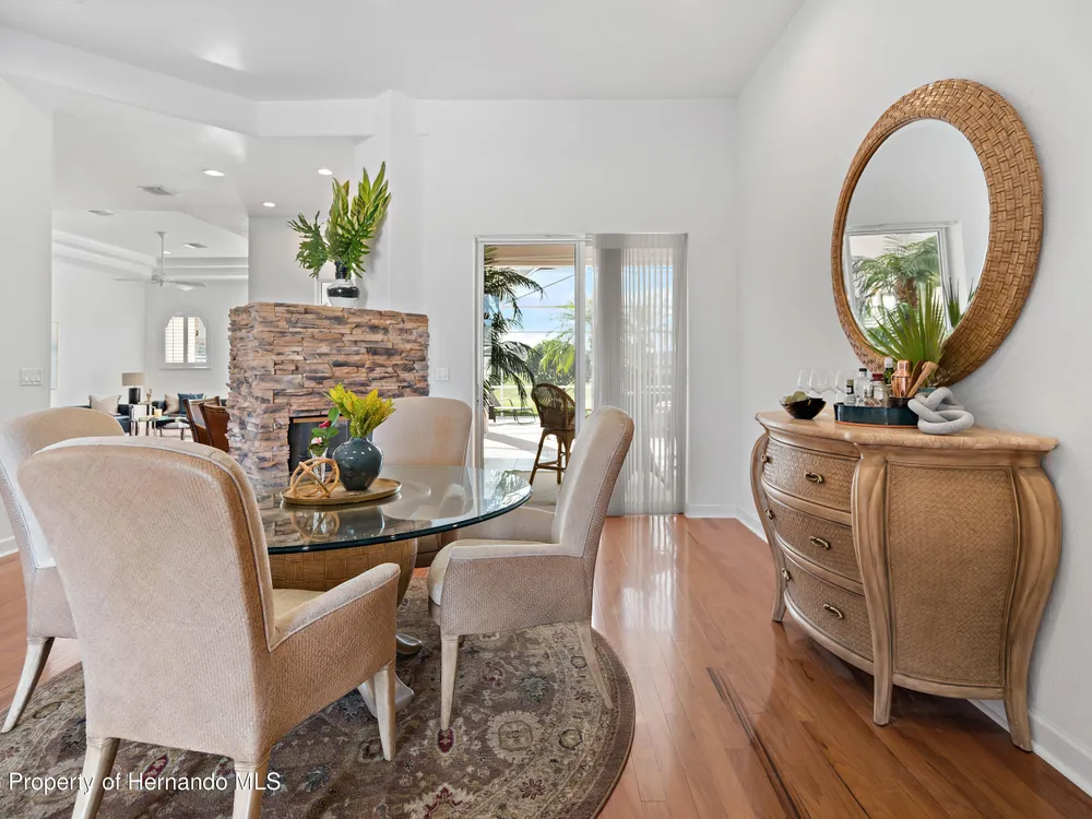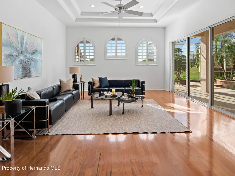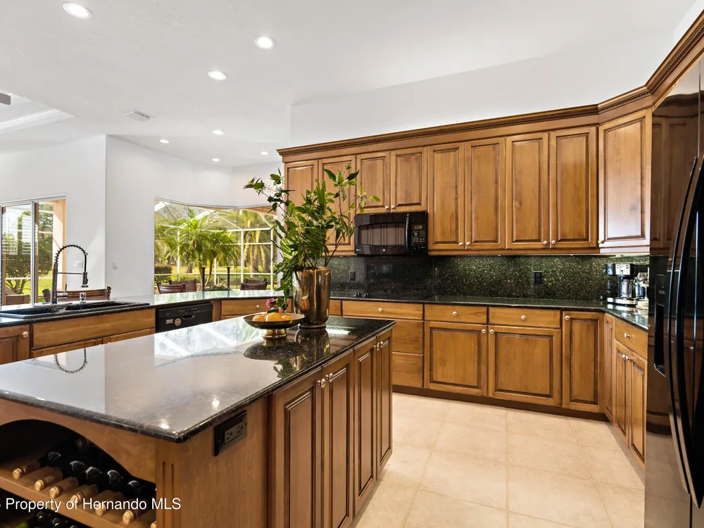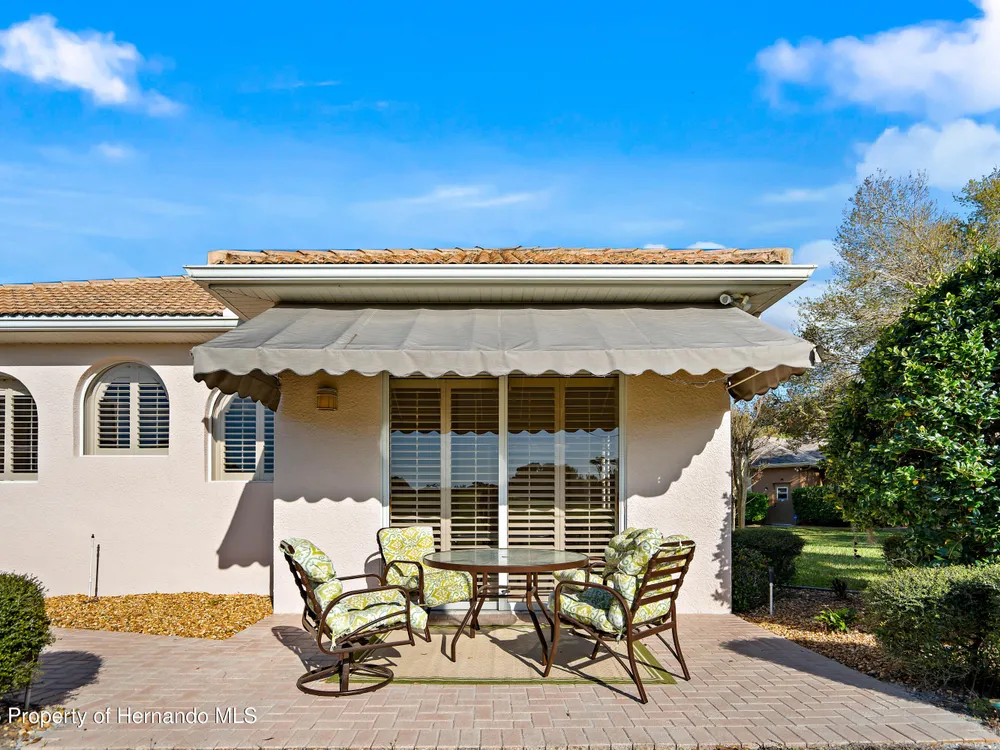 Tucked within the prestigious guard-gated Silverthorn Golf & Country Club community, this exquisite 4-bedroom, 4-bathroom estate blends timeless elegance, thoughtful craftsmanship, and serene golf course living. Meticulously maintained and tastefully upgraded, the home showcases soaring 12-foot ceilings, rich hardwood flooring, and over 70 custom cabinets and drawers thoughtfully placed throughout for optimal storage. The striking exterior features a wide pavered driveway, manicured landscaping, a Mediterranean-style tile roof, and eye-catching stone accents. Twin oversized 2-car garages with newer epoxy-coated floors are discreetly positioned on either side, offering ample room for vehicles, hobbies, or storage. A grand covered entry opens into a welcoming foyer flanked by a formal dining room on one side and a sophisticated office or den on the other, all grounded by elegant hardwood flooring. The formal living room centers around a stone gas fireplace and opens through sliding glass doors to a breathtaking lanai overlooking the 18th hole. Just beyond, the sunlit breakfast nook is surrounded by windows that maximize natural light and showcase the tranquil view. The heart of the home—a spectacular kitchen—is both functional and beautifully appointed with granite countertops and backsplash, a large center island with built-in wine racks and cabinetry, double convection wall ovens, a cooktop, a breakfast bar with double sink, and an exceptional volume of custom wood cabinetry beneath soaring ceilings. The kitchen flows seamlessly into a spacious family room featuring a dramatic triple trey ceiling, detailed crown molding, and another triple sliding door bringing the outdoors in. The luxurious primary suite serves as a peaceful retreat with tray ceilings, crown molding, private lanai access, a full wall of windows offering sweeping golf course views, and dual walk-in closets. The spa-like ensuite bathroom offers a jacuzzi garden tub with views of a private courtyard (with water and electric hookups), a large walk-in shower, dual vanities, a seated vanity space, and a private water closet. A generously sized second bedroom (20x13) is ideal as an in-law or guest suite and features private access to a serene patio with golf course views. The screened lanai is a showstopper, boasting a heated pool and spa with an in-floor cleaning system, brick paver decking, and a covered outdoor kitchen area with sink and refrigerator. Additional upgrades include hurricane-rated windows, a central vacuum system, a security system, commercial-grade water softener, 2019 Rheem dual-zone HVAC systems with NP2 filters and UV light, a newer Rheem Prestige water heater, exterior paint (2017), and an irrigation well for landscape maintenance. Residents of Silverthorn enjoy resort-style amenities including an Olympic-sized pool, tennis, pickleball, and basketball courts, a fitness center, library, activity rooms, and a stately clubhouse with a restaurant, bar, ballrooms, and golf pro shop. Just 2.5 miles from the Suncoast Parkway, this location offers a direct and convenient commute to Tampa. Nearby attractions include Weeki Wachee Springs State Park (9.5 miles), Hernando Beach (14 miles), and the Nature Coast Botanical Gardens (6 miles), making this home a rare blend of luxury, lifestyle, and location. Includes a 10K allowance for home decor like new carpet and interior painting with a full price offer.