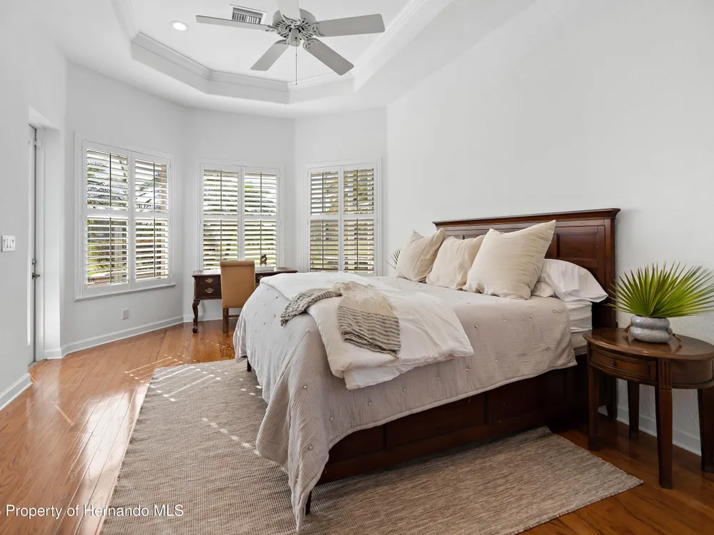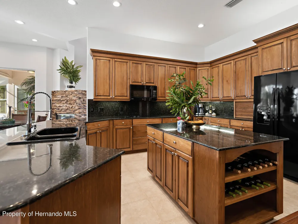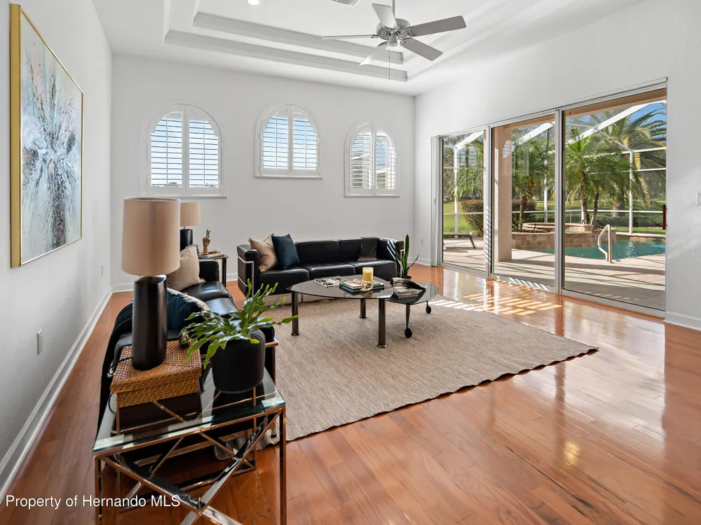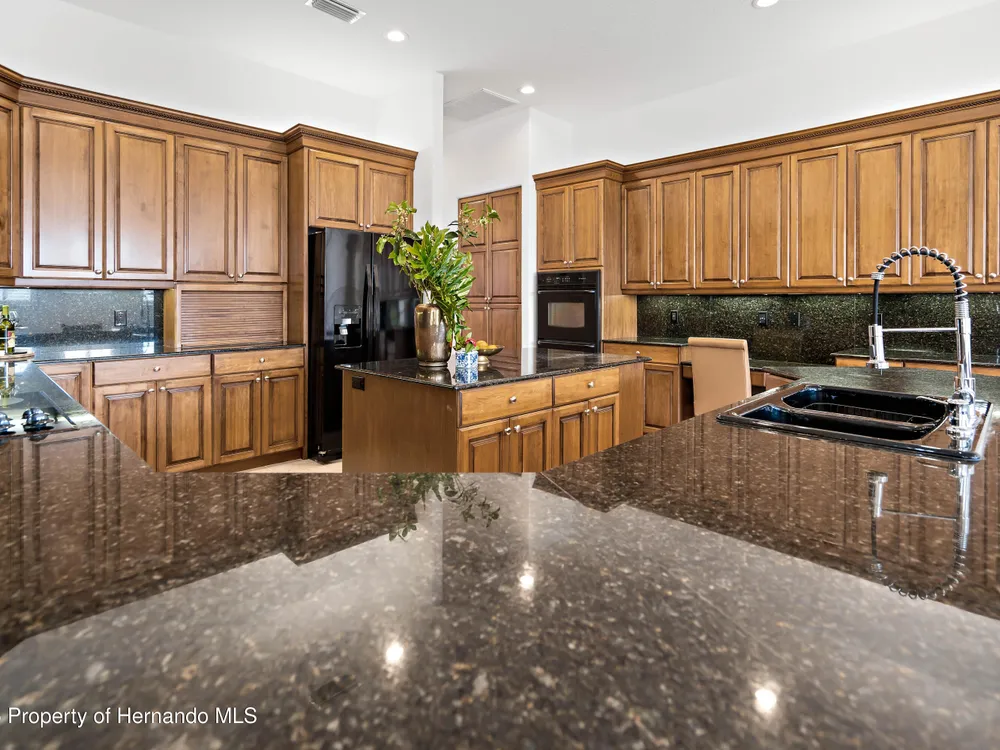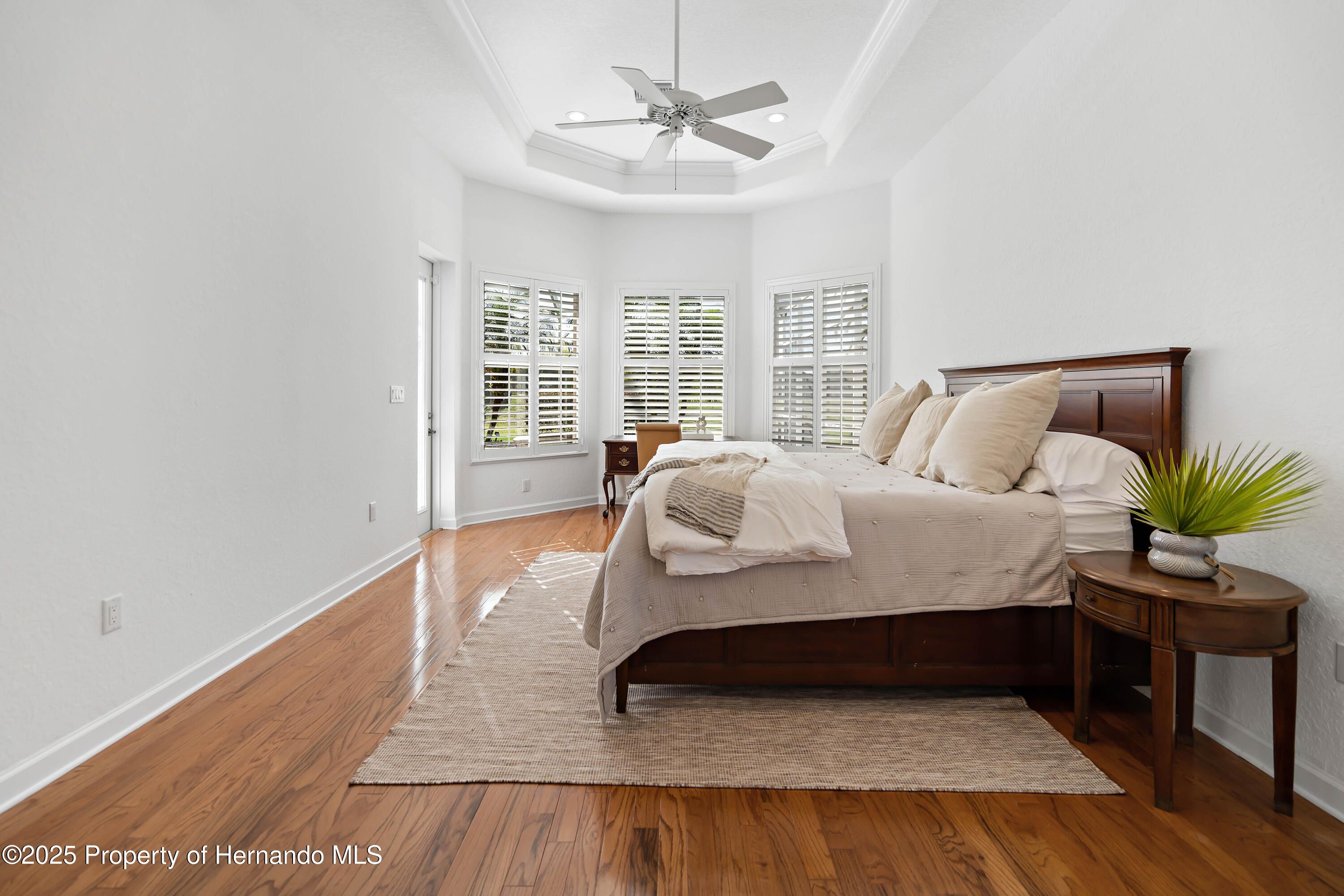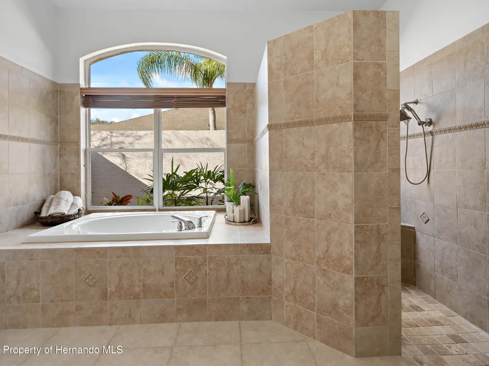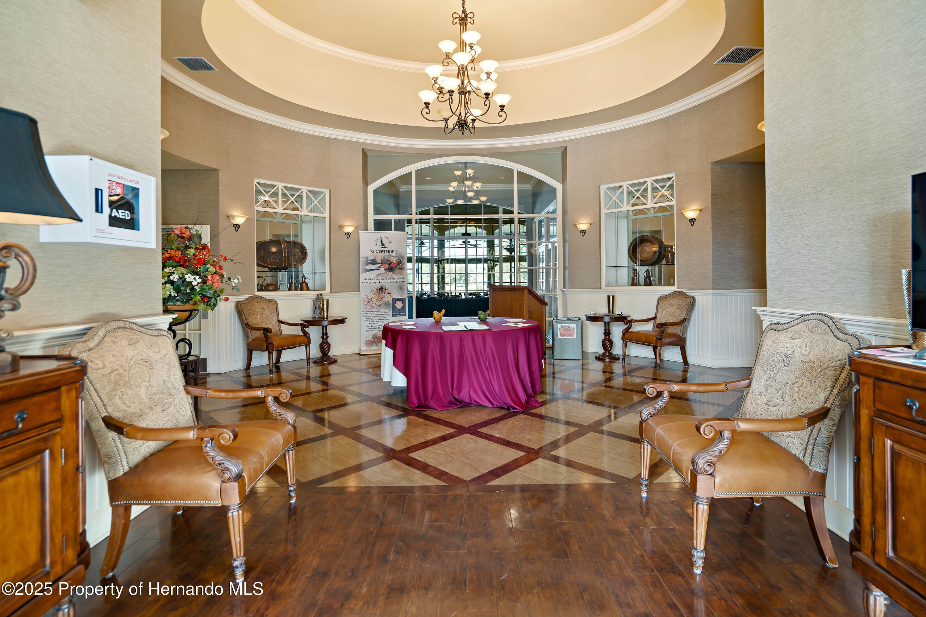 Tucked within the prestigious guard-gated Silverthorn Golf & Country Club community, this exquisite 4-bedroom, 4-bathroom estate blends timeless elegance, thoughtful craftsmanship, and serene golf course living. Meticulously maintained and tastefully upgraded, the home showcases soaring 12-foot ceilings, rich hardwood flooring, and over 70 custom cabinets and drawers thoughtfully placed throughout for optimal storage. The striking exterior features a wide pavered driveway, manicured landscaping, a Mediterranean-style tile roof, and eye-catching stone accents. Twin oversized 2-car garages with newer epoxy-coated floors are discreetly positioned on either side, offering ample room for vehicles, hobbies, or storage. A grand covered entry opens into a welcoming foyer flanked by a formal dining room on one side and a sophisticated office or den on the other, all grounded by elegant hardwood flooring. The formal living room centers around a stone gas fireplace and opens through sliding glass doors to a breathtaking lanai overlooking the 18th hole. Just beyond, the sunlit breakfast nook is surrounded by windows that maximize natural light and showcase the tranquil view. The heart of the home—a spectacular kitchen—is both functional and beautifully appointed with granite countertops and backsplash, a large center island with built-in wine racks and cabinetry, double convection wall ovens, a cooktop, a breakfast bar with double sink, and an exceptional volume of custom wood cabinetry beneath soaring ceilings. The kitchen flows seamlessly into a spacious family room featuring a dramatic triple trey ceiling, detailed crown molding, and another triple sliding door bringing the outdoors in. The luxurious primary suite serves as a peaceful retreat with tray ceilings, crown molding, private lanai access, a full wall of windows offering sweeping golf course views, and dual walk-in closets. The spa-like ensuite bathroom offers a jacuzzi garden tub with views of a private courtyard (with water and electric hookups), a large walk-in shower, dual vanities, a seated vanity space, and a private water closet. A generously sized second bedroom (20x13) is ideal as an in-law or guest suite and features private access to a serene patio with golf course views. The screened lanai is a showstopper, boasting a heated pool and spa with an in-floor cleaning system, brick paver decking, and a covered outdoor kitchen area with sink and refrigerator. Additional upgrades include hurricane-rated windows, a central vacuum system, a security system, commercial-grade water softener, 2019 Rheem dual-zone HVAC systems with NP2 filters and UV light, a newer Rheem Prestige water heater, exterior paint (2017), and an irrigation well for landscape maintenance. Residents of Silverthorn enjoy resort-style amenities including an Olympic-sized pool, tennis, pickleball, and basketball courts, a fitness center, library, activity rooms, and a stately clubhouse with a restaurant, bar, ballrooms, and golf pro shop. Just 2.5 miles from the Suncoast Parkway, this location offers a direct and convenient commute to Tampa. Nearby attractions include Weeki Wachee Springs State Park (9.5 miles), Hernando Beach (14 miles), and the Nature Coast Botanical Gardens (6 miles), making this home a rare blend of luxury, lifestyle, and location. Includes a 10K allowance for home decor like new carpet and interior painting with a full price offer.