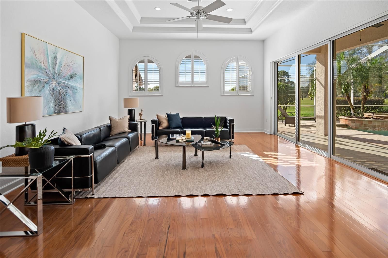 Tucked within the prestigious guard-gated Silverthorn Golf & Country Club community, this exquisite 4-bedroom, 4-bathroom estate blends timeless elegance, thoughtful craftsmanship, and serene golf course living. Meticulously maintained and tastefully upgraded, the home showcases soaring 12-foot ceilings, rich hardwood flooring, and over 70 custom cabinets and drawers thoughtfully placed throughout for optimal storage. The striking exterior features a wide pavered driveway, manicured landscaping, a Mediterranean-style tile roof, and eye-catching stone accents. Twin oversized 2-car garages with newer epoxy-coated floors are discreetly positioned on either side, offering ample room for vehicles, hobbies, or storage. A grand covered entry opens into a welcoming foyer flanked by a formal dining room on one side and a sophisticated office or den on the other, all grounded by elegant hardwood flooring. The formal living room centers around a stone gas fireplace and opens through sliding glass doors to a breathtaking lanai overlooking the 18th hole. Just beyond, the sunlit breakfast nook is surrounded by windows that maximize natural light and showcase the tranquil view. The heart of the home—a spectacular kitchen—is both functional and beautifully appointed with granite countertops and backsplash, a large center island with built-in wine racks and cabinetry, double convection wall ovens, a cooktop, a breakfast bar with double sink, and an exceptional volume of custom wood cabinetry beneath soaring ceilings. The kitchen flows seamlessly into a spacious family room featuring a dramatic triple trey ceiling, detailed crown molding, and another triple sliding door bringing the outdoors in. The luxurious primary suite serves as a peaceful retreat with tray ceilings, crown molding, private lanai access, a full wall of windows offering sweeping golf course views, and dual walk-in closets. The spa-like ensuite bathroom offers a jacuzzi garden tub with views of a private courtyard (with water and electric hookups), a large walk-in shower, dual vanities, a seated vanity space, and a private water closet. A generously sized second bedroom (20x13) is ideal as an in-law or guest suite and features private access to a serene patio with golf course views. The screened lanai is a showstopper, boasting a heated pool and spa with an in-floor cleaning system, brick paver decking, and a covered outdoor kitchen area with sink and refrigerator. Additional upgrades include hurricane-rated windows, a central vacuum system, a security system, commercial-grade water softener, 2019 Rheem dual-zone HVAC systems with NP2 filters and UV light, a newer Rheem Prestige water heater, exterior paint (2017), and an irrigation well for landscape maintenance. Residents of Silverthorn enjoy resort-style amenities including an Olympic-sized pool, tennis, pickleball, and basketball courts, a fitness center, library, activity rooms, and a stately clubhouse with a restaurant, bar, ballrooms, and golf pro shop. Just 2.5 miles from the Suncoast Parkway, this location offers a direct and convenient commute to Tampa. Nearby attractions include Weeki Wachee Springs State Park (9.5 miles), Hernando Beach (14 miles), and the Nature Coast Botanical Gardens (6 miles), making this home a rare blend of luxury, lifestyle, and location.Includes a $10,000 allowance for home decor like new carpet and interior painting with a full price offer.