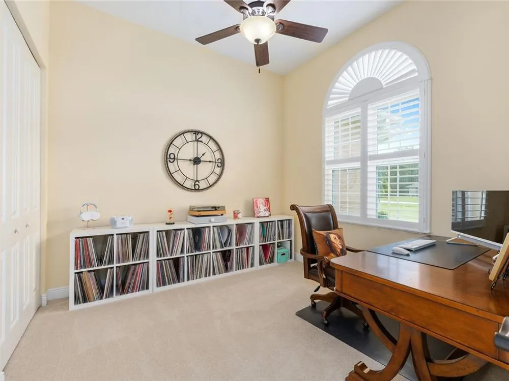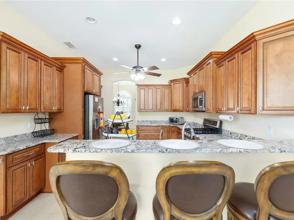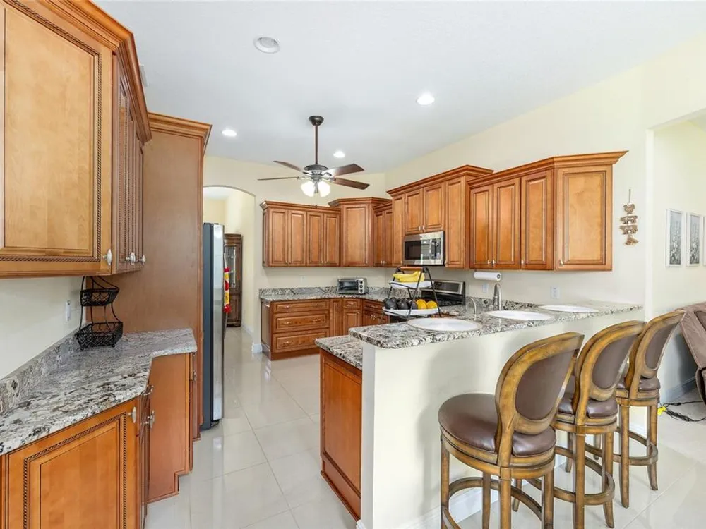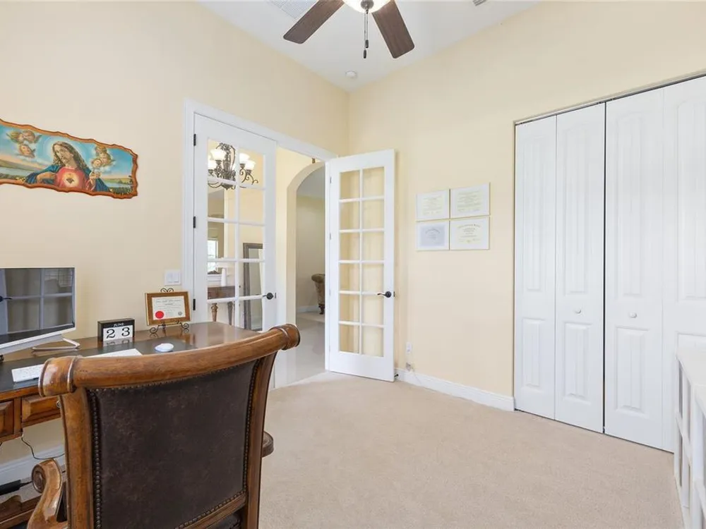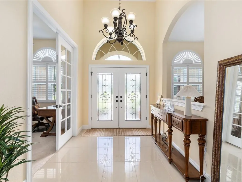 Gorgeous custom built 3/3/2 home PLUS OFFICE on .46 acre in SW Marco Polo Village II/Kingsland! Great curb appeal with grand double door entry! Light & bright! IMMACULATE AND MOVE-IN READY! Spacious home with 2652 ft and high ceilings! Formal living room with lanai access and formal dining room. Beautiful kitchen with breakfast bar, eat in nook, SS appliances, pantry, and plenty of custom cabinets and granite counters. Large family room. Office has French doors and closet ~ can be a 4th bedroom. Split bedroom plan. Amazing primary suite with tray ceiling, lanai access, TWO walk-in closets, tiled walk-in shower, jetted tub, dual granite vanities, linen closet, and water closet. THREE bathrooms. Inside laundry includes washer/dryer, sink, and more storage. Covered lanai overlooks HUGE backyard (almost HALF ACRE)! Excellent location convenient to shopping, dining, medical, entertainment, WEC, and I-75!