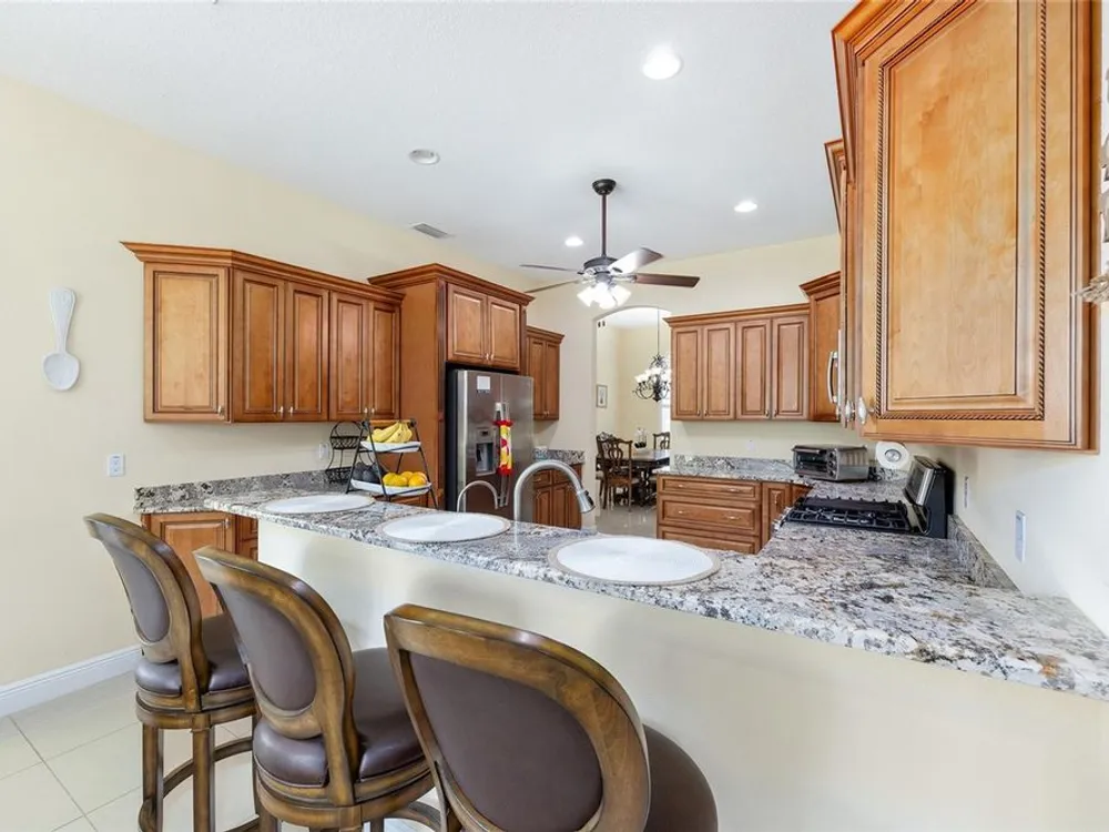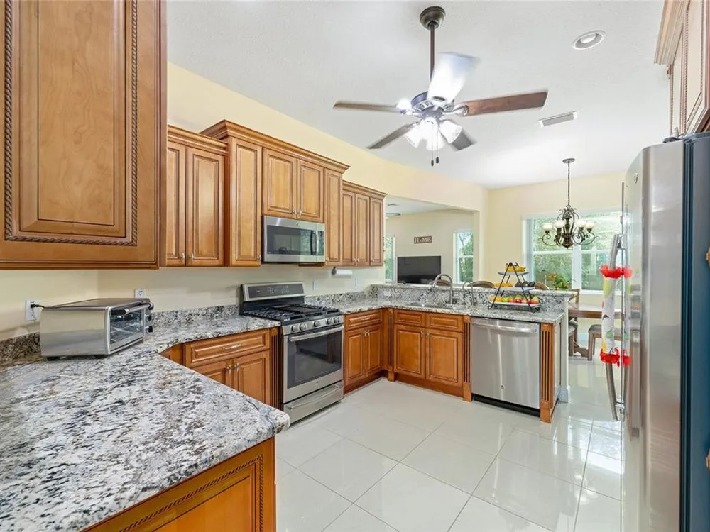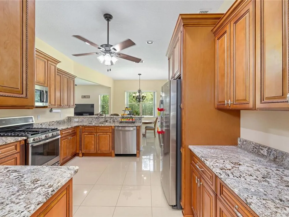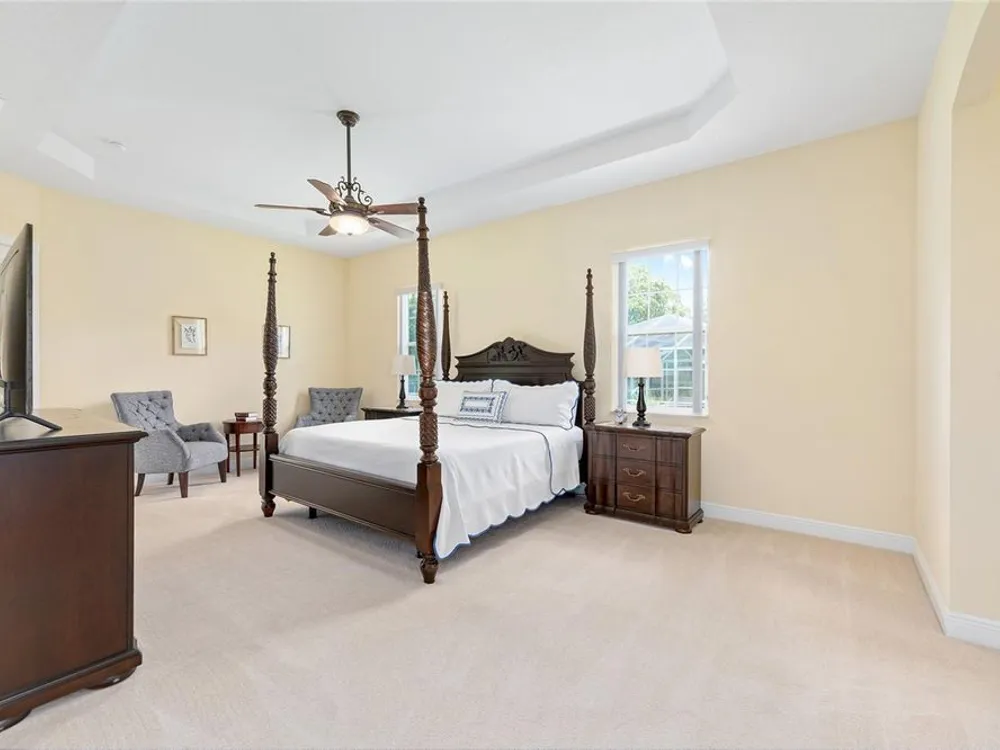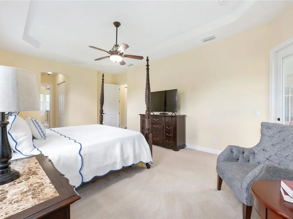 - Ceiling Fan(s), Eat-in Kitchen, High Ceilings, Solid-Wood Cabinets, Split Bedrooms, Stone Counters, Tray Ceiling(s), Walk-In Closet(s), Window Treatments