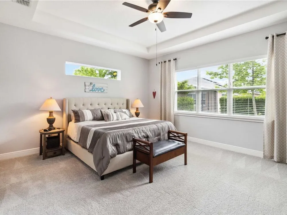 - Ceiling Fan(s), High Ceilings, Living/Dining Room, Open Floorplan, Main Level Primary, Solid Surface Counters, Solid-Wood Cabinets, Split Bedrooms, Thermostat, Tray Ceiling(s), Walk-In Closet(s), Window Treatments