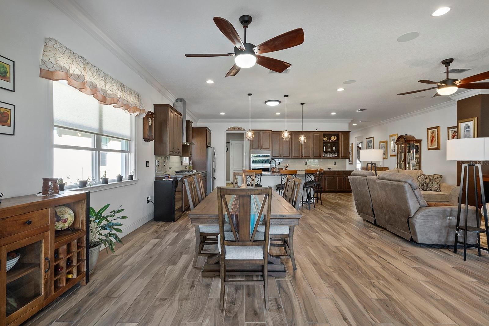 - Built-in Features, Ceiling Fan(s), Crown Molding, High Ceilings, Kitchen/Family Room Combo, Open Floorplan, Main Level Primary, Solid-Wood Cabinets, Split Bedrooms, Stone Counters, Thermostat, Tray Ceiling(s), Walk-In Closet(s), Window Treatments