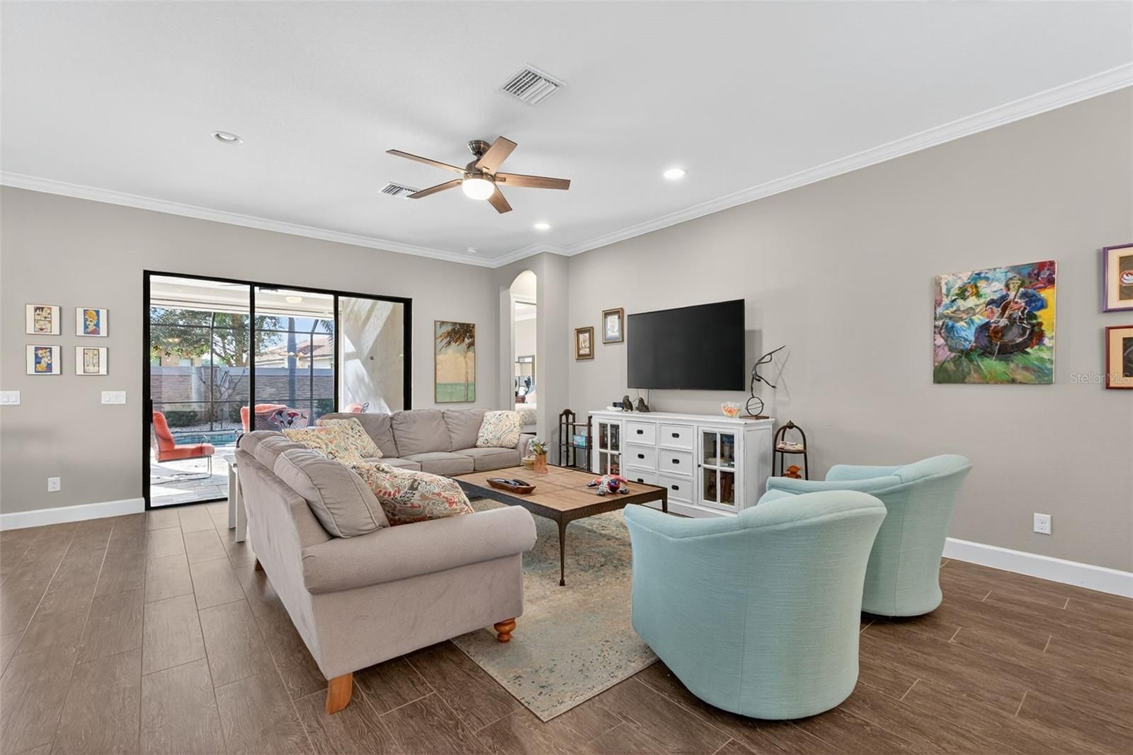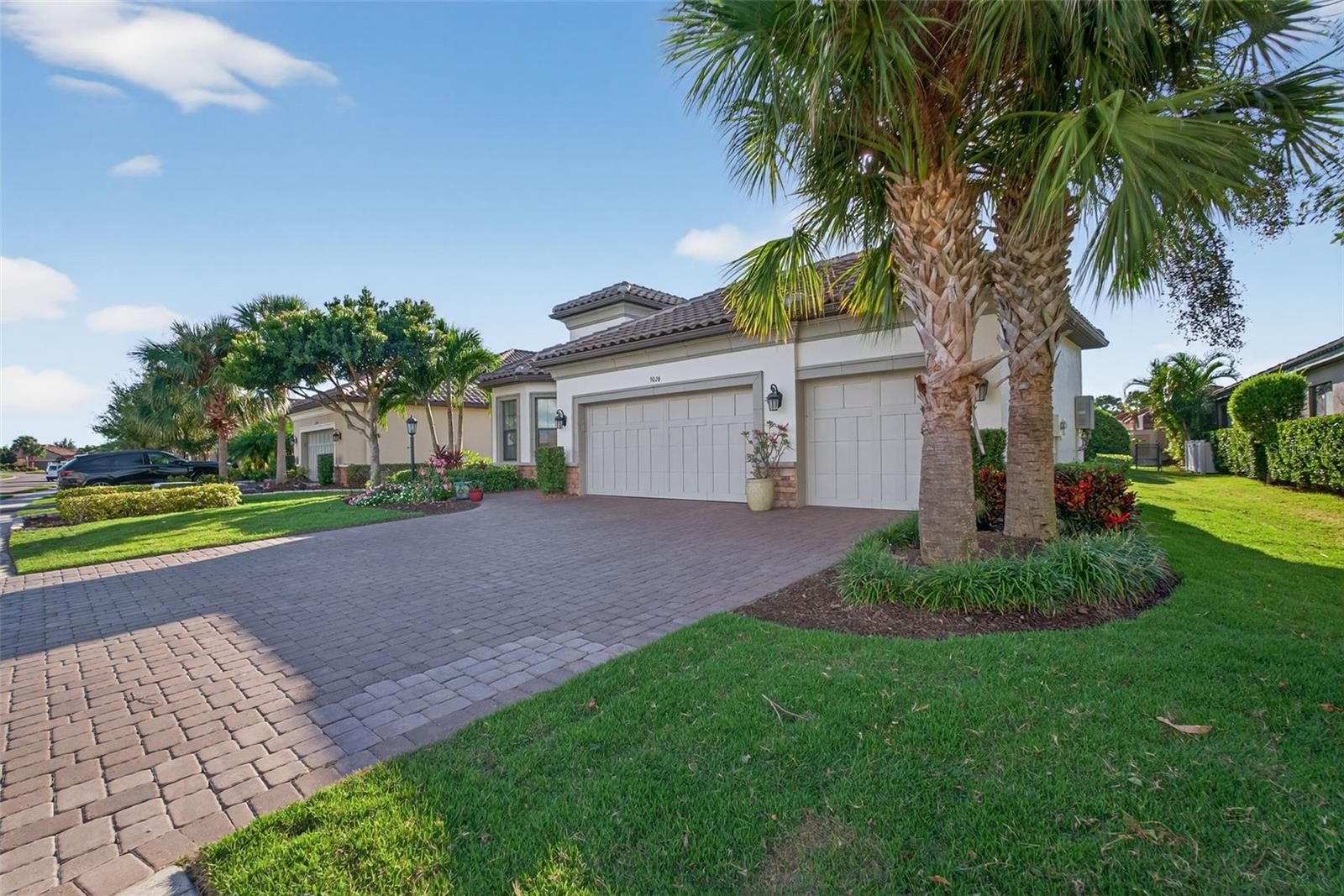 Step into refined Florida living at 5026 Tivoli Run, a beautifully upgraded Lazio floorplan nestled in the gated, resort-style community of Esplanade Golf & Country Club. This meticulously maintained 3-bedroom, 3-bathroom residence with a 3-car garage offers elegant design, premium finishes, and an ideal layout for both everyday comfort and upscale entertaining. At the heart of the home, the extended GE Café gourmet kitchen is a chef’s dream, showcasing white cabinetry, an oversized island with extra storage, soft-close drawers, 6 pot drawers and under-cabinet lighting. A built-in Monogram wine refrigerator in the breakfast nook adds a touch of luxury, complemented by a new 2025 counter-depth refrigerator and expanded cabinetry for added functionality. The open-concept layout features sophisticated tray ceilings in the entry along with crown molding in both the main living space and primary suite. A dedicated office space is elevated with custom built-ins and stylish sliding doors, offering the perfect balance of privacy and productivity. The large laundry room includes ample cabinetry, a deep sink, and premium LG washer and dryer, combining practicality with refined design. Outdoor living is a true highlight, with a covered lanai featuring a full summer kitchen and a cozy fireplace, all overlooking a private, fenced-in yard with lush, dog run and tranquil landscaping. Impact-rated shades on the lanai and Kevlar hurricane screens on all other windows and doors offer peace of mind year-round, while gutters and landscape lighting enhance curb appeal and functionality. This is a golf deeded property. Esplanade is located in the heart of Lakewood Ranch, close to I-75, Lakewood Ranch Main St., University Town Center, Sarasota Polo Club, shopping, dining, entertainment, hospitals, cultural attractions, boating, parks and Florida's famous sandy beaches.