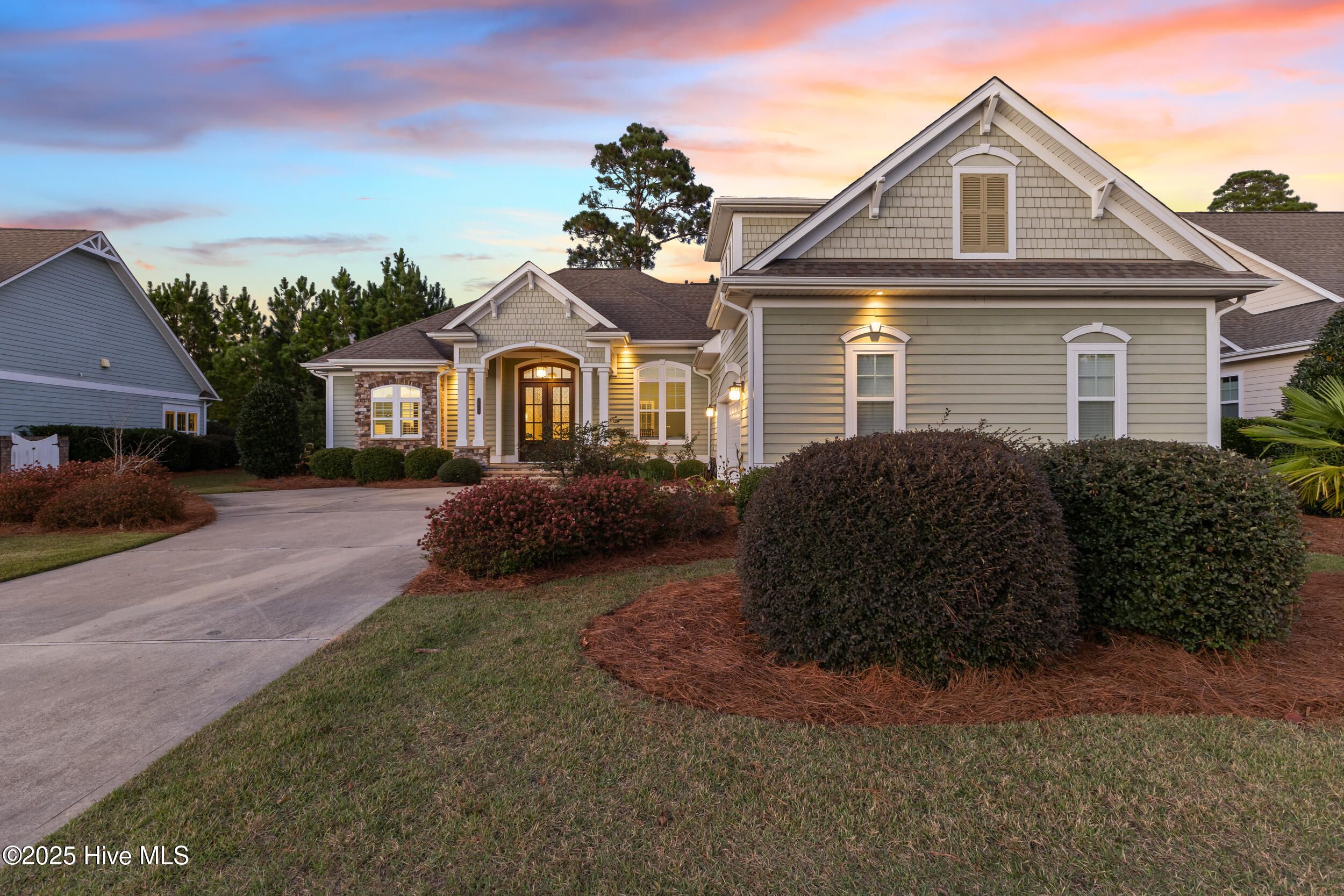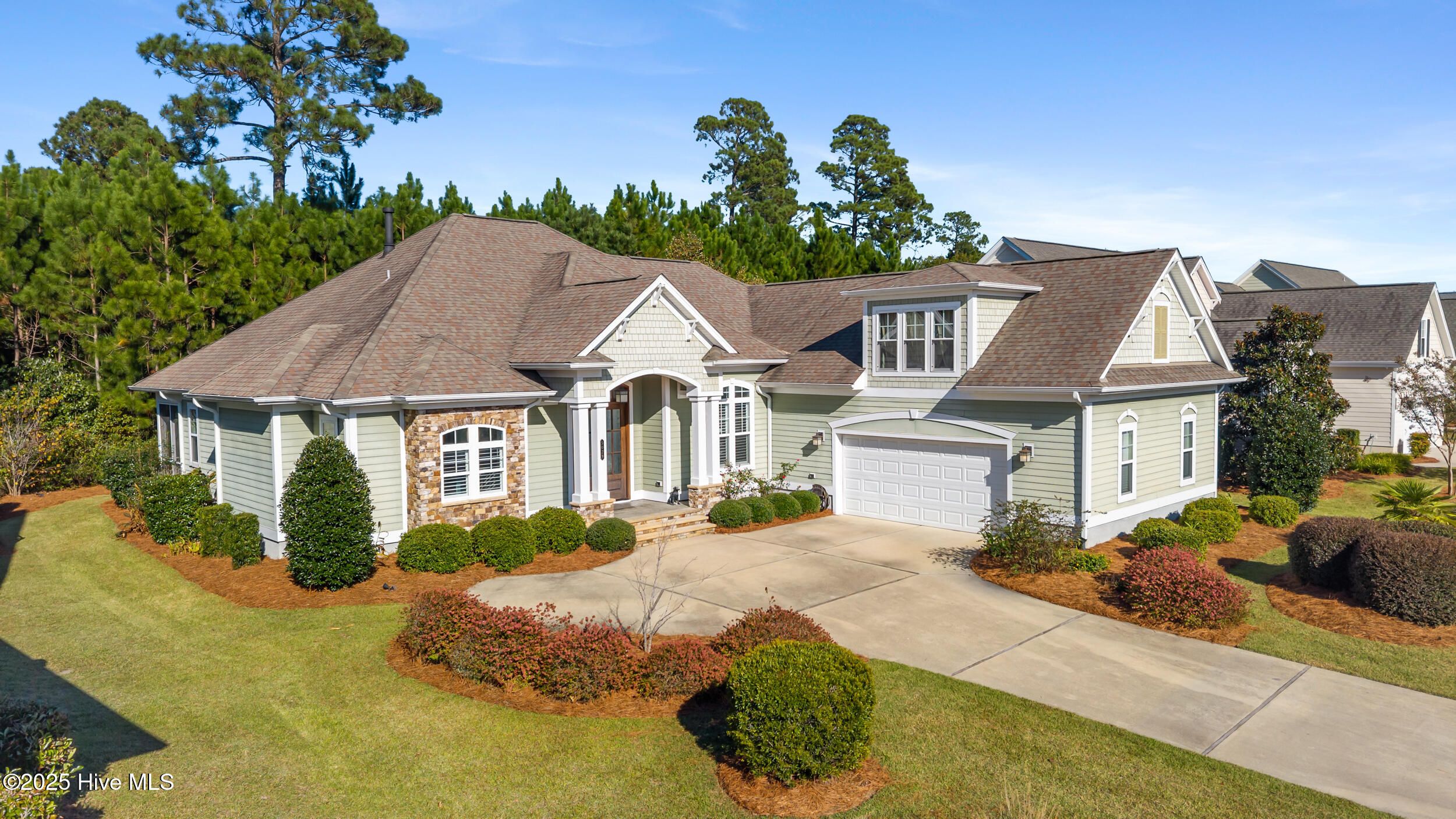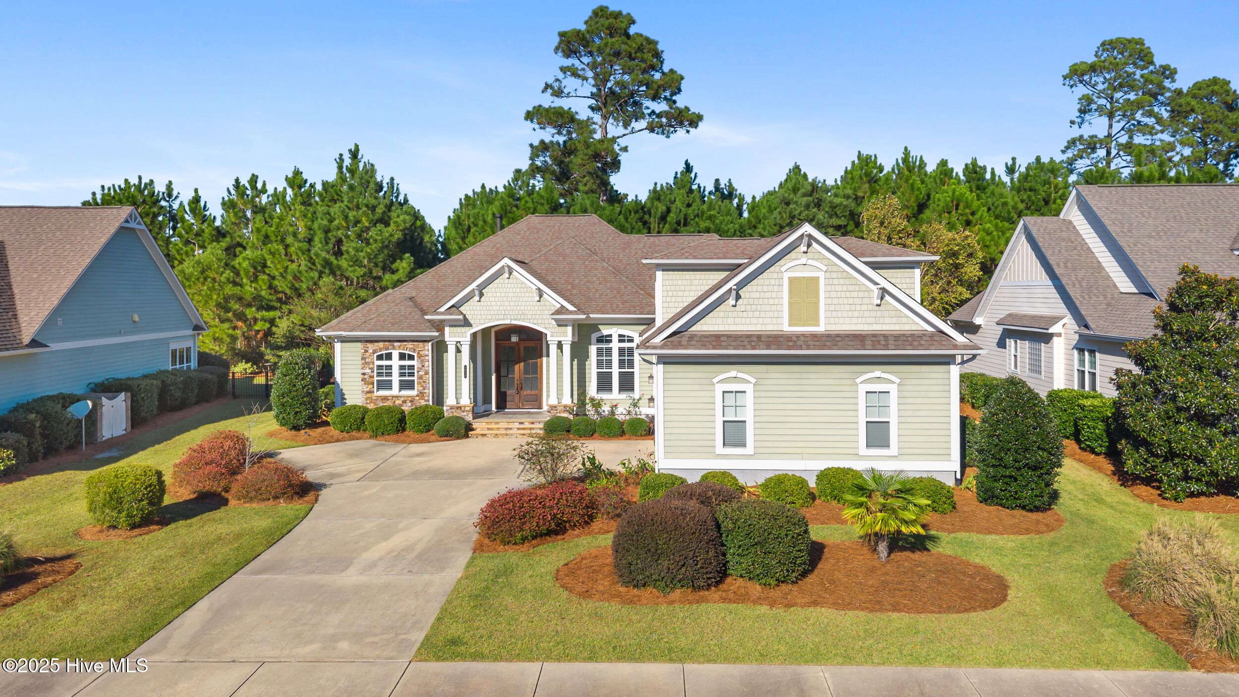 Welcome to 5029 Stoney Point Drive, a premier custom residence in the highly sought-after Shelmore enclave of Brunswick Forest. This beautifully designed home features a bright, open floor plan with red oak hardwood floors, a Vermont Castings fireplace, and extensive custom cabinetry throughout. The European-inspired kitchen is a true showpiece, offering Miele appliances, quartz countertops, and sleek, modern cabinetry—ideal for both everyday living and entertaining. The primary suite showcases a spa-like Roman bath, while two additional guest bedrooms, a French-door office, and a versatile upstairs suite provide exceptional flexibility for guests, work-from-home living, or multigenerational needs. Enjoy serene wooded privacy from the screened lanai, perfect for year-round relaxation. Additional highlights include a tankless hot water heater, built-in speaker system, and a spacious 2.5-car garage. Ideally located just steps from Shelmore's lake, pool, and fitness facility, and only minutes from downtown Wilmington, area beaches, and premier golf courses, this home offers the perfect blend of luxury, comfort, and convenience.