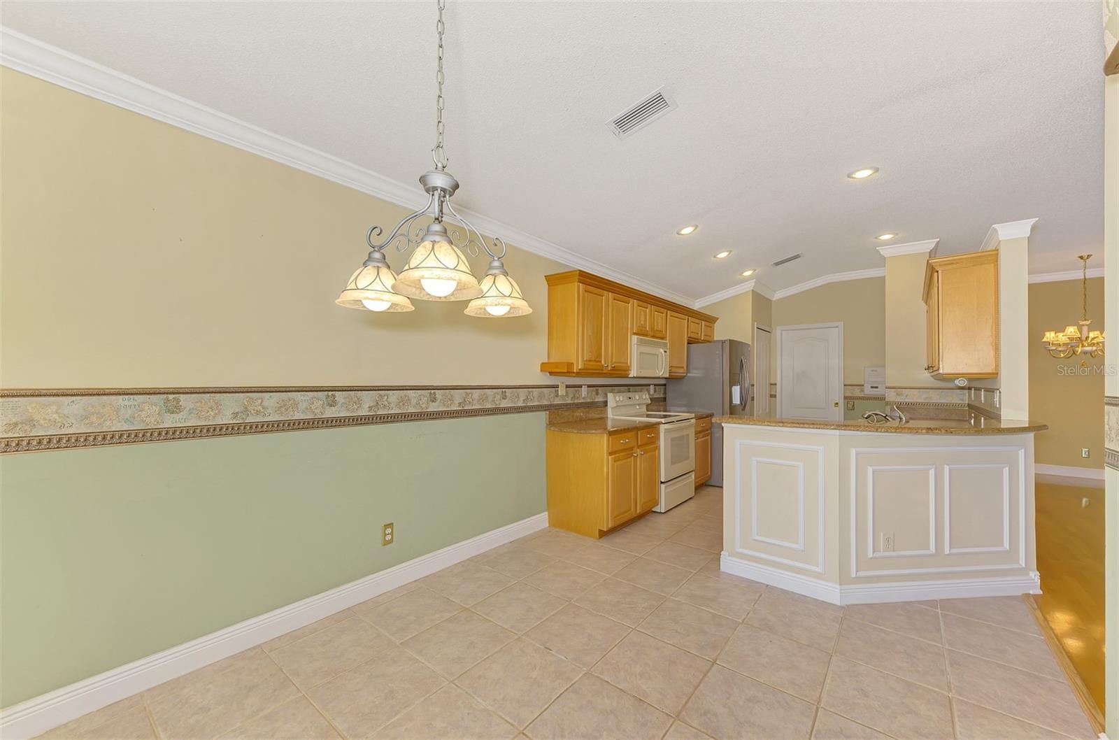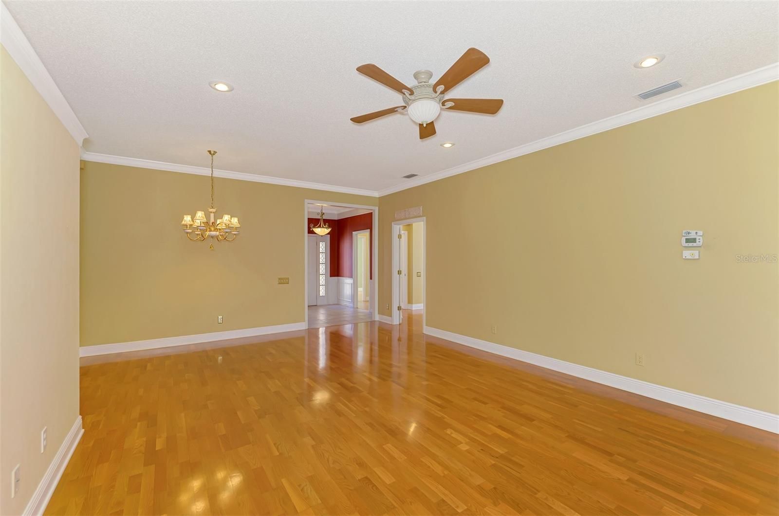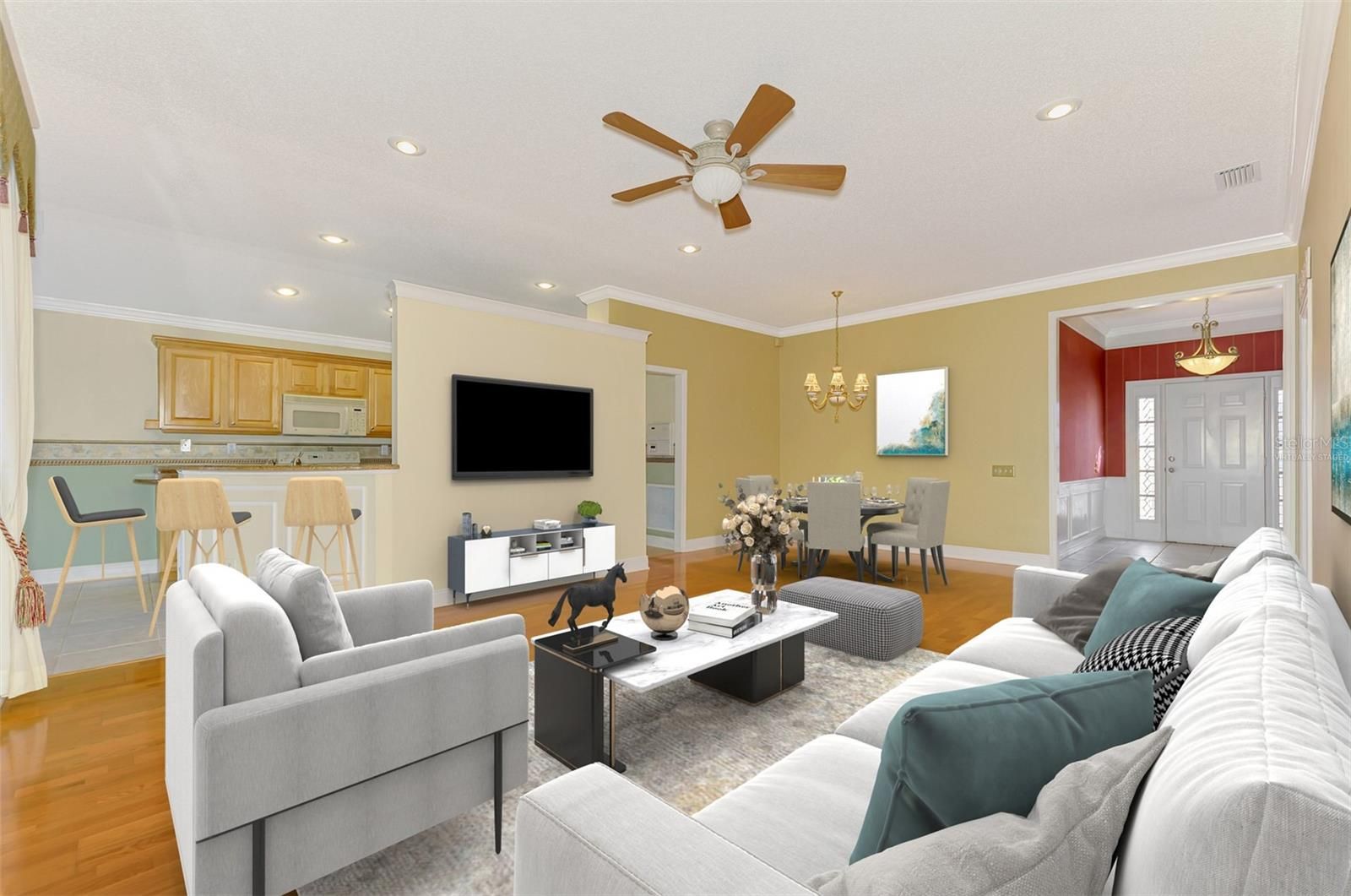 - Ceiling Fan(s), Crown Molding, Eat-in Kitchen, Living/Dining Room, Open Floorplan, Main Level Primary, Solid-Wood Cabinets, Split Bedrooms, Stone Counters, Thermostat, Window Treatments