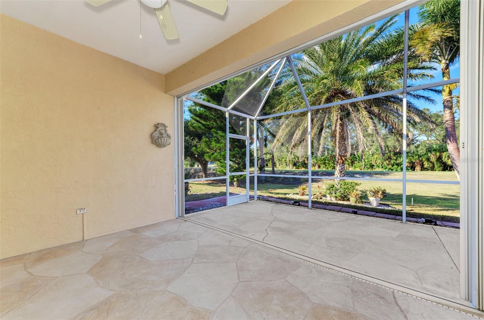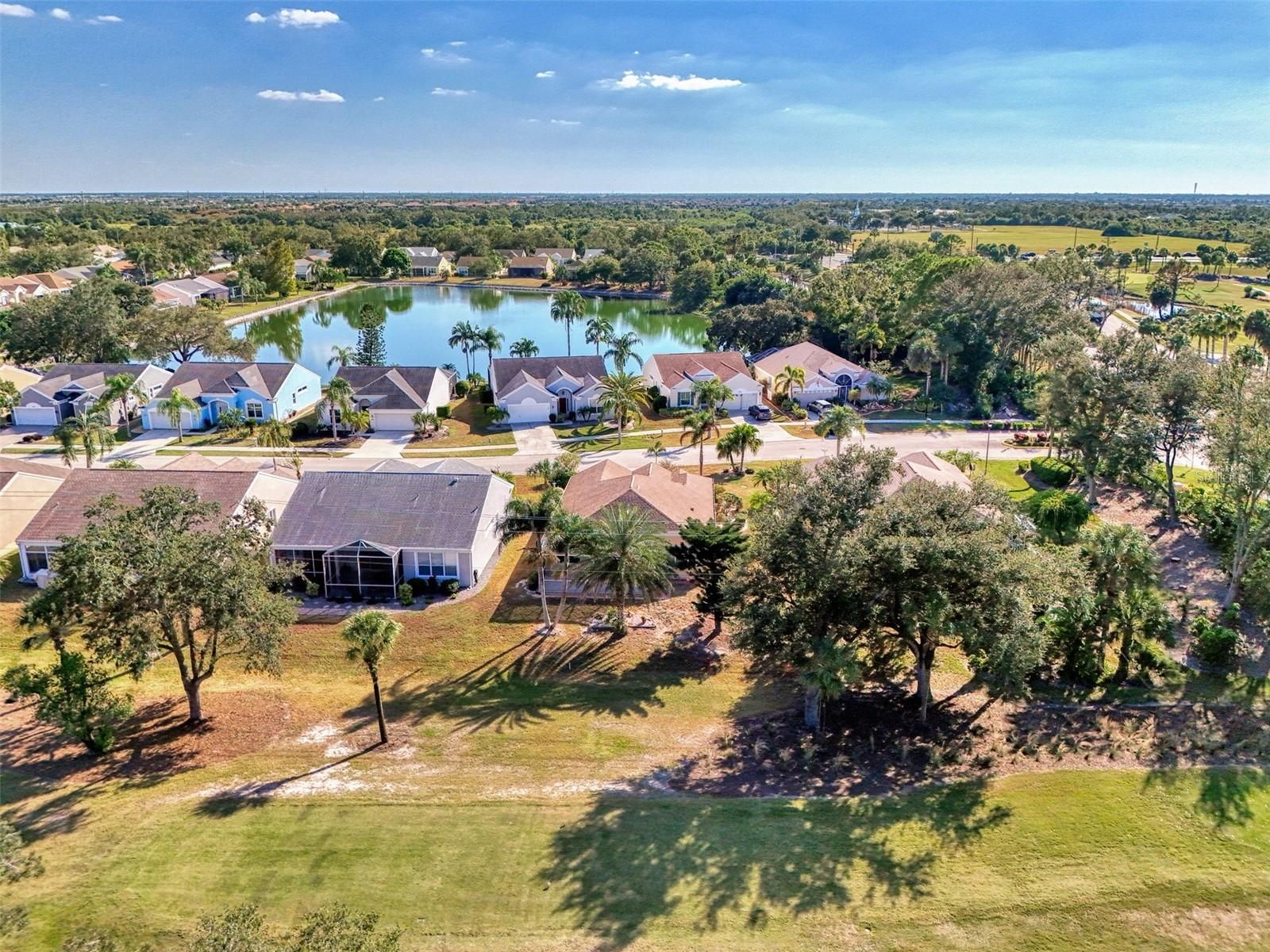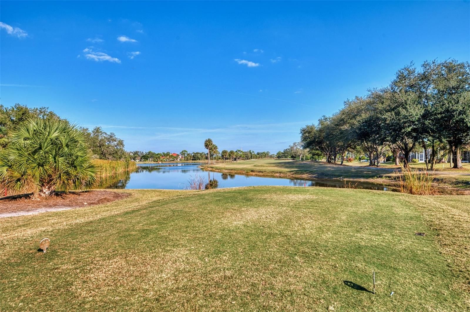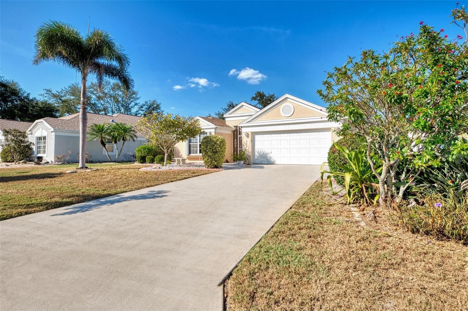 One or more photo(s) has been virtually staged. Charming Home with Golf Course Views in a Quaint Neighborhood! Located just outside the Plantation Golf & Country Club, this delightful home offers breathtaking views of the #3 tee box on Panther Golf Course from the expansive lanai, primary bedroom, and living room/kitchen sliding glass doors. The split floor plan provides two bedrooms with a guest bath on one side, while the primary suite is perfectly positioned for privacy and relaxation, featuring a luxurious en suite with granite countertops, dual sinks, a walk-in shower, and a private water closet. The eat-in kitchen includes granite countertops, pantry, and crown molding flows throughout the home. The laundry room includes convenient cabinets and Bedroom 2 includes a charming window seat. The oversized garage has an exterior door, and the outside is finished with custom curbing. The extended lanai is ideal for entertaining or relaxing while taking in the scenic golf course and adjacent water views. Membership to the Plantation Golf & Country Club is Optional. The club offers two 18-hole championship golf courses, pickleball, bocce ball, tennis, fitness center, pool and fine dining. Don’t miss this opportunity—buyers, schedule your private tour today, and agents, bring your clients to experience why this one won’t last long!