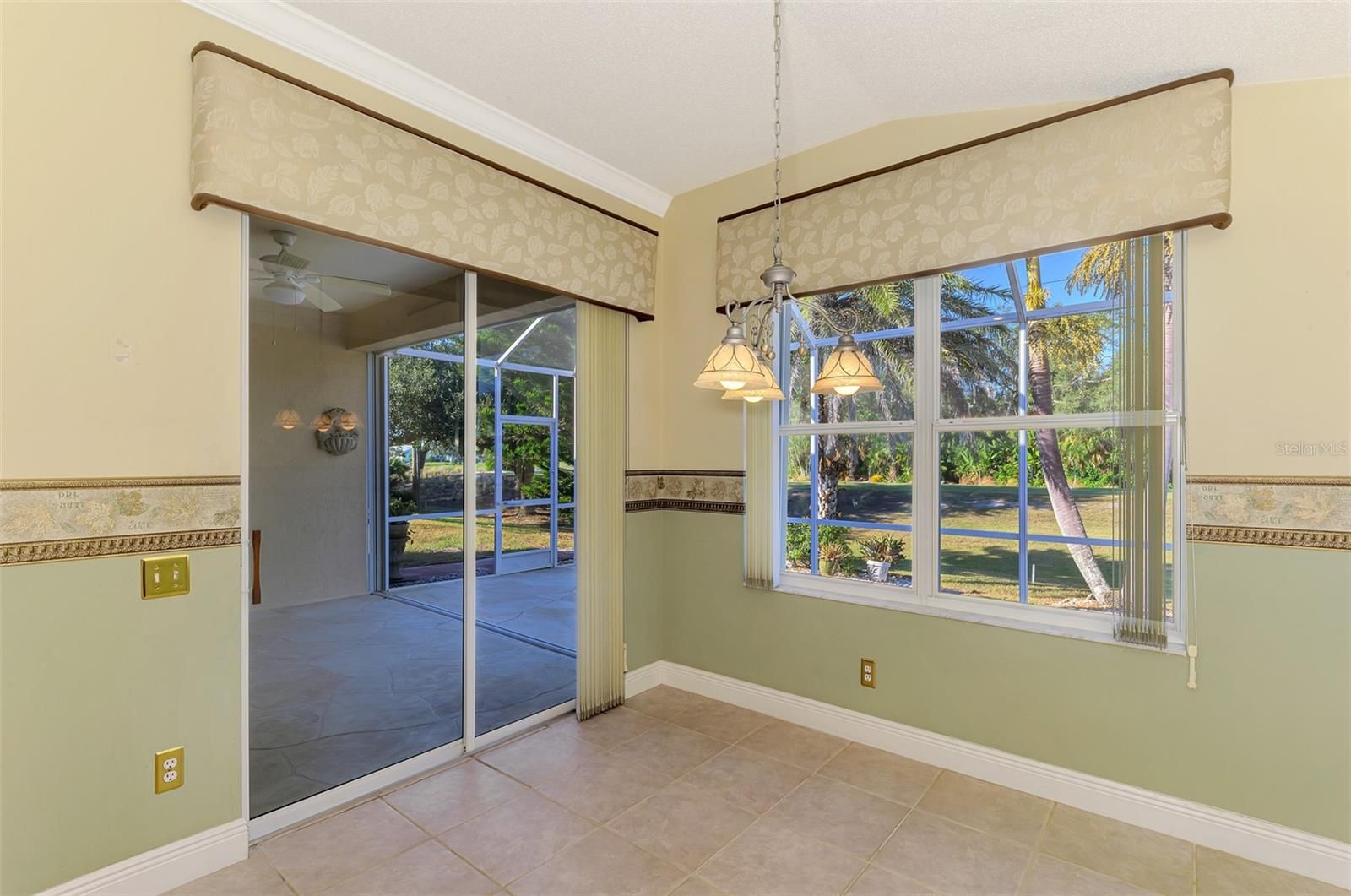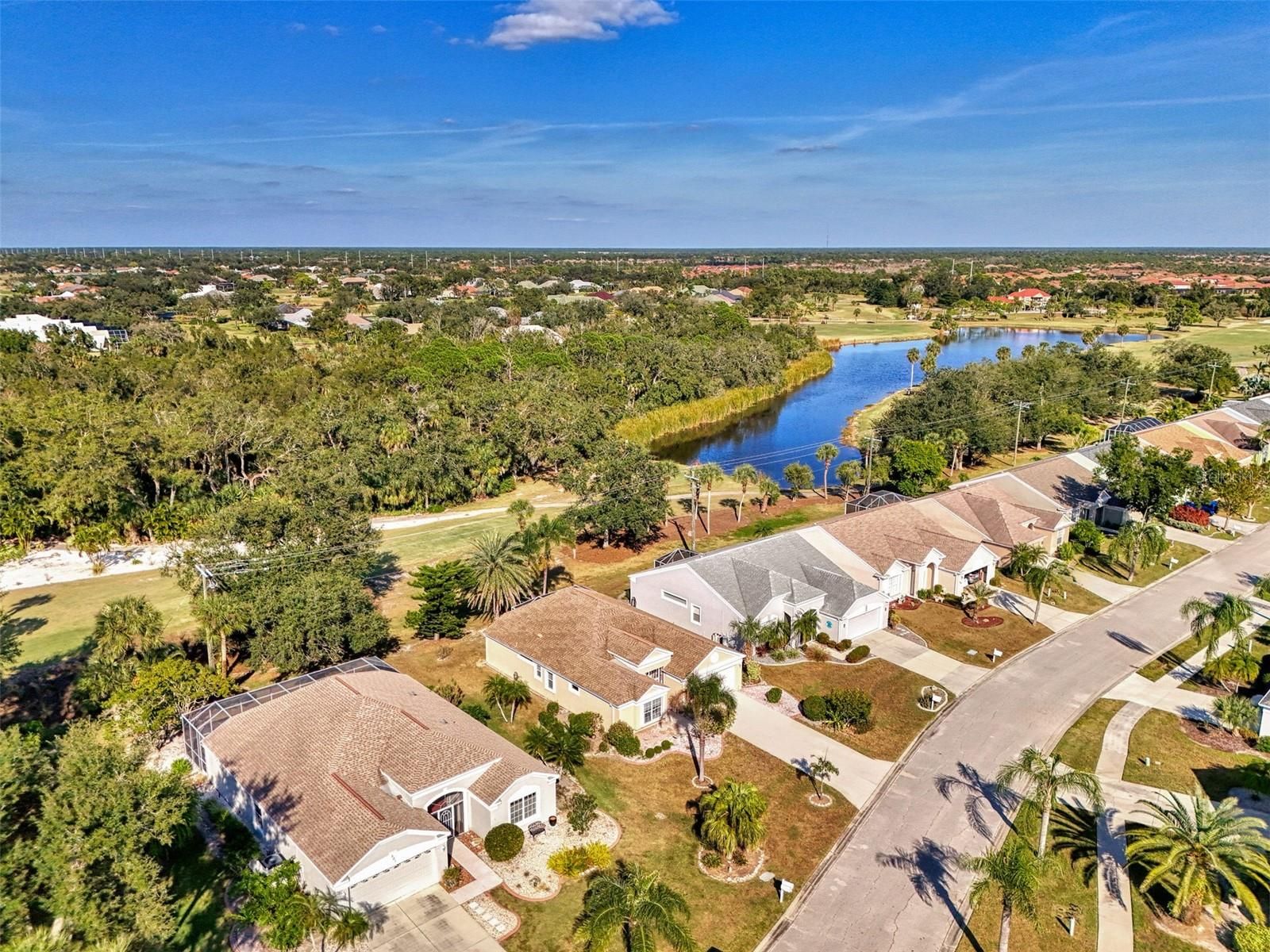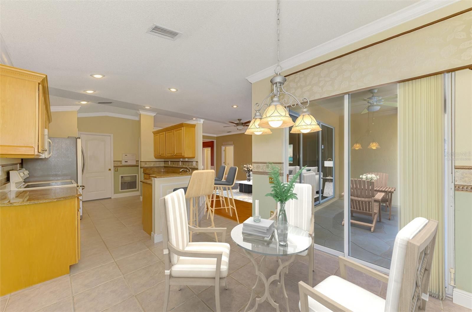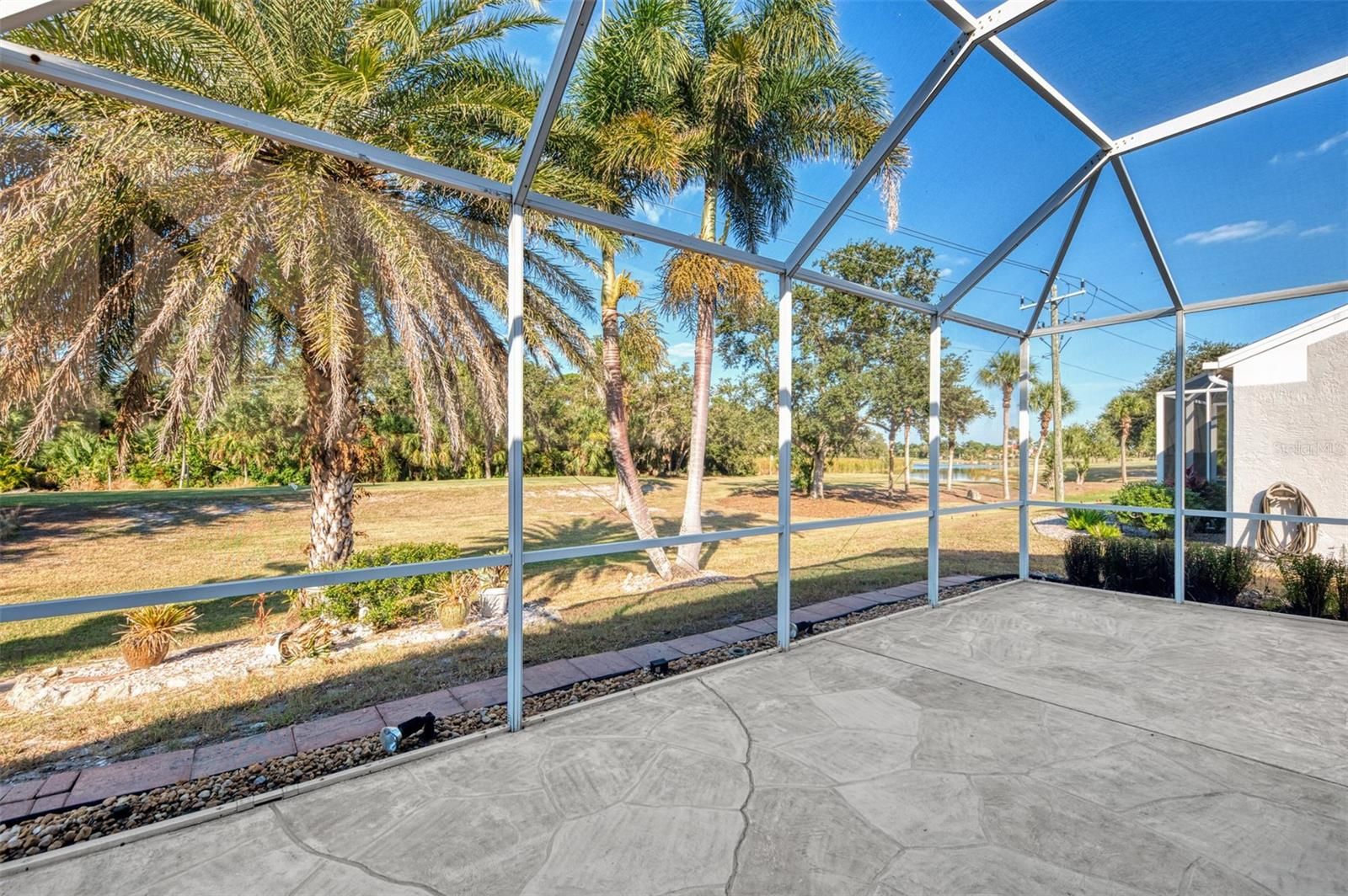 One or more photo(s) has been virtually staged. Charming Home with Golf Course Views in a Quaint Neighborhood! Located just outside the Plantation Golf & Country Club, this delightful home offers breathtaking views of the #3 tee box on Panther Golf Course from the expansive lanai, primary bedroom, and living room/kitchen sliding glass doors. The split floor plan provides two bedrooms with a guest bath on one side, while the primary suite is perfectly positioned for privacy and relaxation, featuring a luxurious en suite with granite countertops, dual sinks, a walk-in shower, and a private water closet. The eat-in kitchen includes granite countertops, pantry, and crown molding flows throughout the home. The laundry room includes convenient cabinets and Bedroom 2 includes a charming window seat. The oversized garage has an exterior door, and the outside is finished with custom curbing. The extended lanai is ideal for entertaining or relaxing while taking in the scenic golf course and adjacent water views. Membership to the Plantation Golf & Country Club is Optional. The club offers two 18-hole championship golf courses, pickleball, bocce ball, tennis, fitness center, pool and fine dining. Don’t miss this opportunity—buyers, schedule your private tour today, and agents, bring your clients to experience why this one won’t last long!