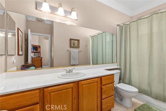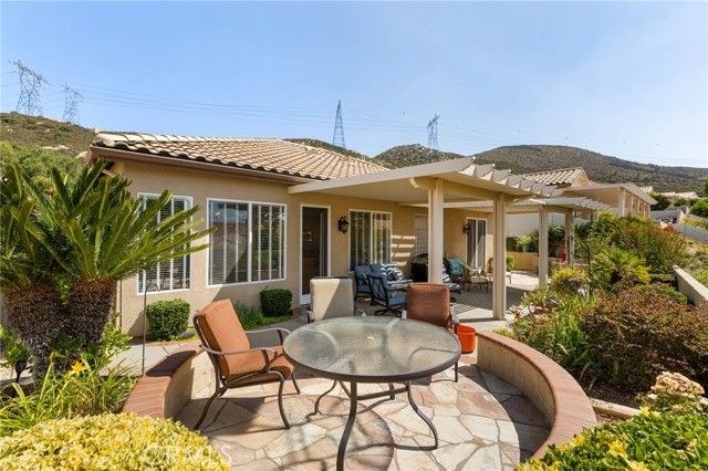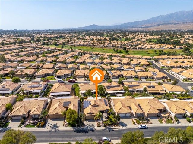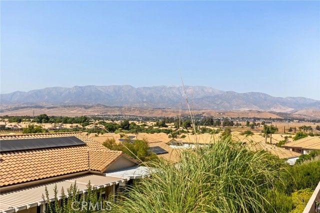 Situated on a 6,500 square foot view lot is where you will find this beautifull appointed home behind the gates in Sun Lakes Country Club, a 55+ golf community where residents enjoy convenient access to recreational amenities and scenic surroundings at the gateway to the Coachella Valley. This Sunflower floor-plan features 2 bedrooms (private suites), 2.5 baths, office/den, laundry room, formal living/dining room, and an open-concept kitchen adjacent to the family room with fireplace. As you enter through the etched glass front door, you immediately notice the quality finishes and upgrades that include impressive crown molding, a newer A/C unit and fresh interior paint. The living and dining room area provide a comfortable airy place to gather surrounded by stylish ladder custom blinds at the windows. An ample size office provides privacy with double etched glass door and could also be used as an art studio or craft room. The spacious kitchen features numerous cabinets, plenty of counter space, breakfast area for everyday dining, and a kitchen island wrapped in decorative stone allowing the stainless steel appliances to pop. This amazing kitchen is open to an intimate family room that shares incredible views of the San Gorgonio mountians and valley. The family room also adorns a stone gas fireplace with oversized hearth, ceiling fan and stylish ladder custom blinds. The guest bathroom presents granite counter tops on the polished bathroom vanity, and guaranteed to impress any quest. After a long day, a sophisticated primary bedroom with french doors awaits you. This wonderful bedroom provides plenty of natural lighting, ceiling fan and wood flooring which adds a sense of warmth. The attached bathroom with separate shower/bathtub, double sink vanity and private toilet room are highlighed by an oversized walk-in closet. The roomy guest ensuite provides privacy and comfort with an attached full bathroom. The dedicated laundry room has direct access to the 2 car garage with room for a golf cart as well. Step into the backyard and the fabulous views of the pass, mountians and valley are undoubtedly the focal point in this low-maintenance yard with an alumawood patio cover. The specific viewing area in this backyard will soon become your favorite place at sunrise or sunset. The attached solar panels are completely paid for and add to the value of this dazzling home. Come visit the Sun Lakes lifestyle and this beautifully maintained home today!