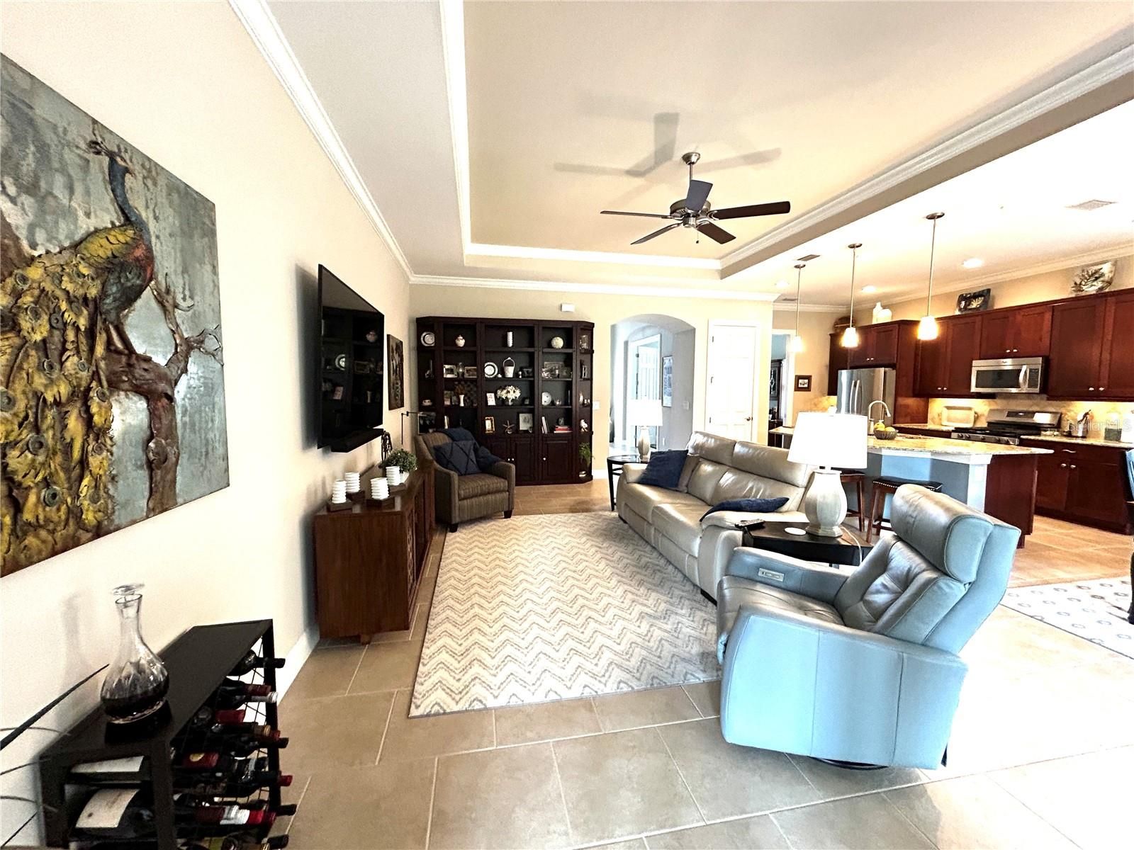 - Ceiling Fan(s), Crown Molding, High Ceilings, Kitchen/Family Room Combo, Tray Ceiling(s), Window Treatments